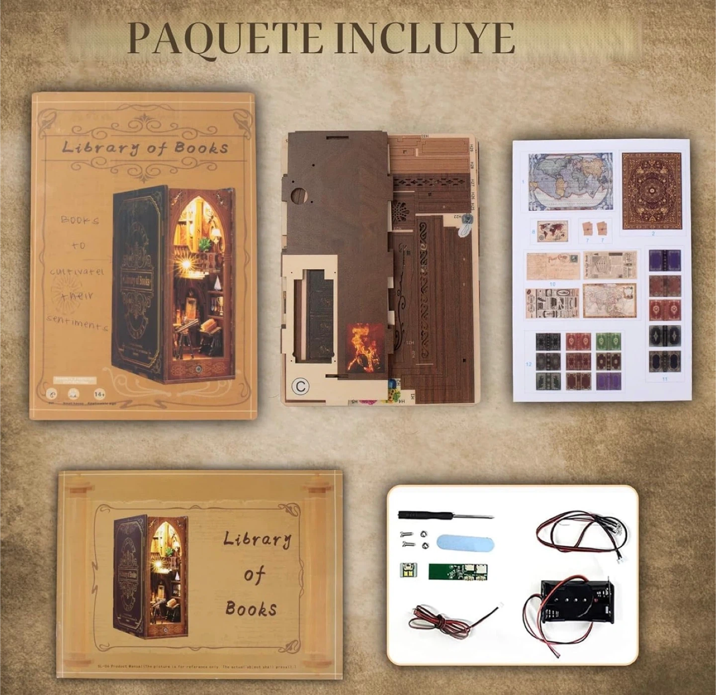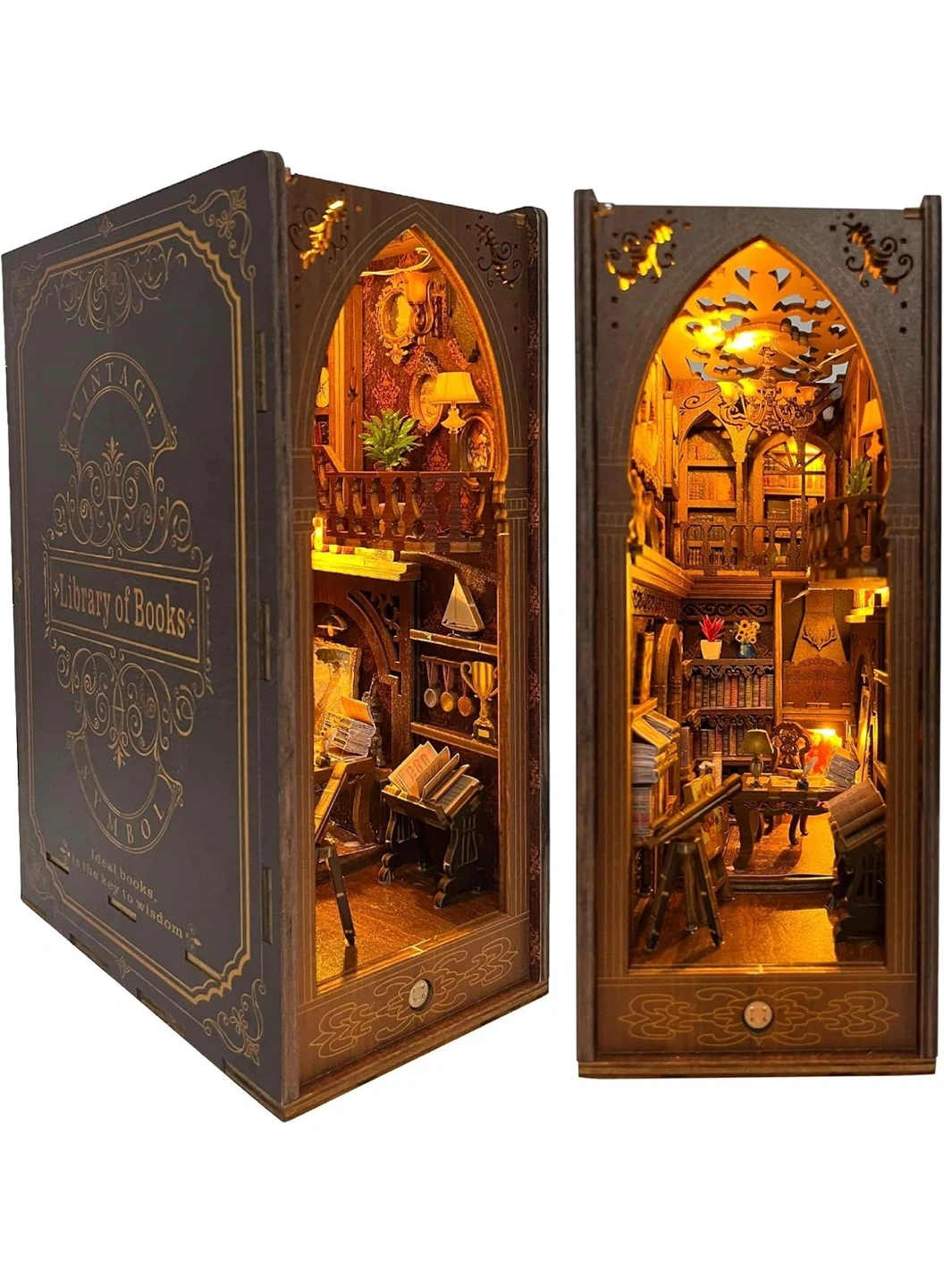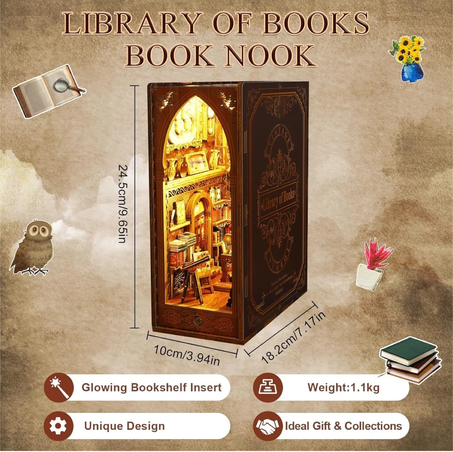 This is a charming 'Library of Books' book nook diorama kit. It features a glowing bookshelf insert with intricate details. The kit is made from wood, plastic, and metal materials. It's an ideal gift and collectible for book lovers!