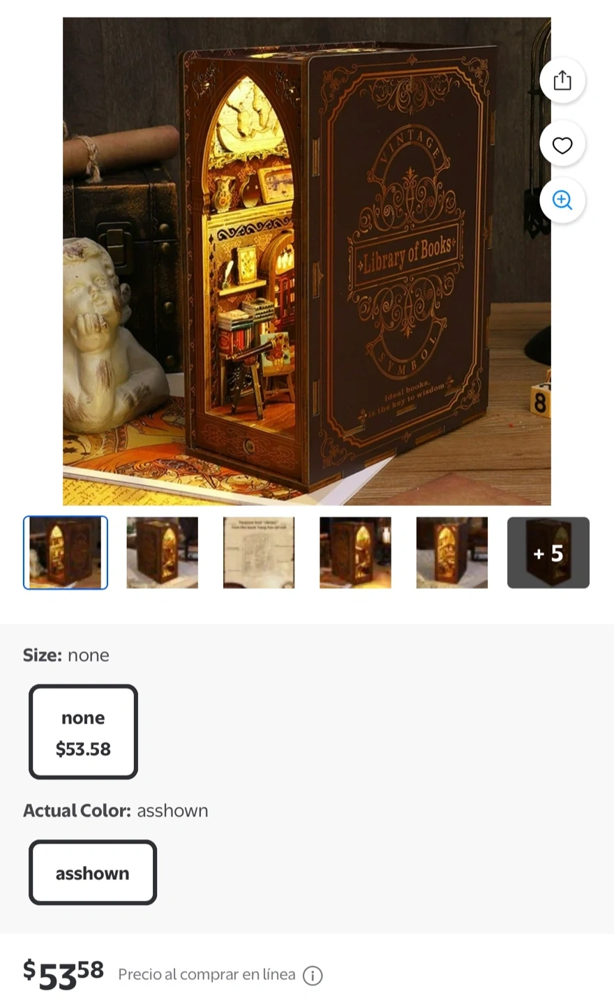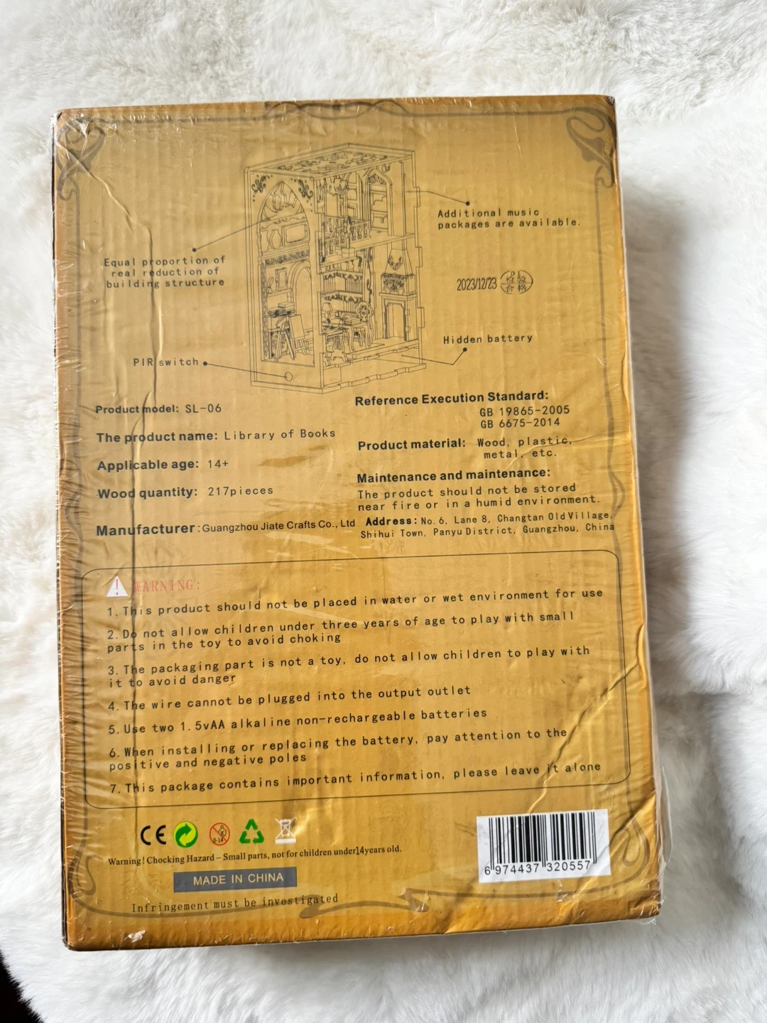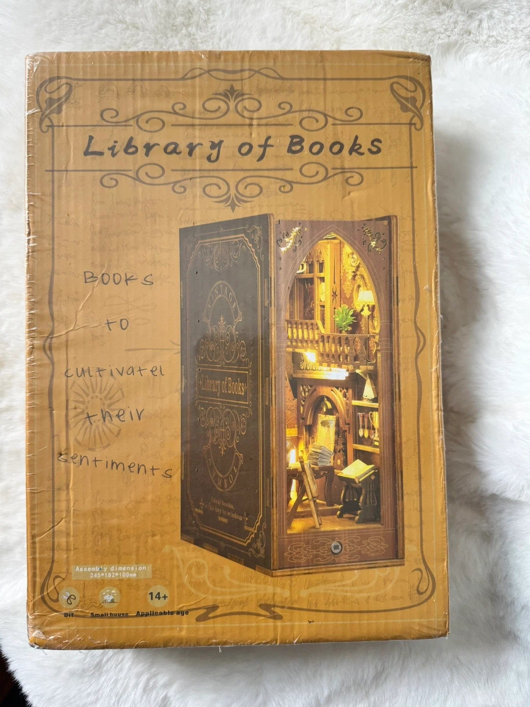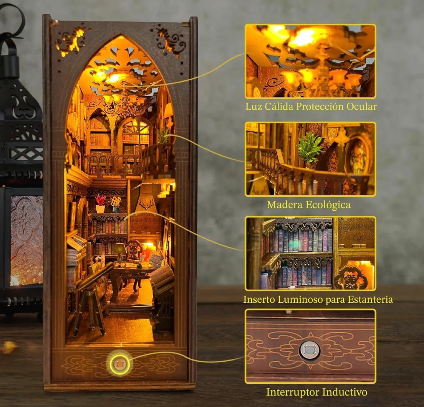 This is a charming 'Library of Books' book nook diorama kit. It features a glowing bookshelf insert with intricate details. The kit is made from wood, plastic, and metal materials. It's an ideal gift and collectible for book lovers!