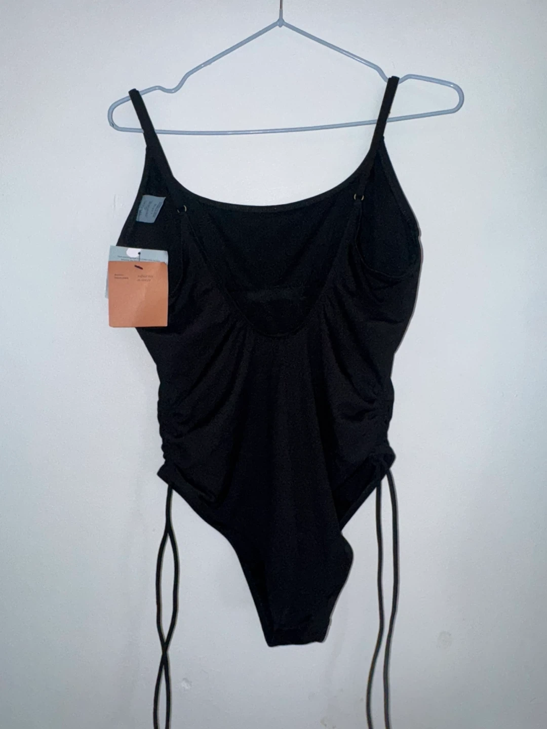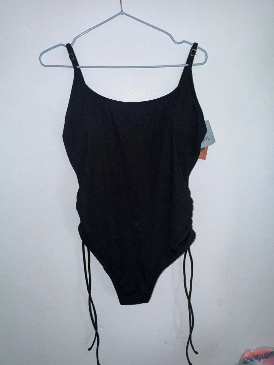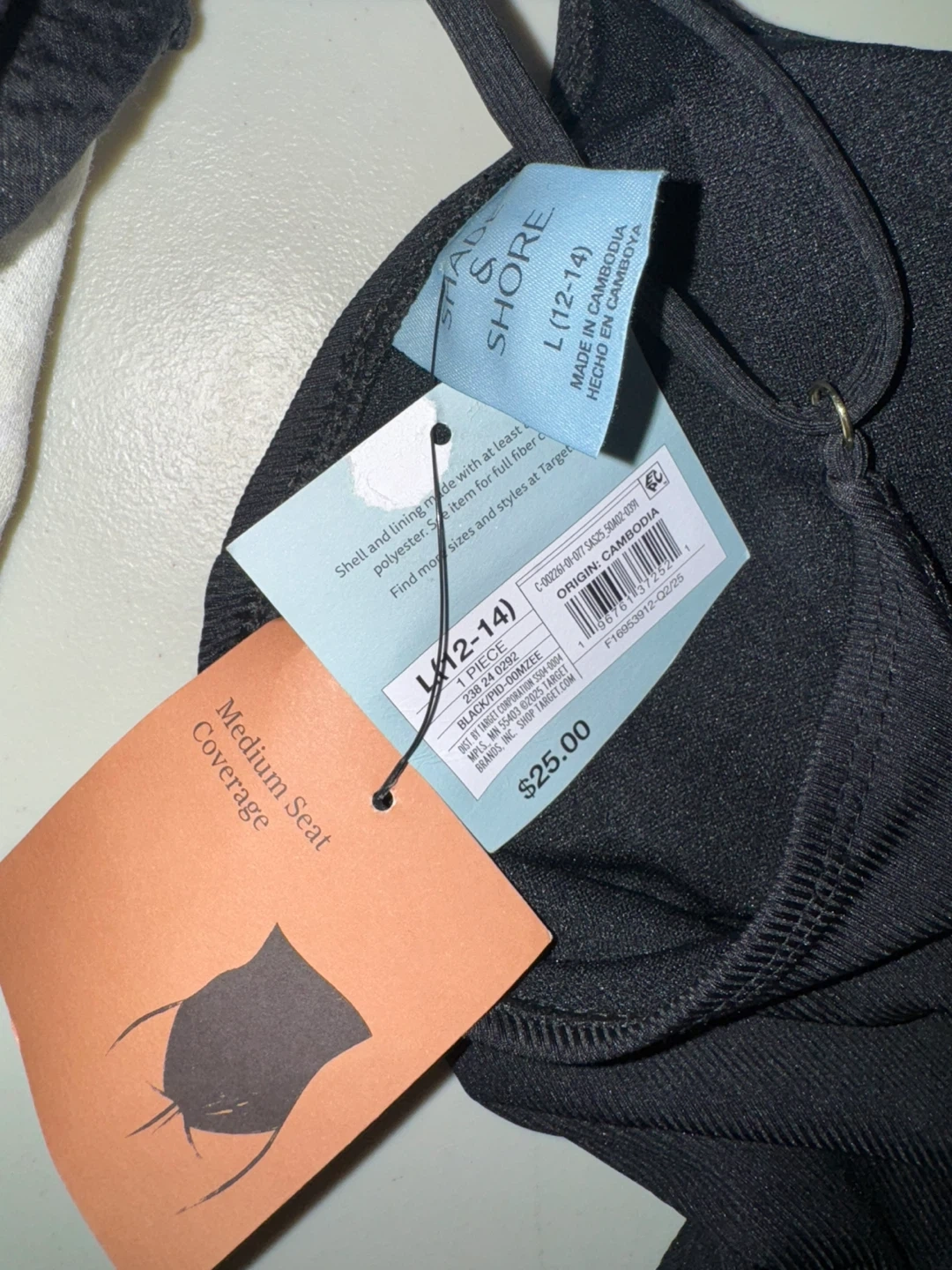 This is a black one-piece swimsuit from Shade & Shore. It's a women's size L and features medium seat coverage. The swimsuit is made with a polyester blend and has adjustable straps and ruched sides.