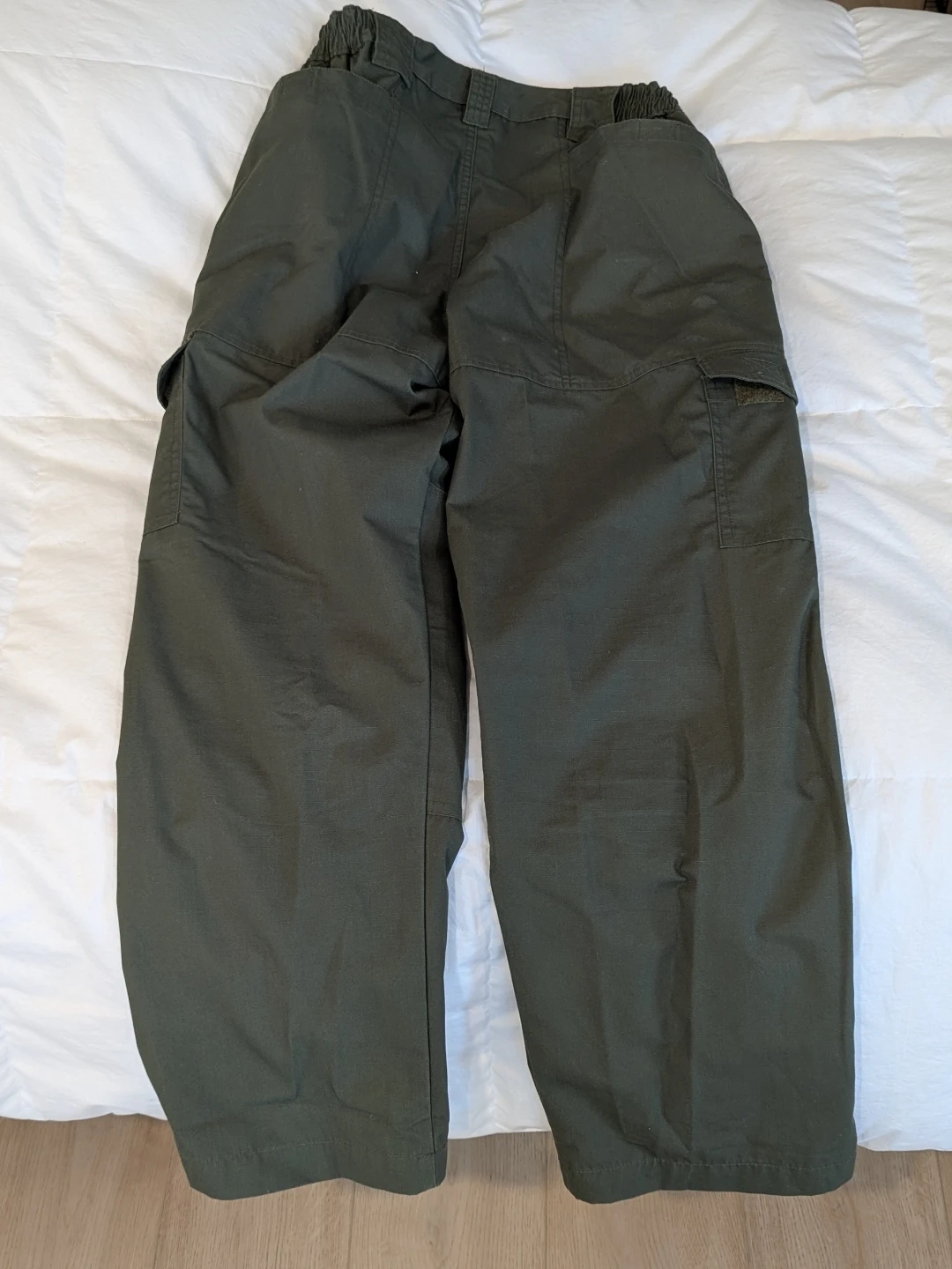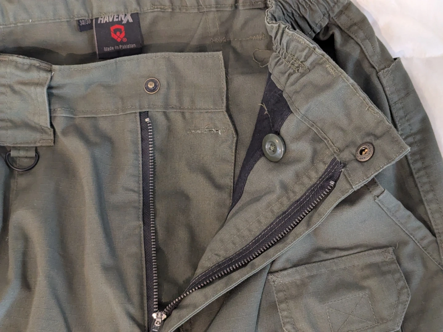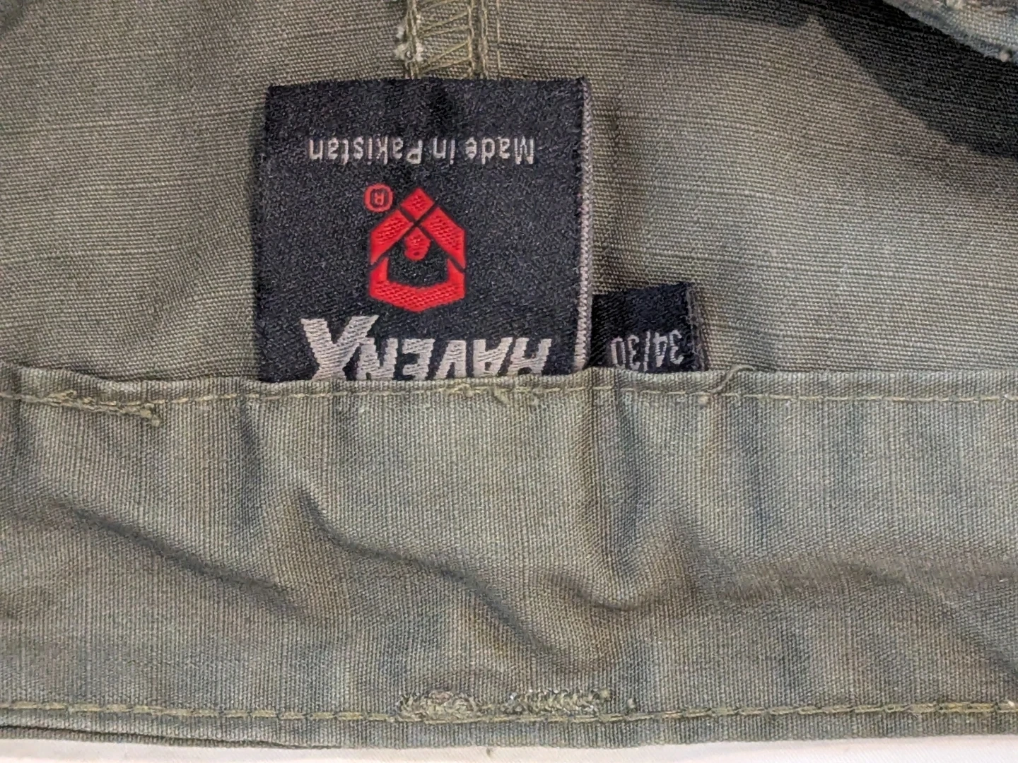 These cargo/army pants are in an olive green colour. They feature an elastic waistband and multiple cargo pockets with velcro closures. Made in Pakistan. Size 34/30.