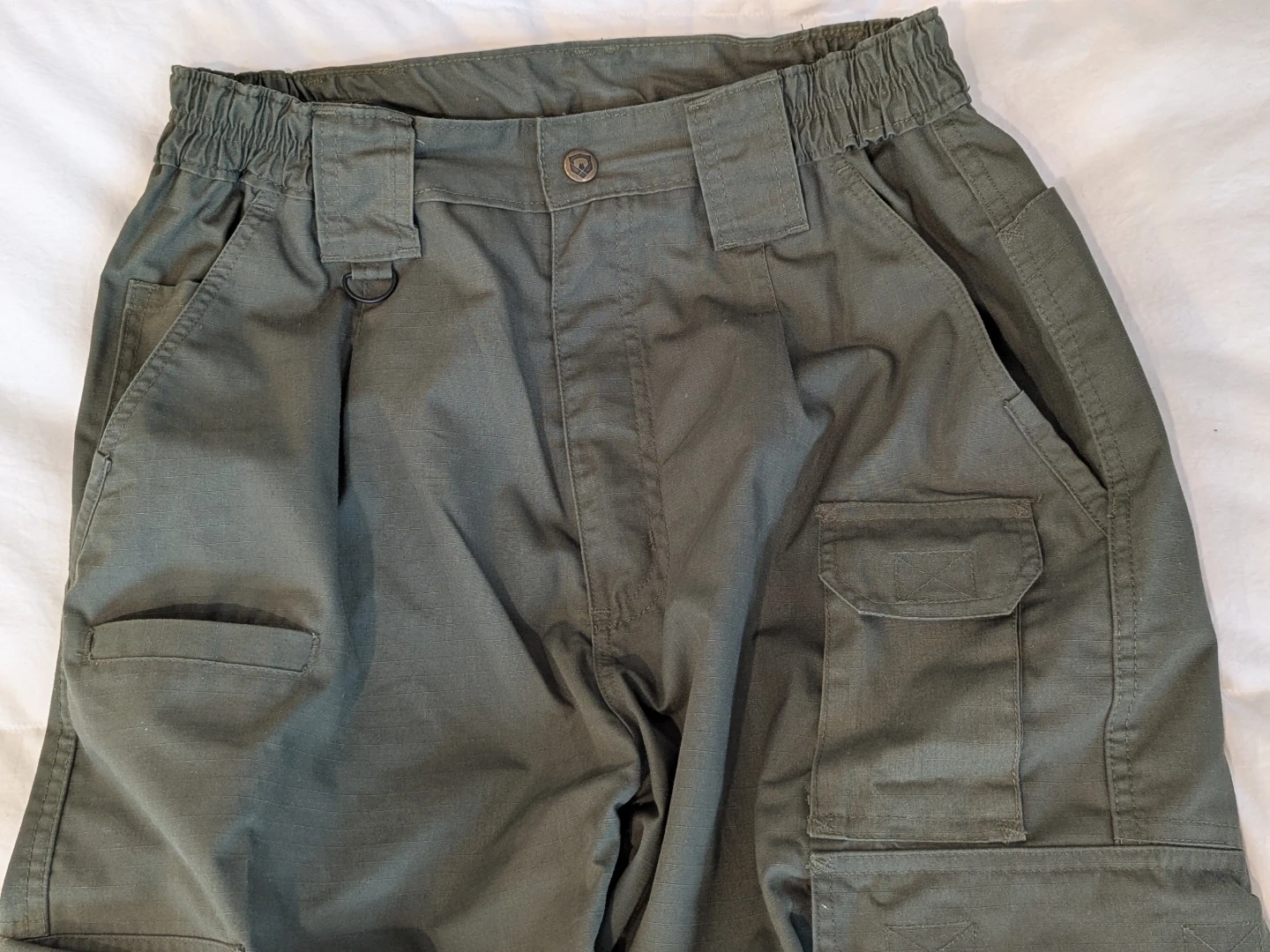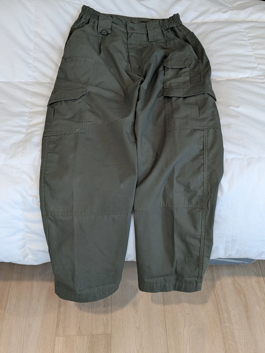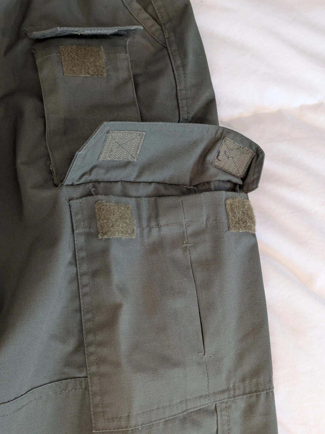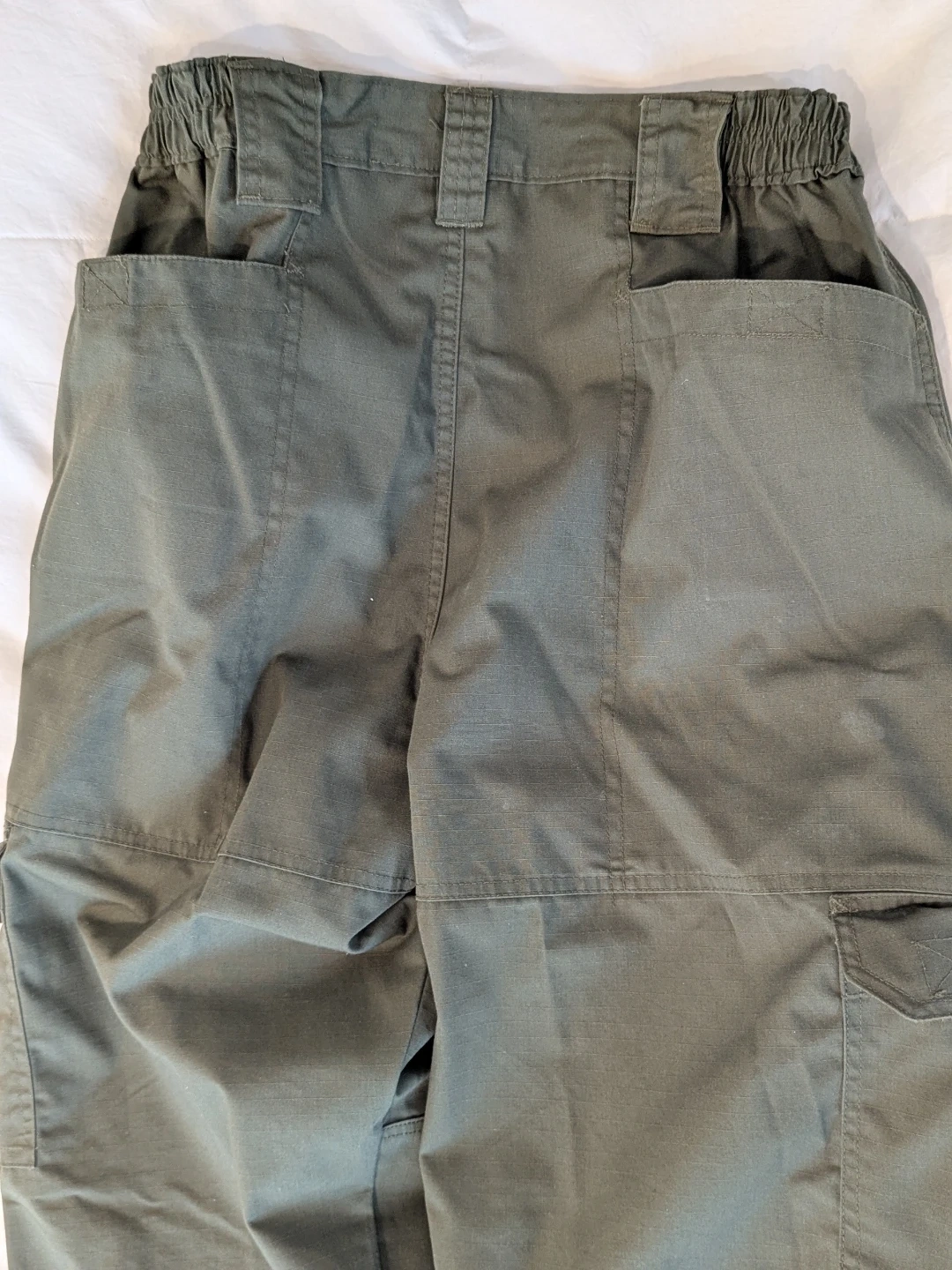These cargo/army pants are in an olive green colour. They feature an elastic waistband and multiple cargo pockets with velcro closures. Made in Pakistan. Size 34/30.
