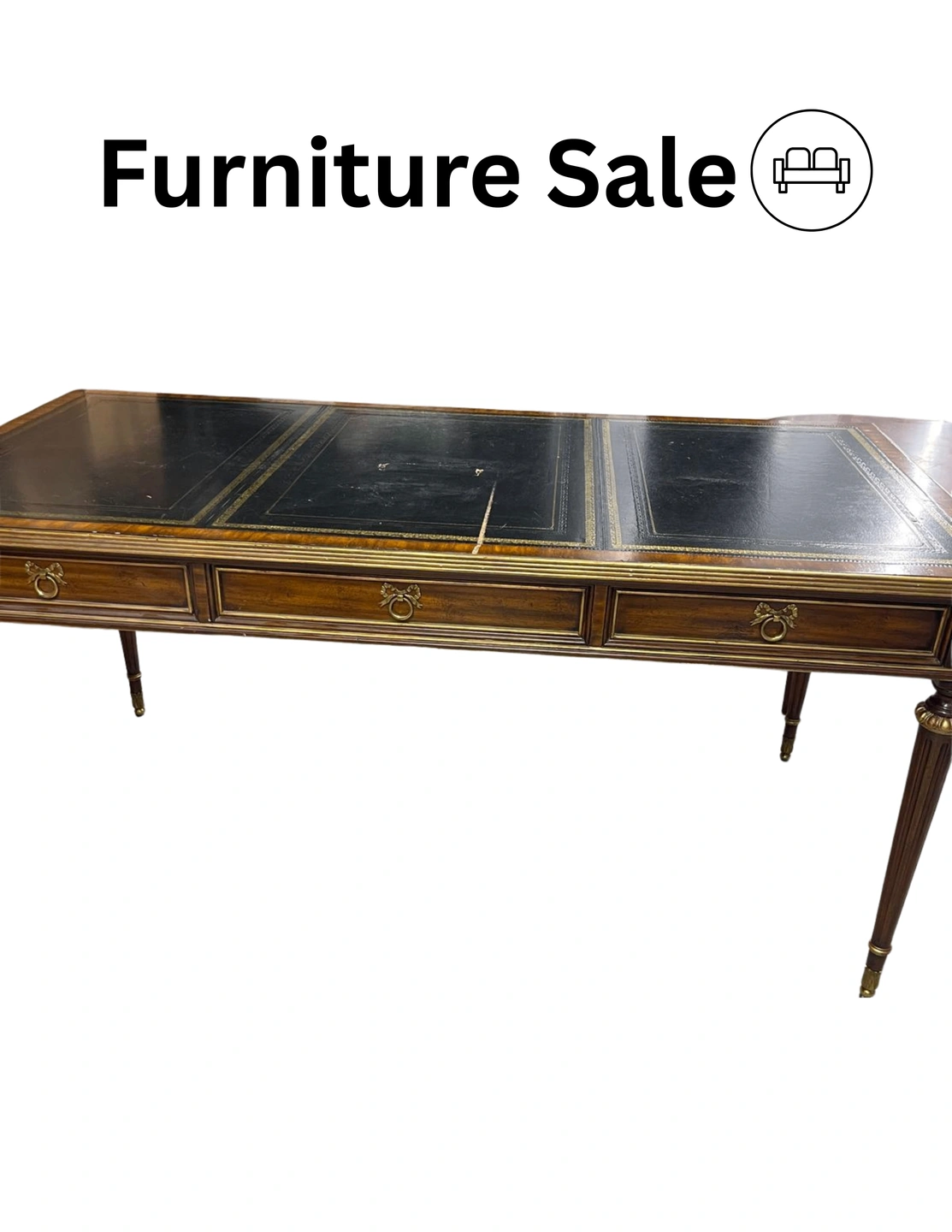 Elegant mahogany writing desk featuring a black leather writing surface with gilt detailing, brass ring pulls, and refined tapered legs with brass feet. A classic, English-inspired design with generous drawer storage.