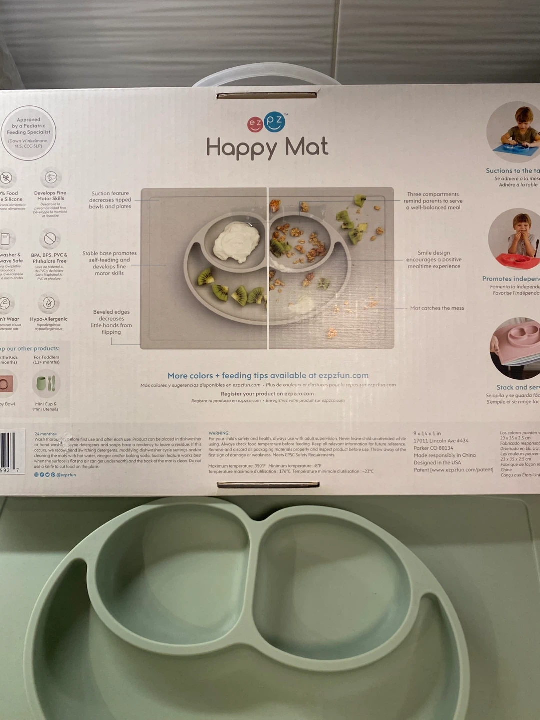 This is an ezpz Happy Mat, a placemat and plate in one. It suctions to the table to prevent tipping and has three compartments. It's made from 100% food-grade silicone.