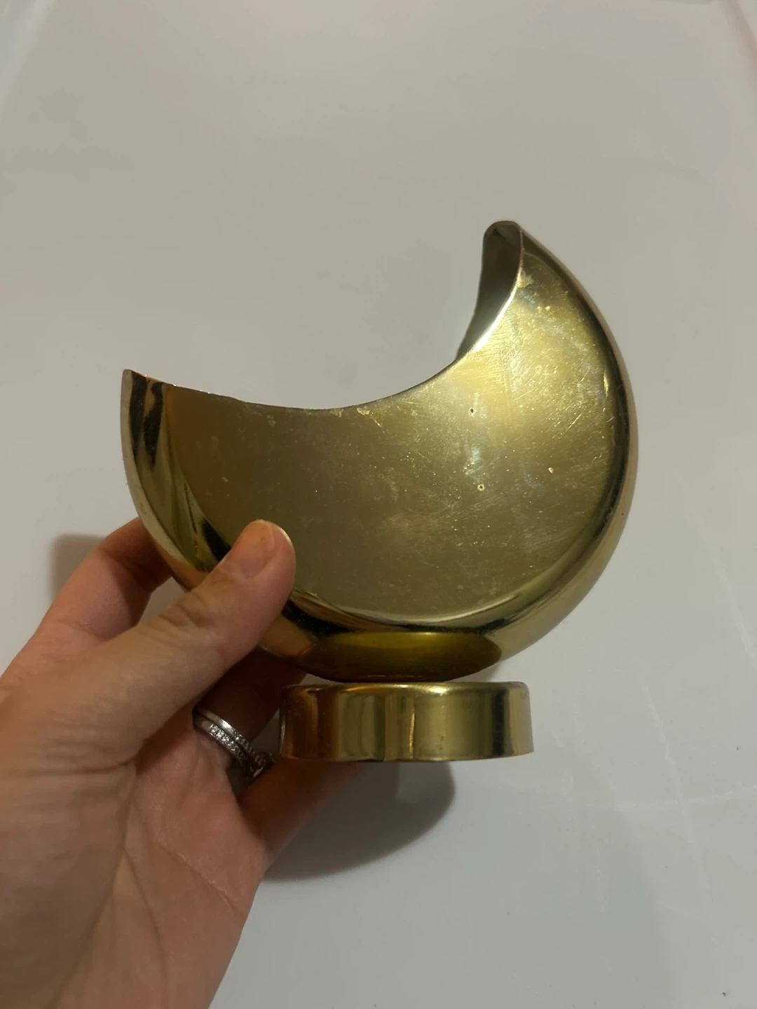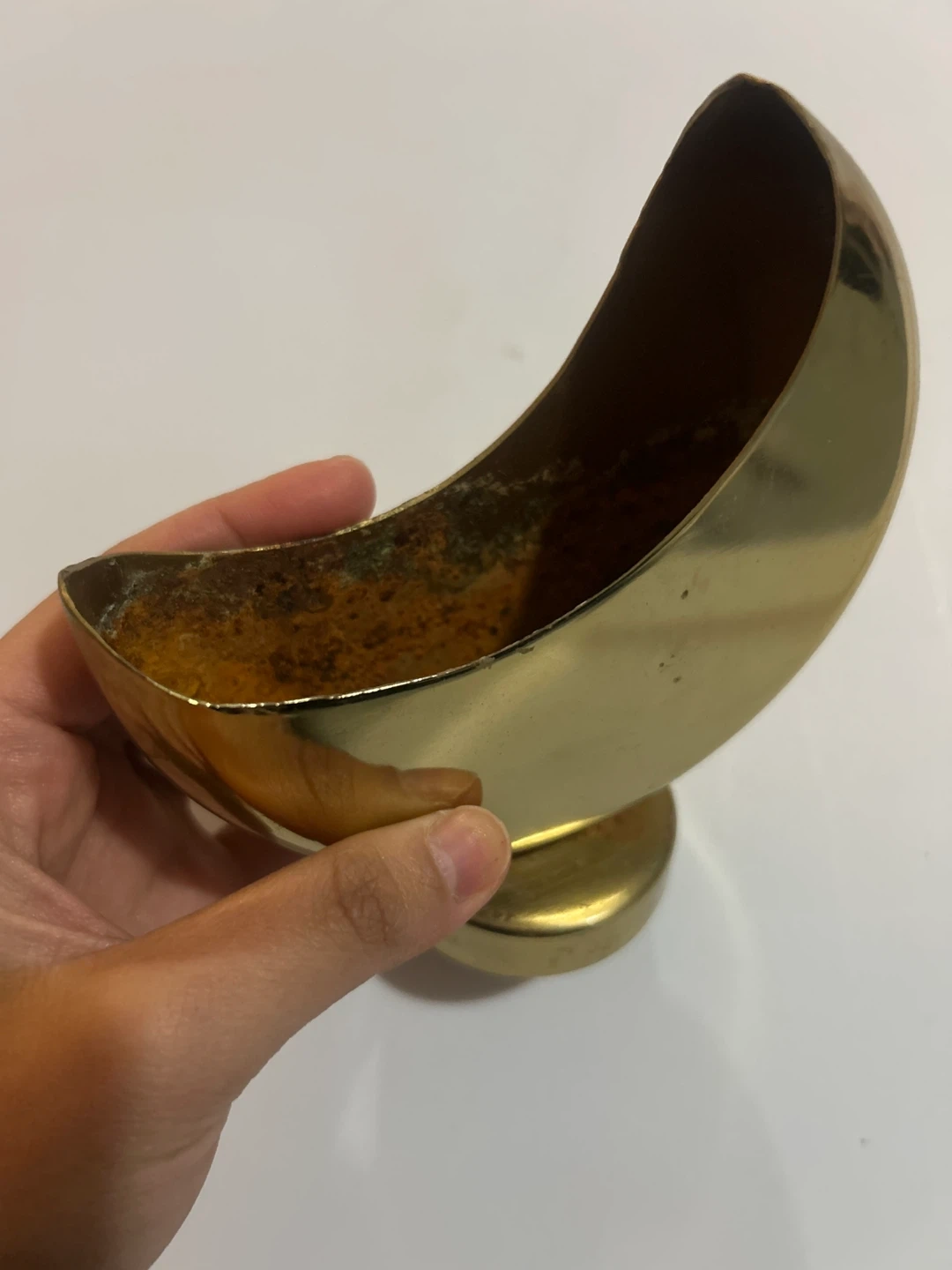 A unique decorative bowl with a crescent moon design. Made of brass, it has a beautiful golden sheen. It's perfect for holding small trinkets or as a standalone decorative piece. With rusting inside.