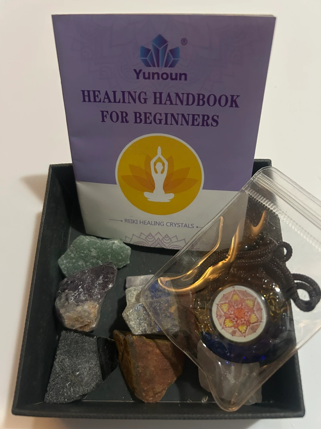 This Yunoun set includes a collection of healing crystals along with a necklace and a beginner's handbook. It's designed for anyone interested in exploring the benefits of crystals.
