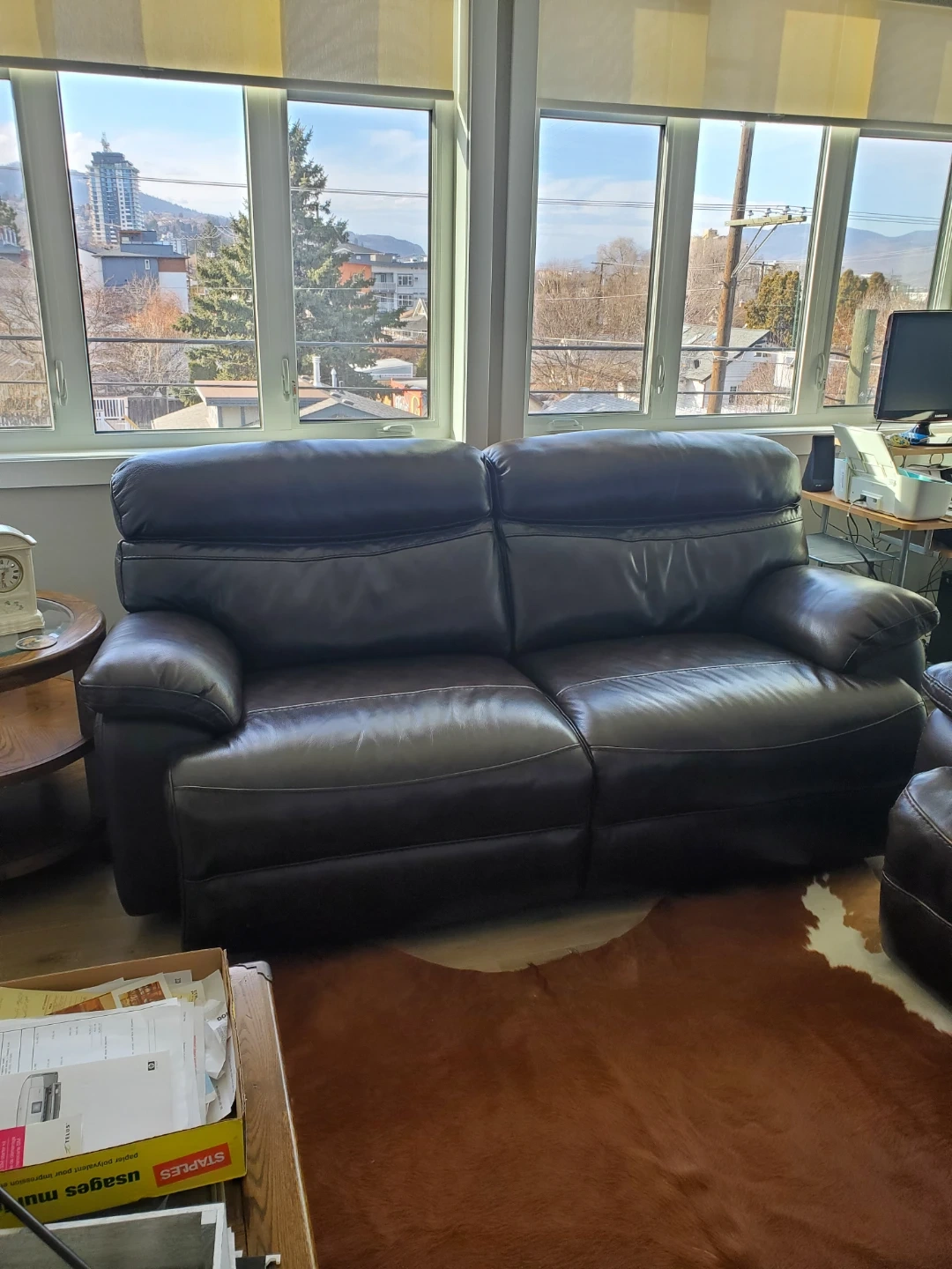 This is a really comfortable 100% leather loveseat sofa. It's upholstered in rich leather and features plush cushioning for extra comfort. The two-seater design makes it a great addition to a living room or den. Both seats are electric recliners.