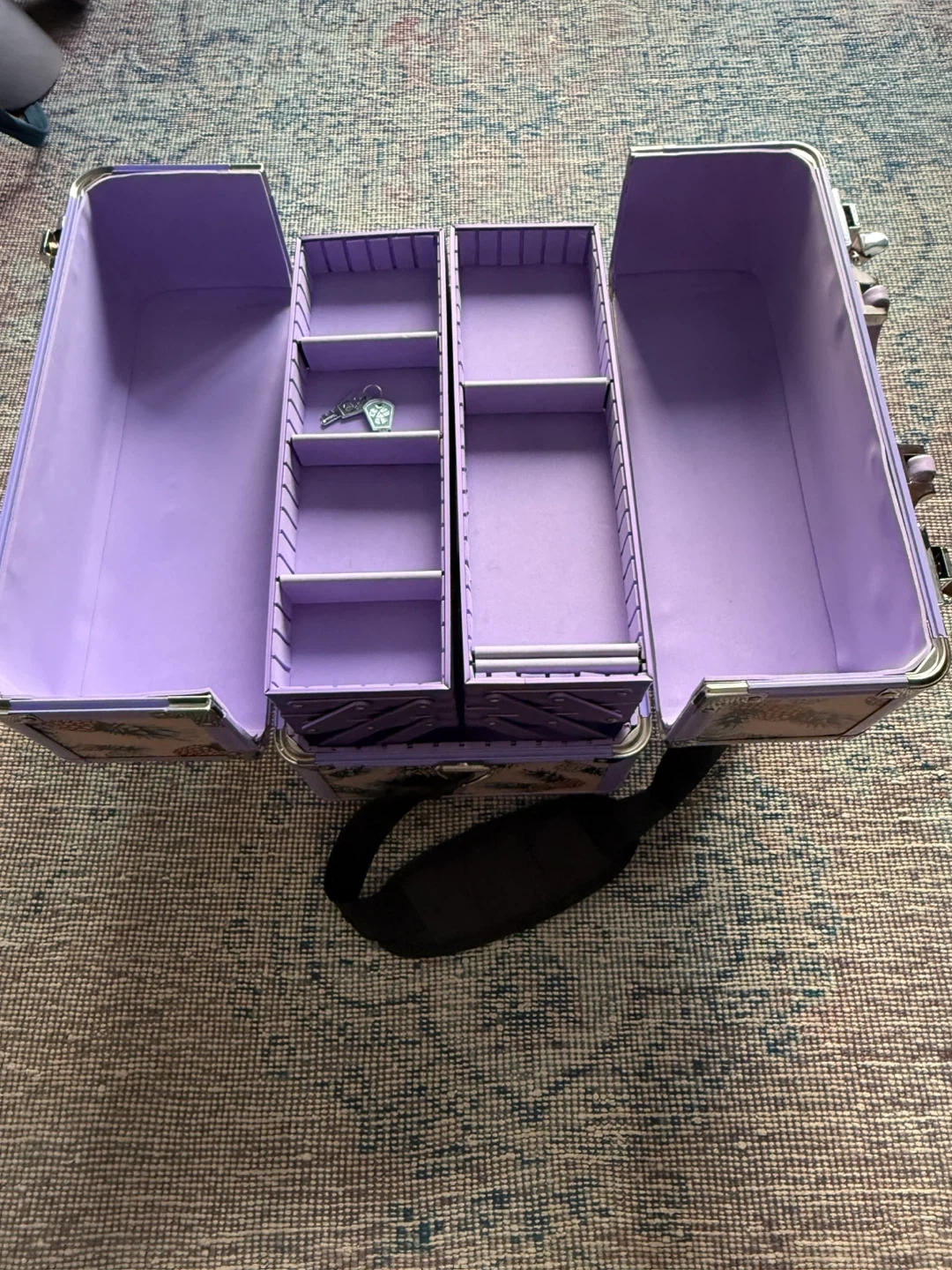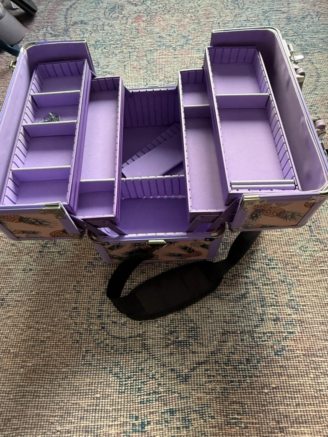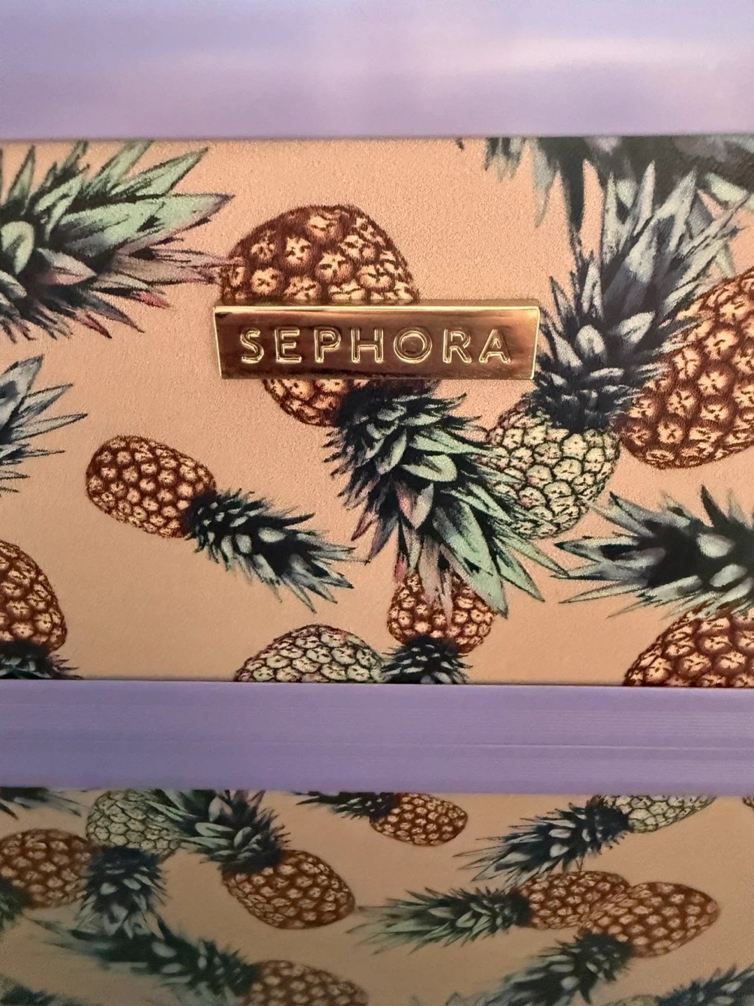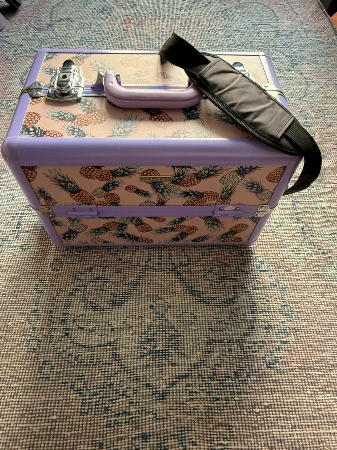 This Sephora train case features a fun pineapple print and a lavender interior. It has multiple compartments and a detachable shoulder strap for easy carrying. Perfect for organizing makeup or other small accessories! It has been used but still in great shape