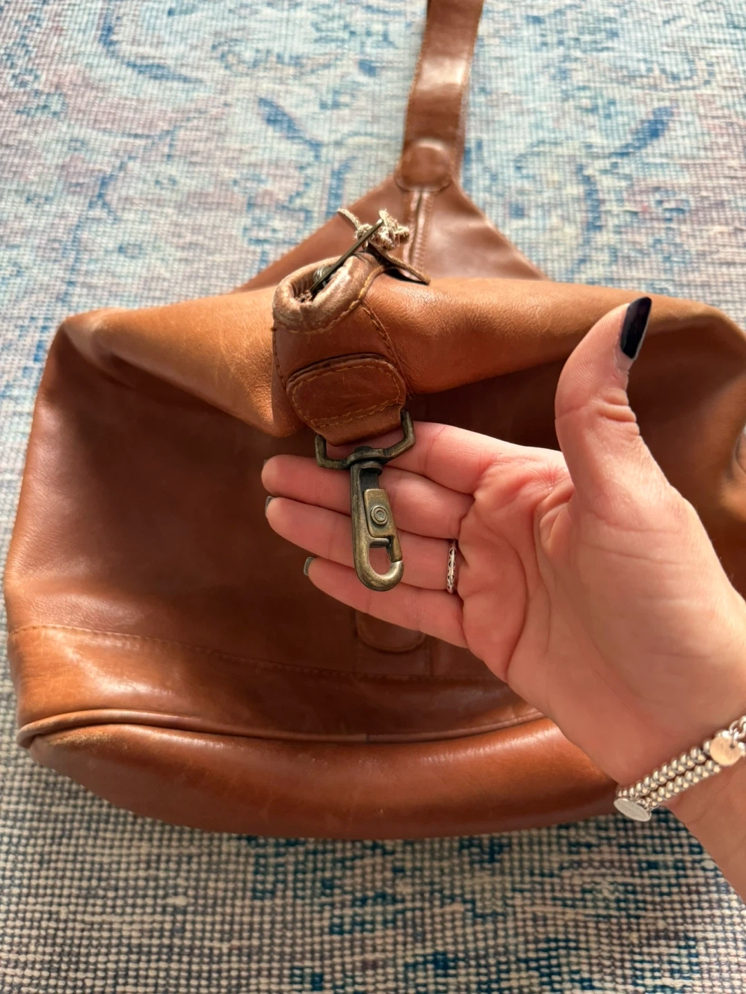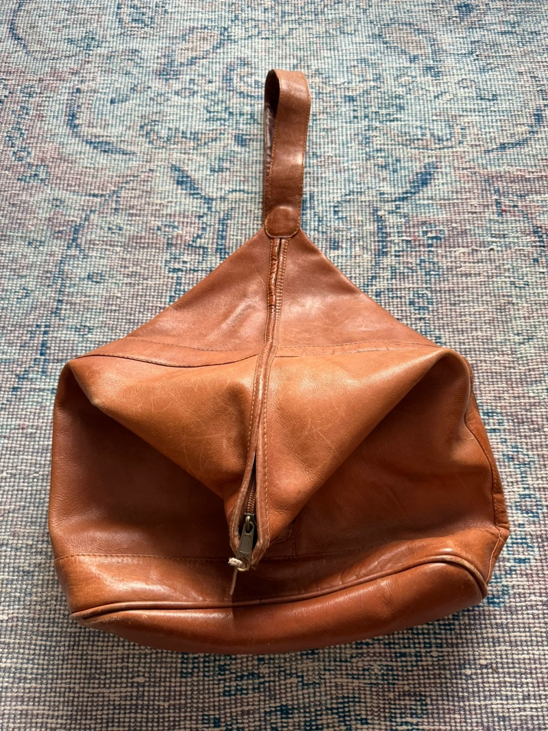 A stylish brown leather shoulder bag. It's made of genuine leather and has a spacious interior with a zipper closure. This bag is perfect for everyday use. It is a vintage piece and has been well loved