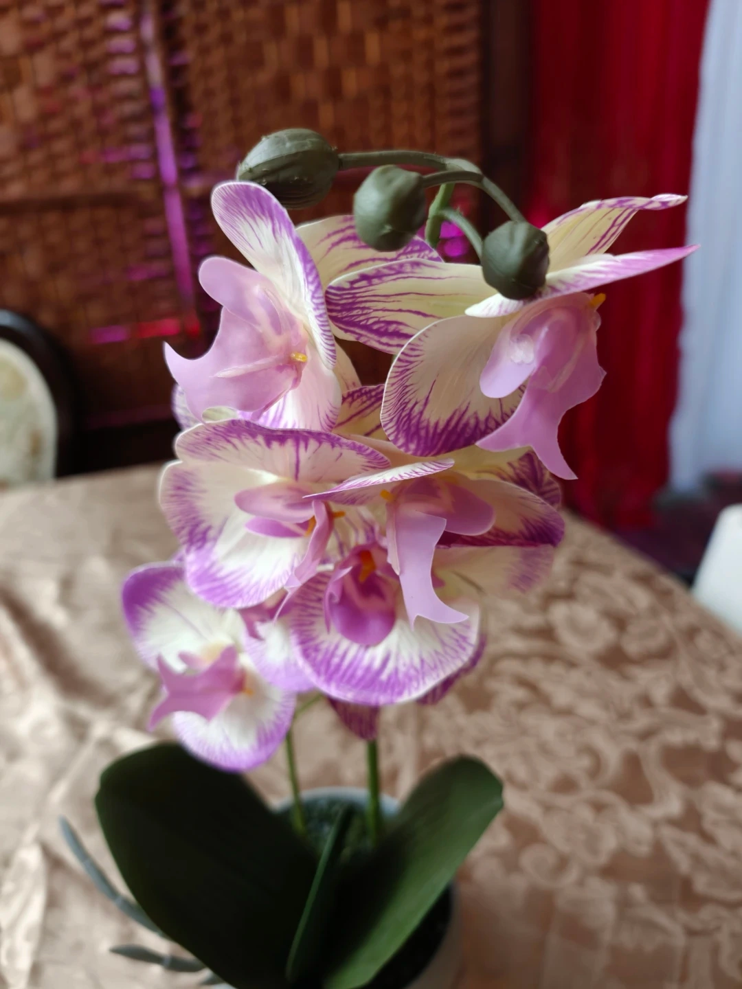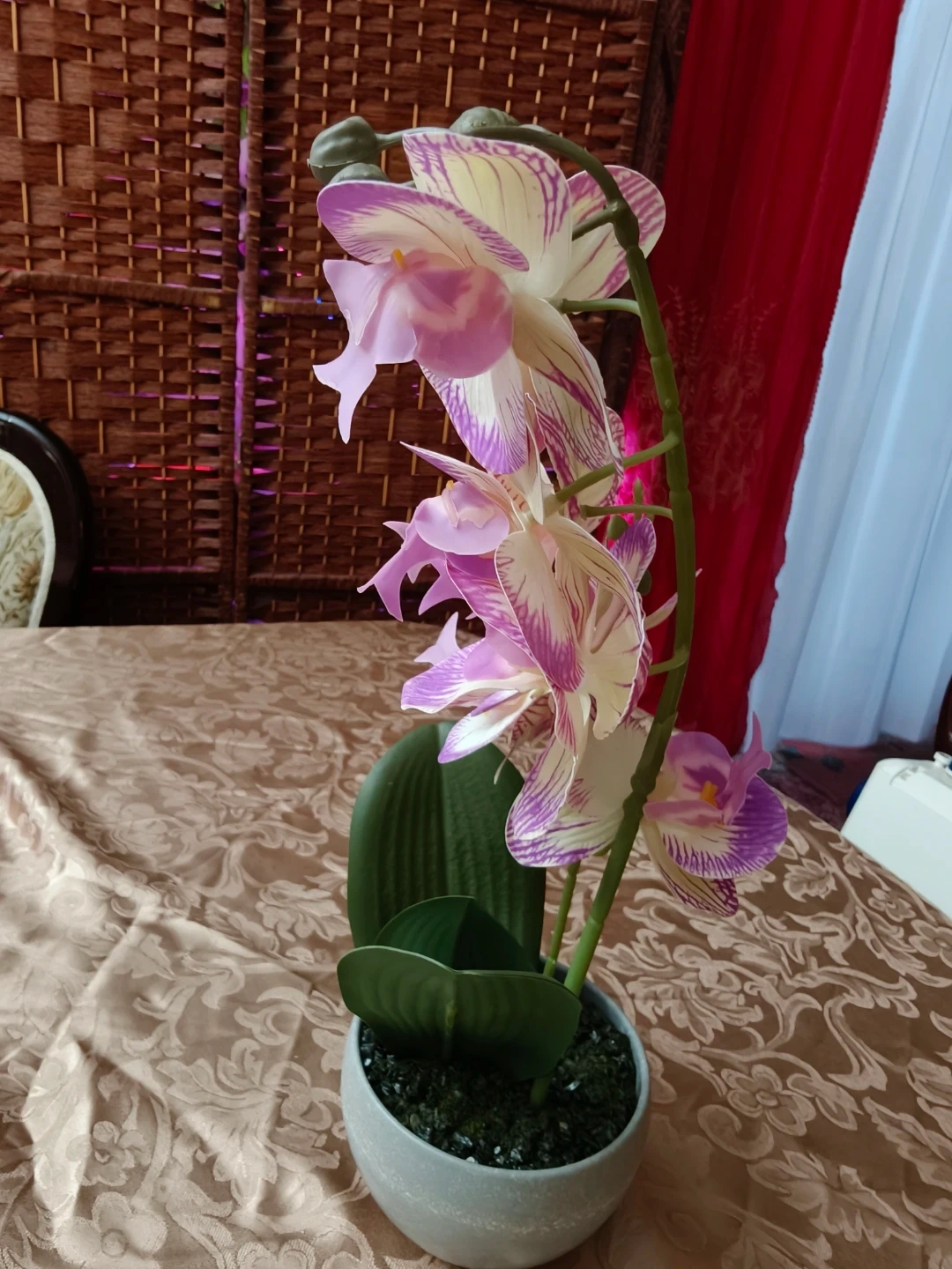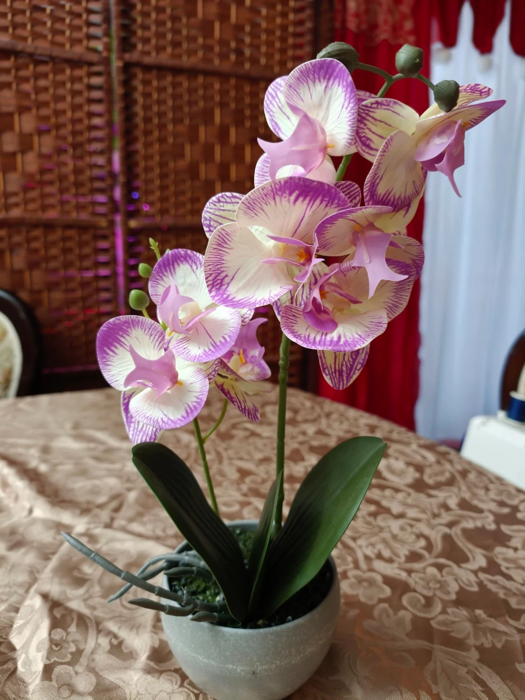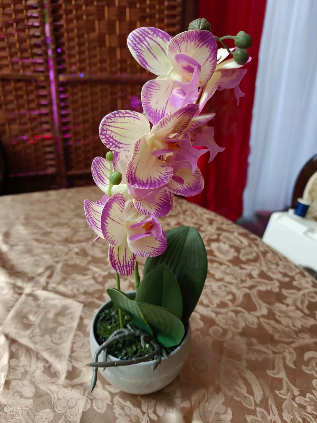 This artificial orchid plant features delicate pink and white petals with purple accents. It's potted in a grey ceramic-style container with faux greenery and moss. It's a lovely decorative piece for any home or office.