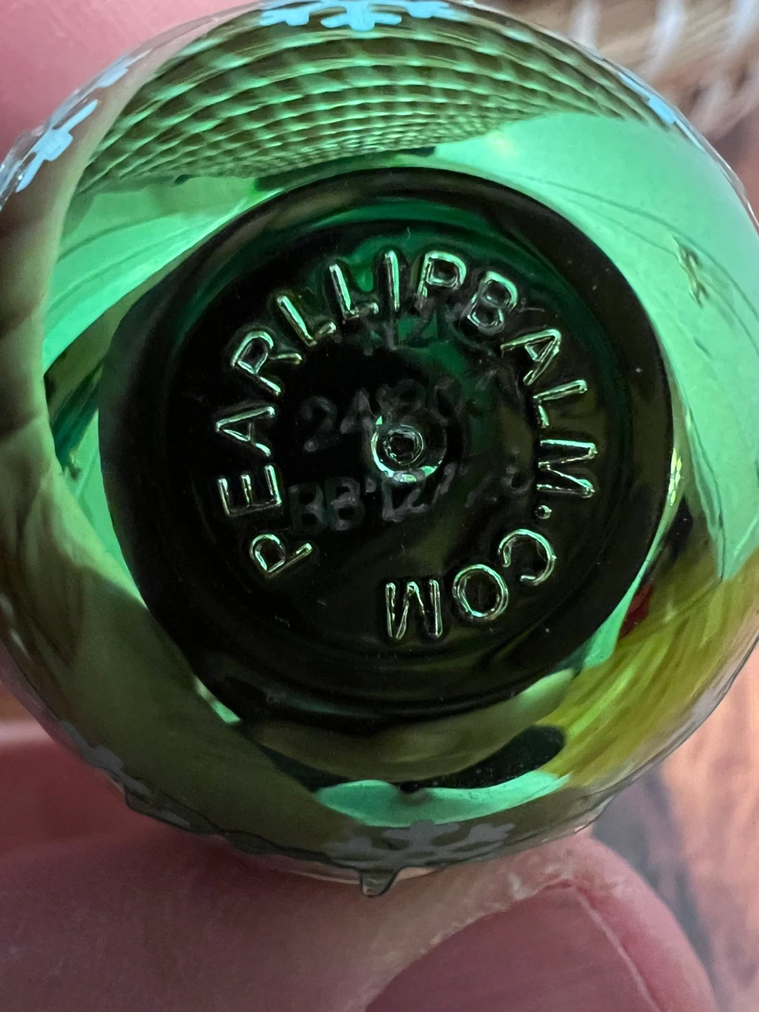 This is a sealed, unopened green, holiday-themed lip moisturizer with snowflake designs. Apply generously to moisturize lips.