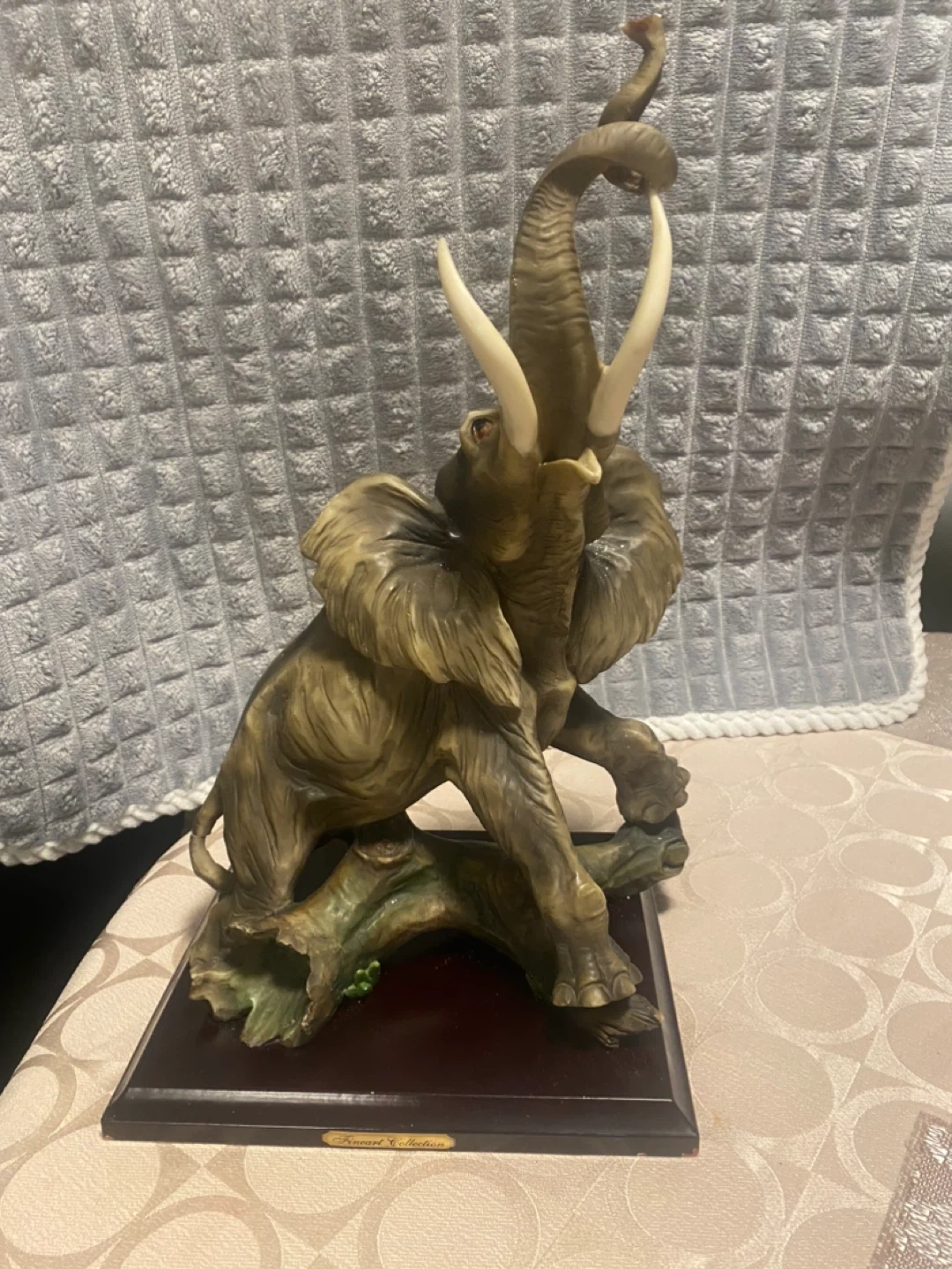 A detailed elephant figurine, likely made of resin, with tusks and a dark wood base. It's sculpted in a dynamic pose with its trunk raised. This piece would make a striking addition to any display shelf.