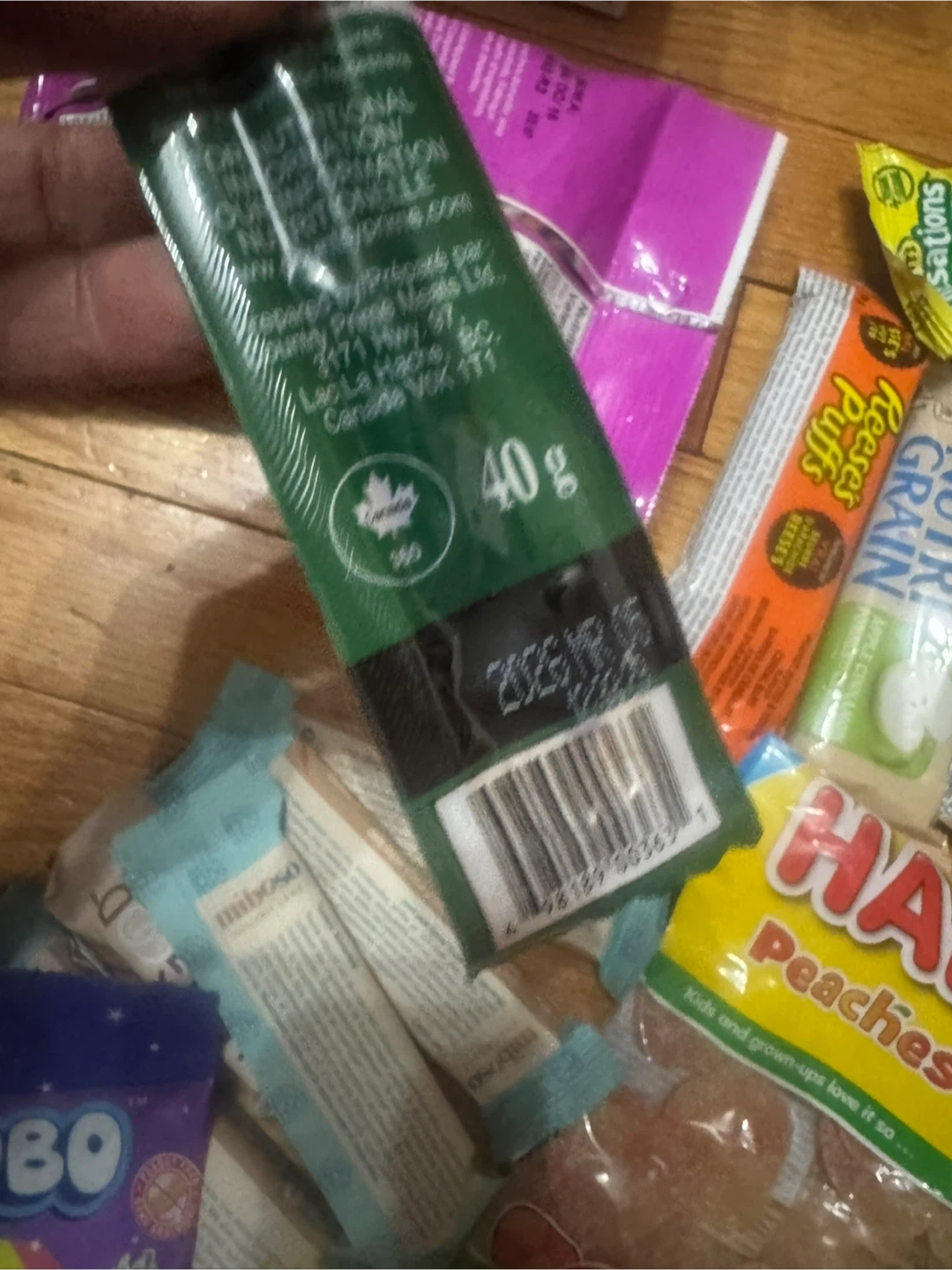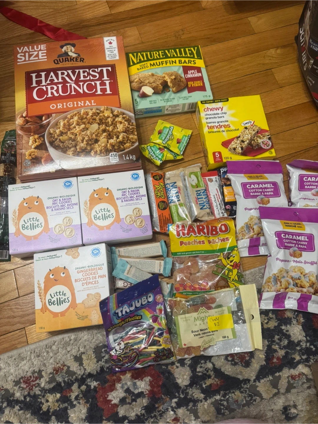 A variety of snack items including granola bars, candies, and biscuits. Some items have best before dates in 2025. Includes Nature Valley, Haribo, Little Bellies, Tajubo, and other brands.