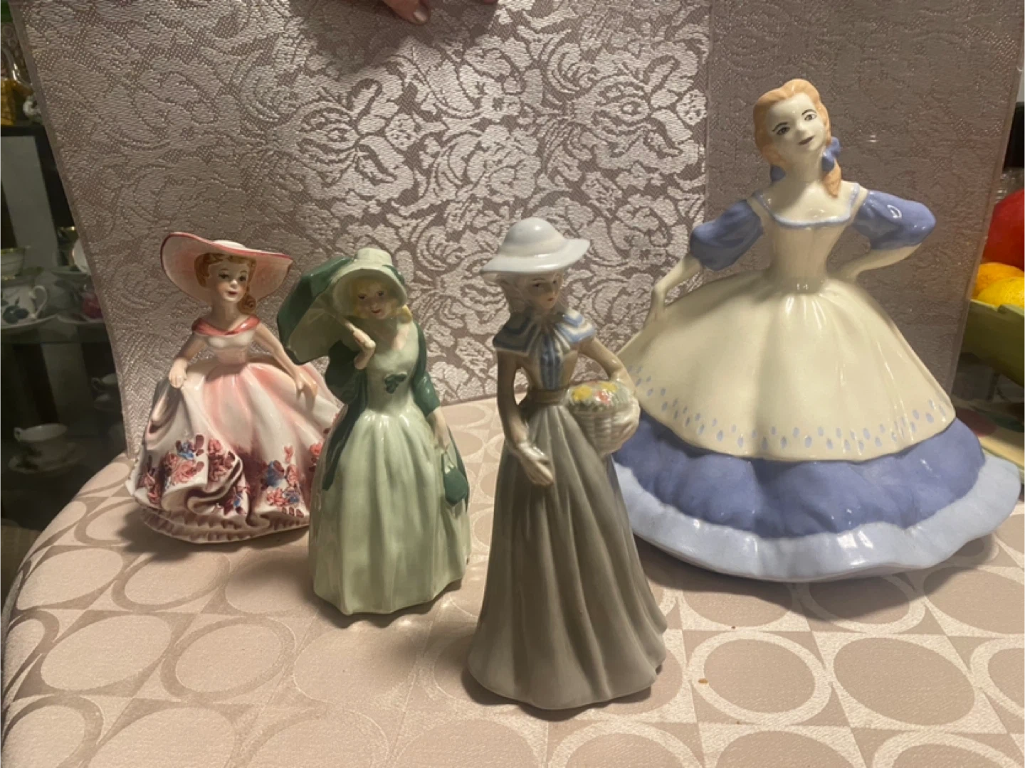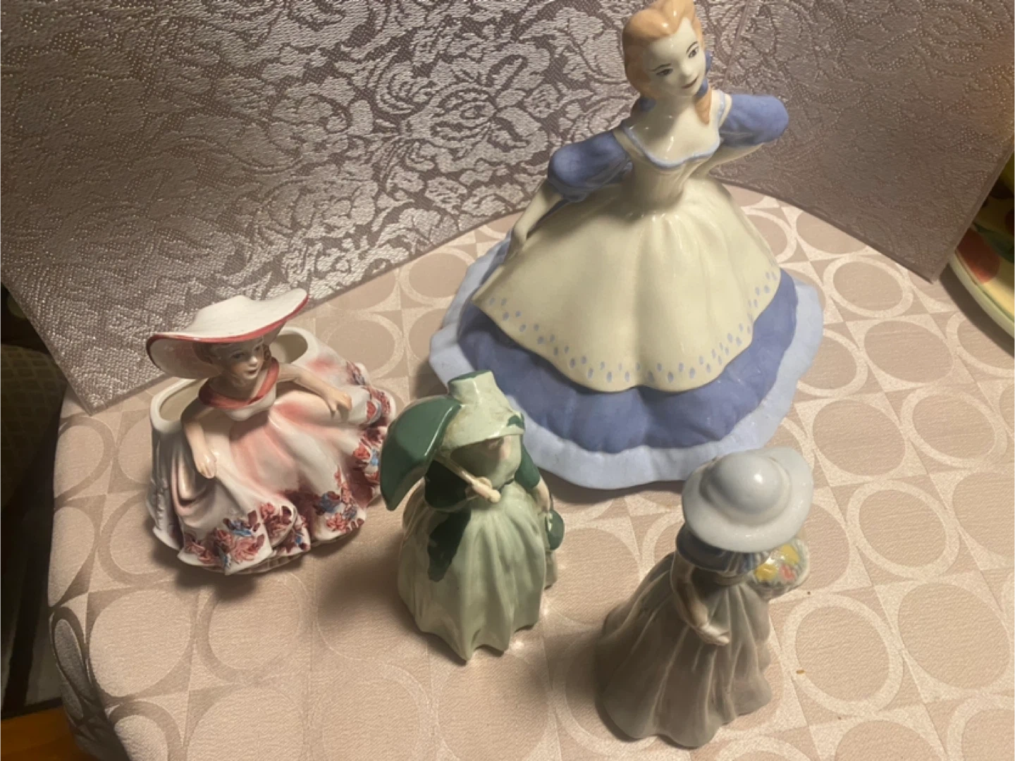 This collection includes four decorative ceramic figurines of women in vintage dresses. Each piece displays intricate detailing and is finished with a smooth glaze. They're perfect for display on shelves or mantels.