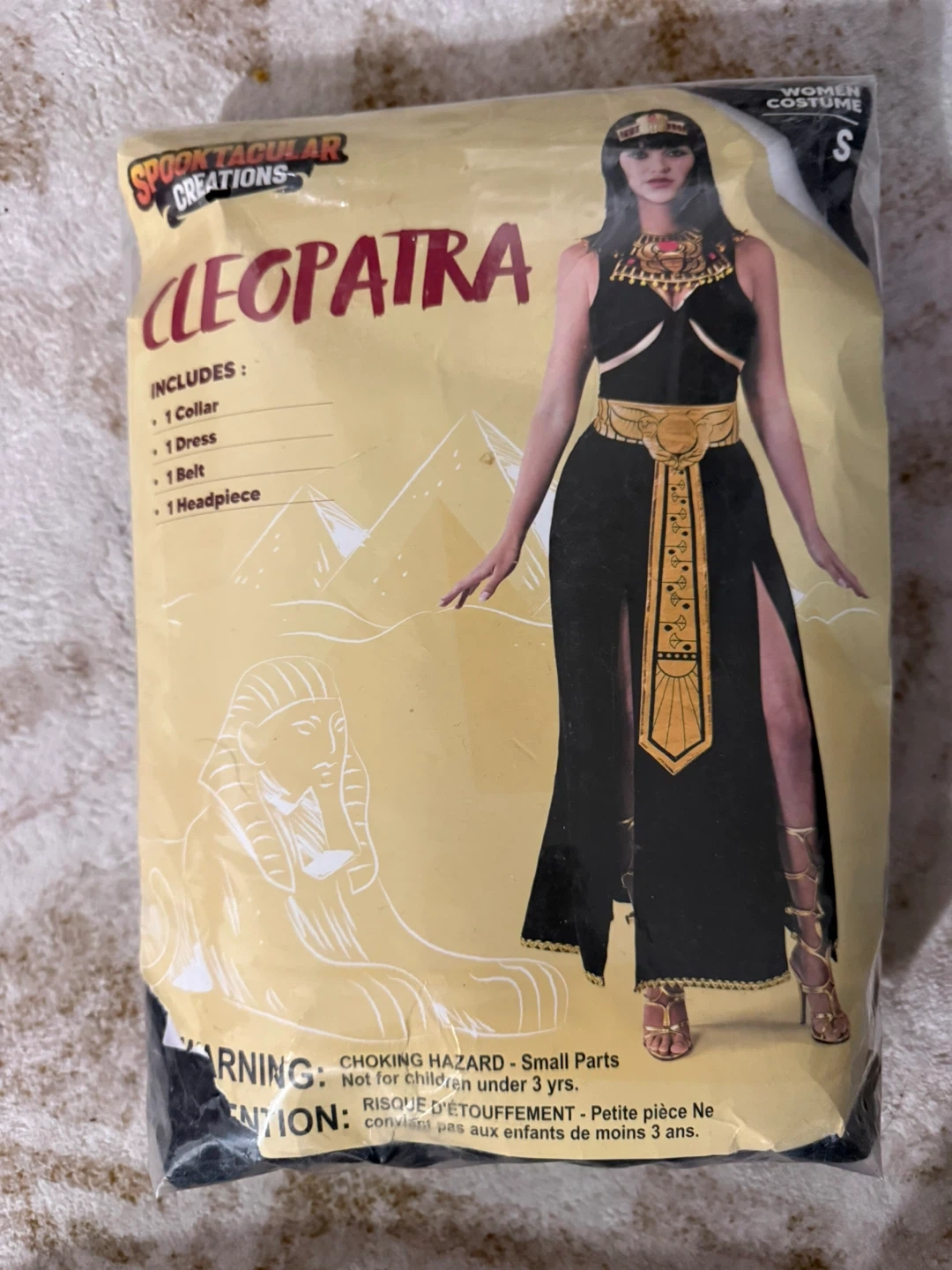 This Cleopatra costume set includes a dress, collar, belt, and headpiece. It's a size small and perfect for costume parties or Halloween events! The black velvet dress has gold trim details.