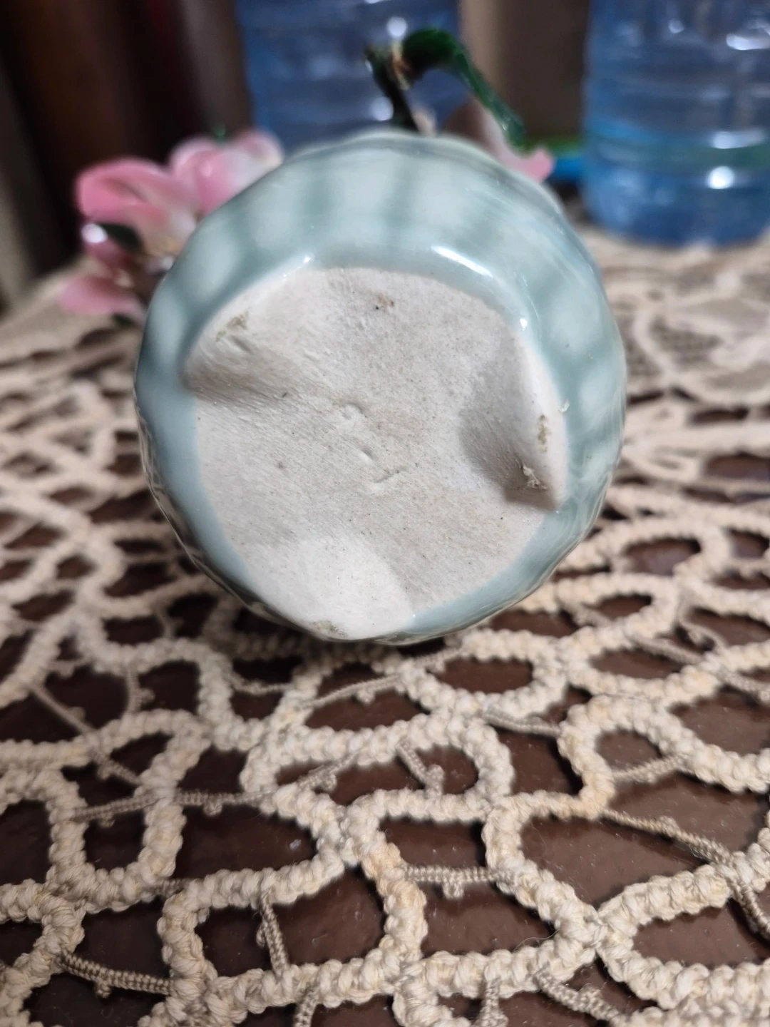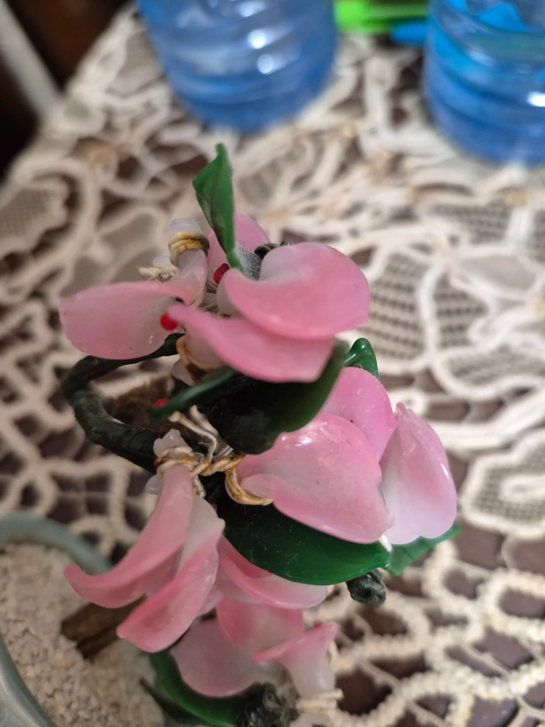 This decorative bonsai tree features delicate pink jade or glass flowers and green leaves. It sits in a small, pale blue ceramic pot filled with sand. It's a pretty accent piece for any space!