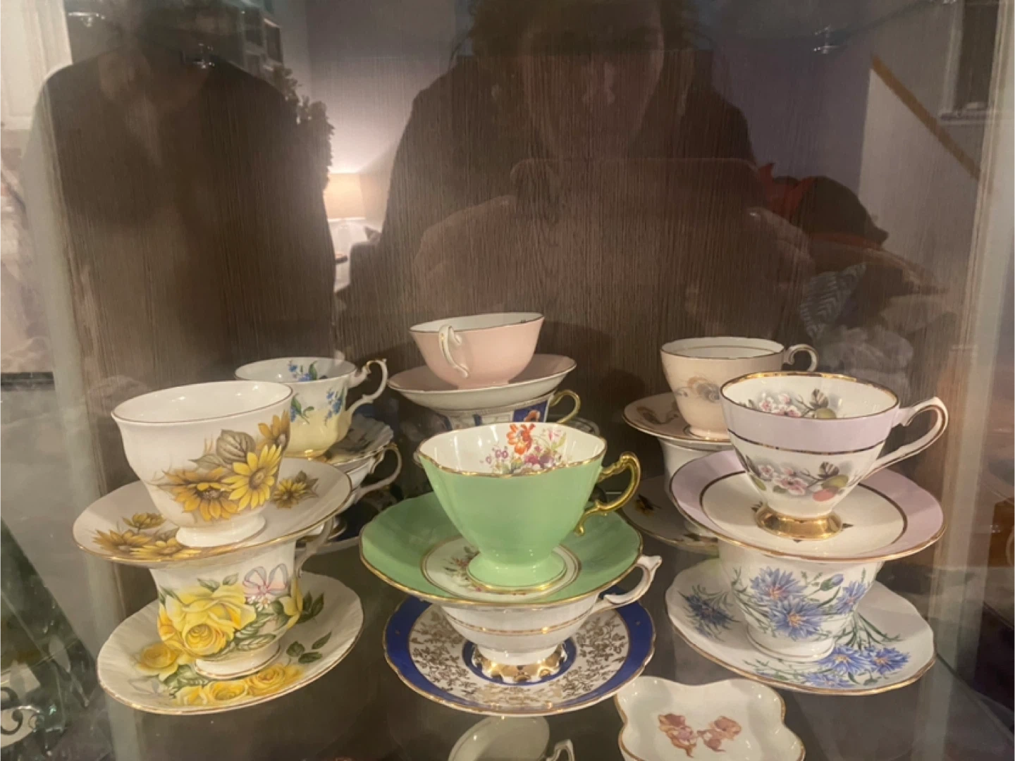 Collection of beautifully patterned teacups and saucers. Features floral designs in various colours like yellow, pink, green, and lavender. Each cup has a delicate handle and some have gold accents. Perfect for a tea lover or as a display piece!
