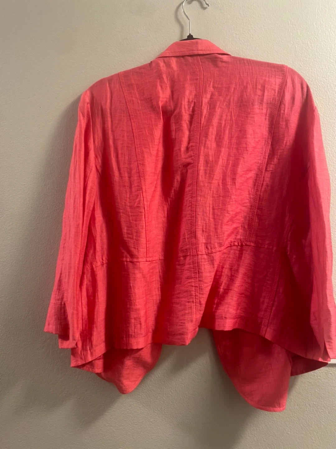 This coral blazer from Gerry Weber features a linen blend fabric. It has a relaxed fit with button closure and a flattering draped front. Great for layering over tops or dresses!