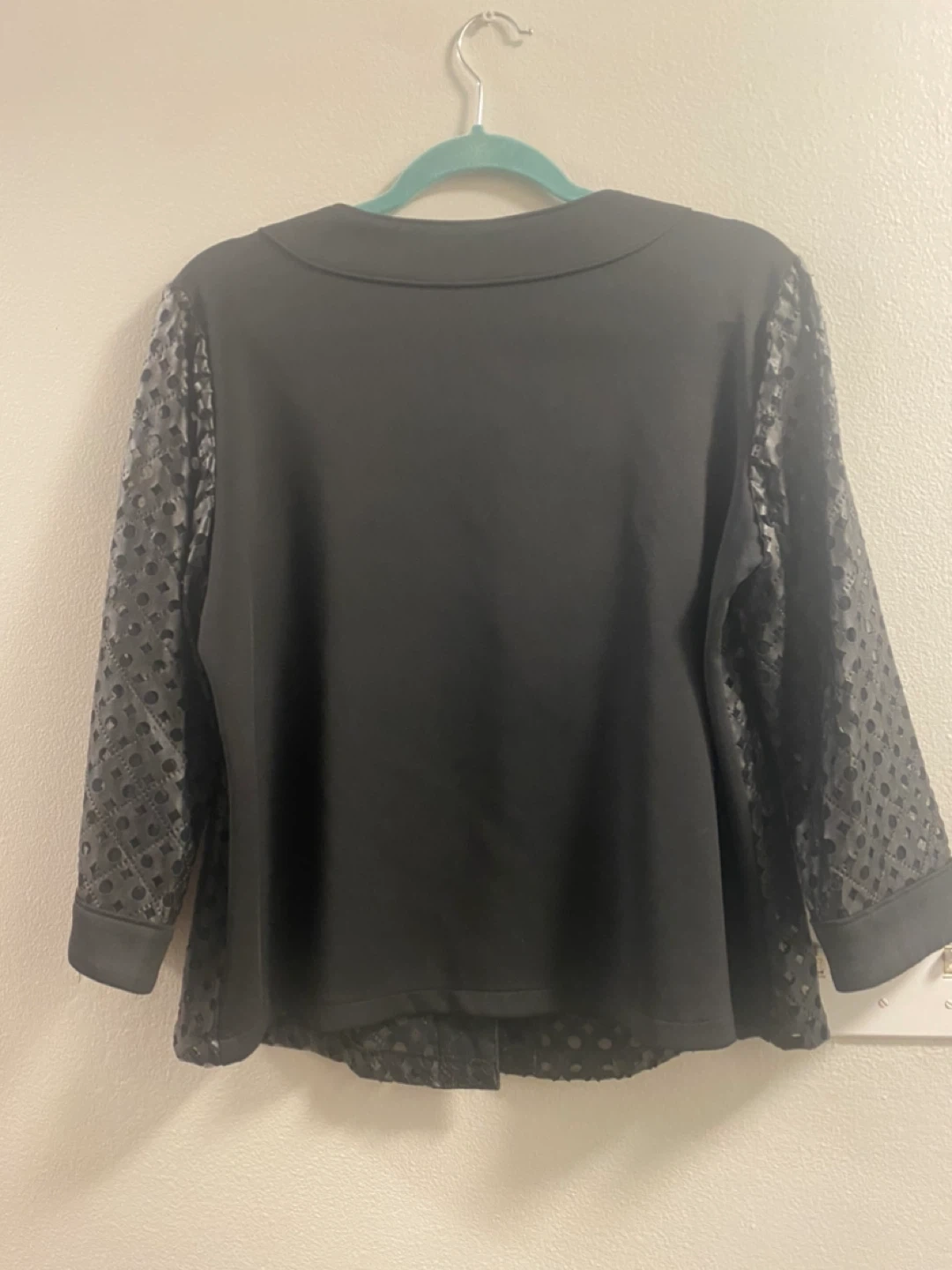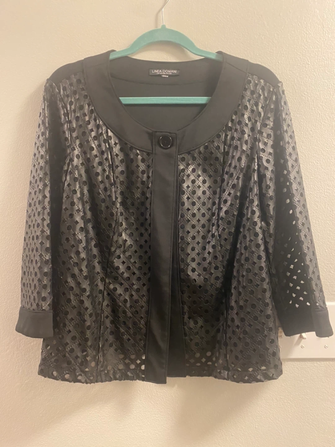 Linea Domani black jacket with a unique perforated design on the sleeves and front panels. It's a stylish piece featuring a single button closure and 3/4 length sleeves. Adds a touch of sophistication to any outfit!