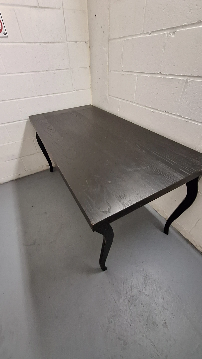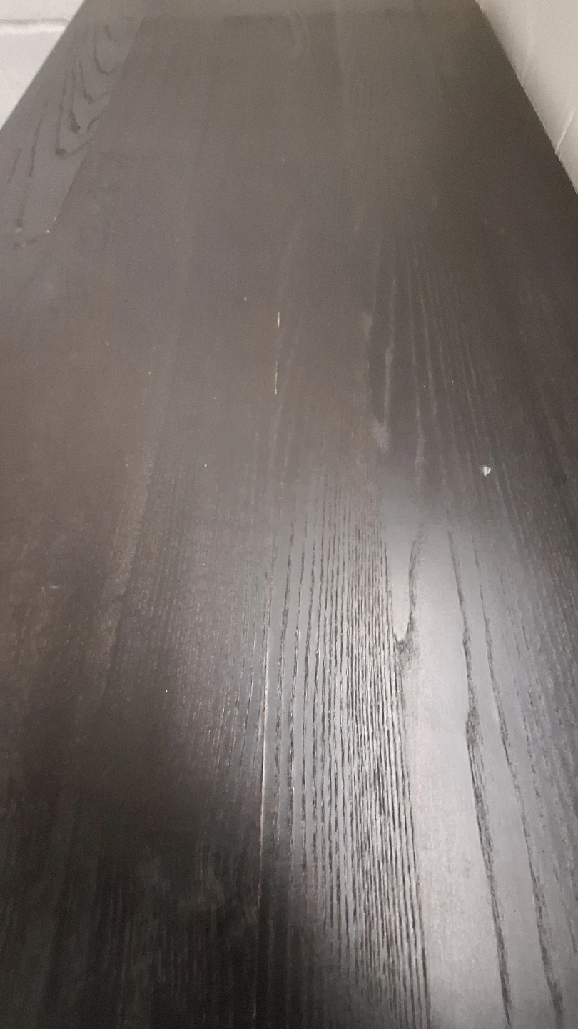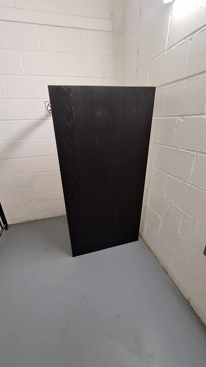 This is an IKEA TORNLIDEN coffee table. It's black with a wood grain finish. The tabletop is a dark wood veneer, and it has black wood legs.