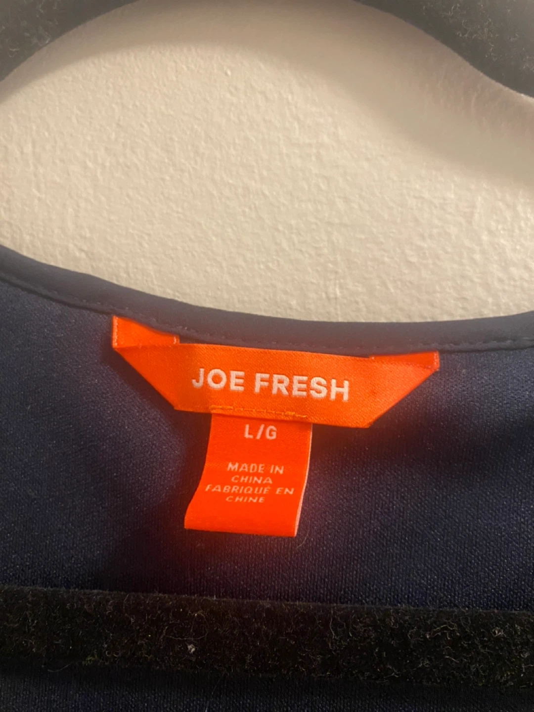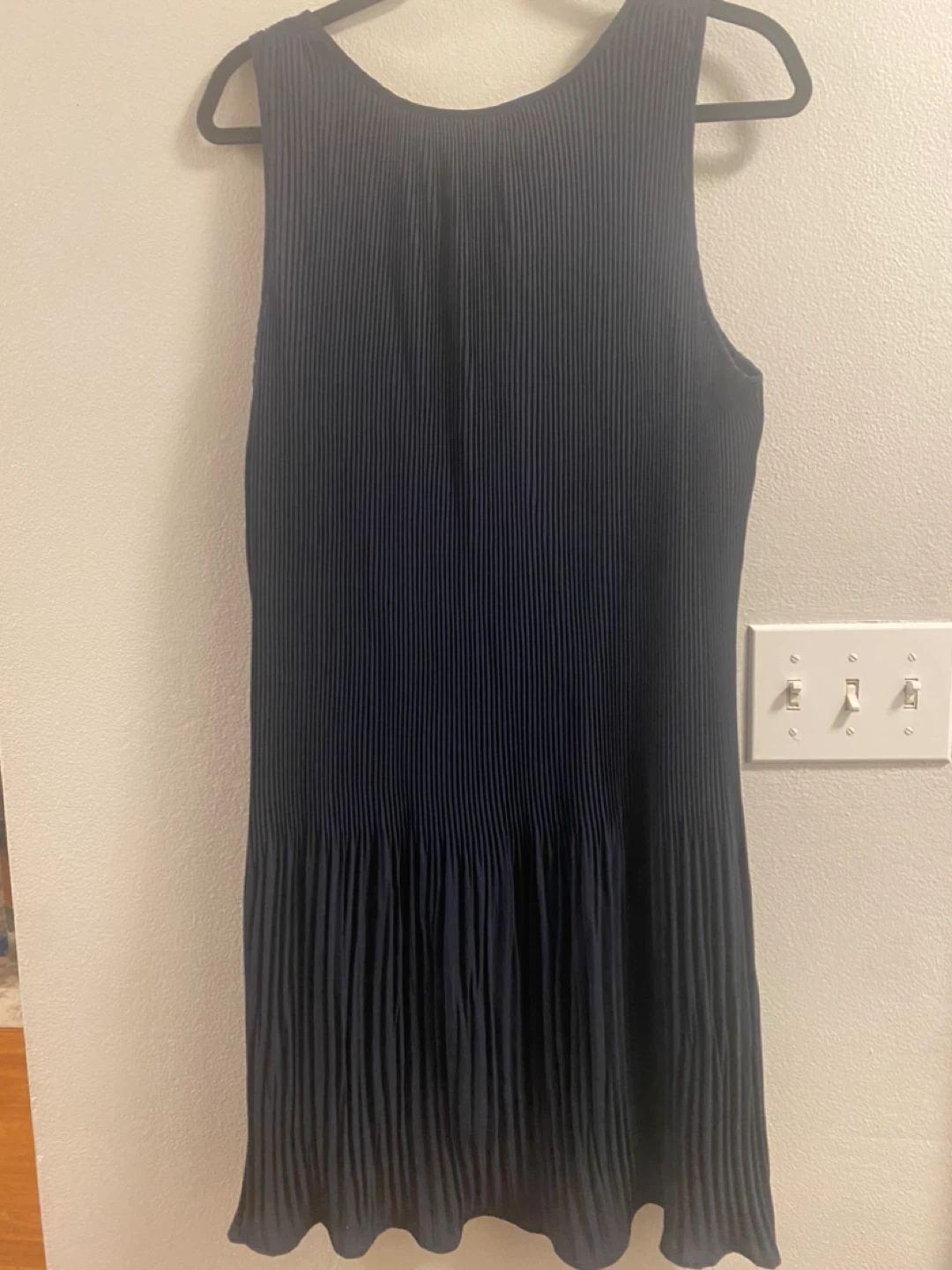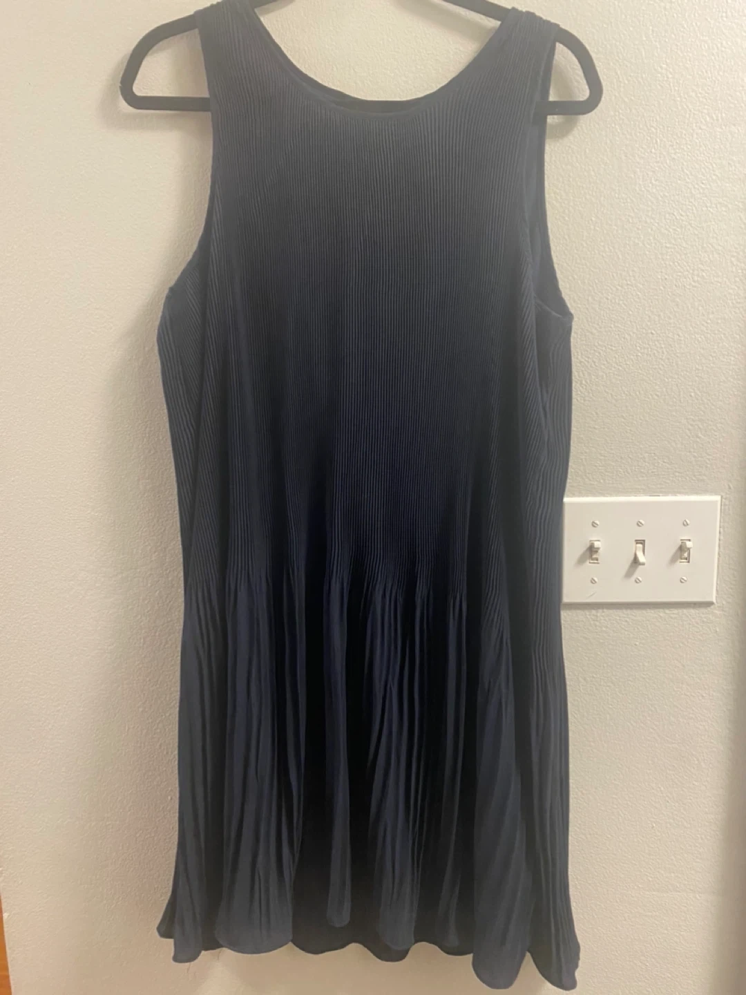 This Joe Fresh dress is navy blue and features a pleated design. It's a size L/G. The fabric has a nice drape.
