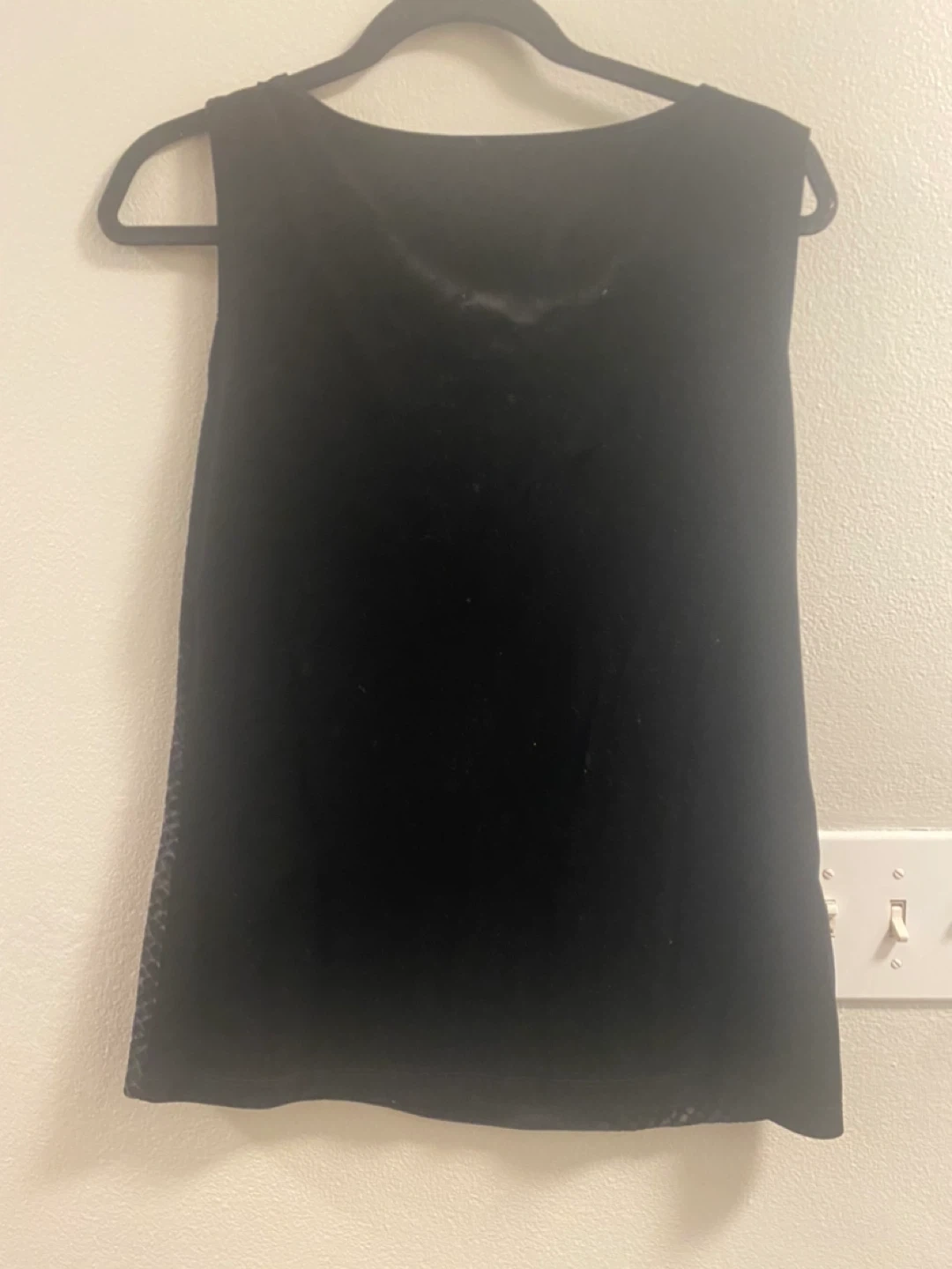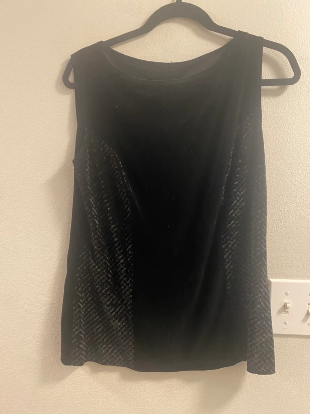 This black sleeveless top is made from soft velvet. It features a unique textured panel on each side. A simple, elegant piece for various occasions!