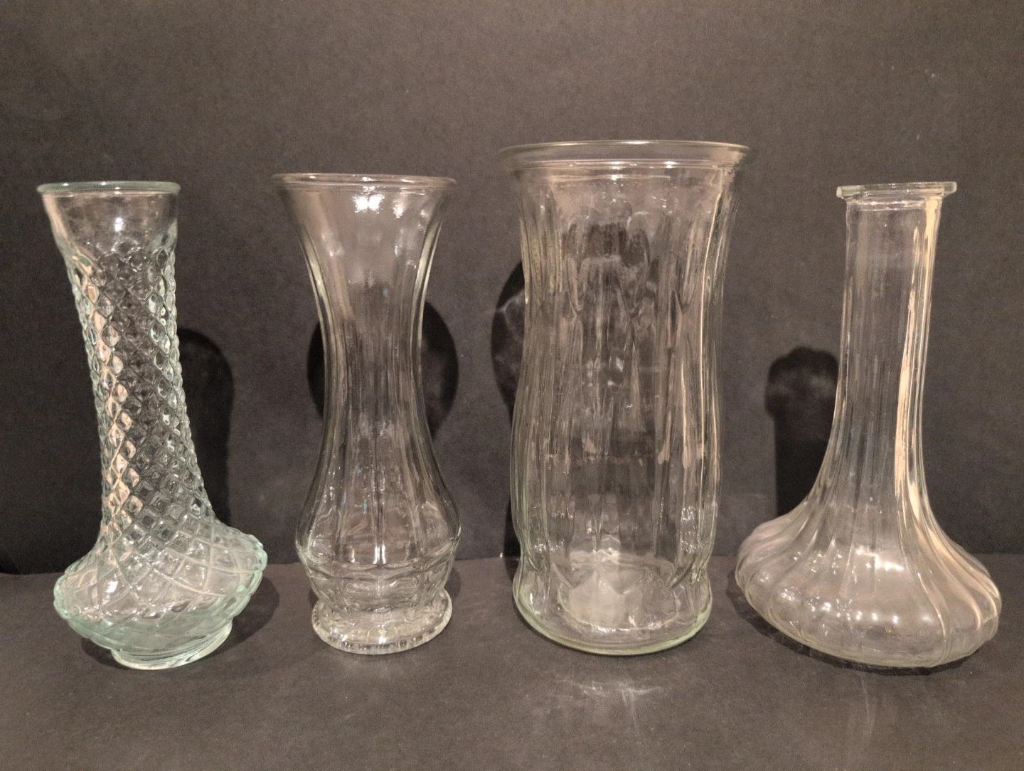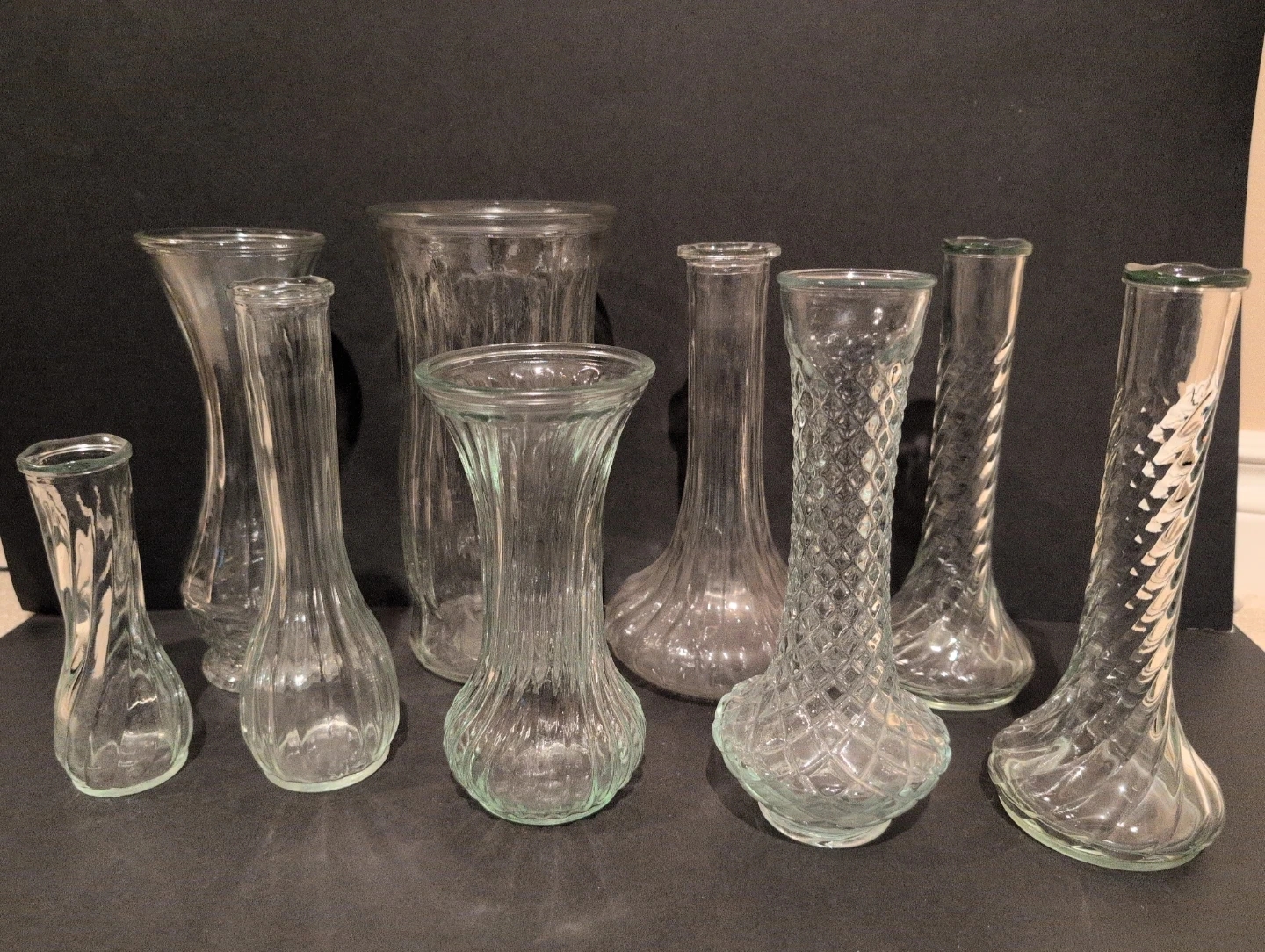 This is a set of nine vintage clear glass vases. They come in various shapes and sizes, with ribbed and twisted designs. These vases are great for single stems, small and various size floral arrangements.