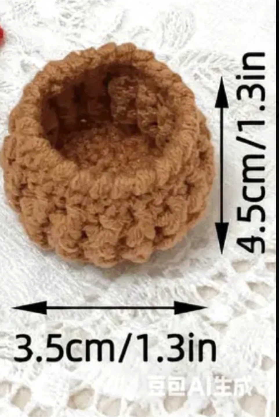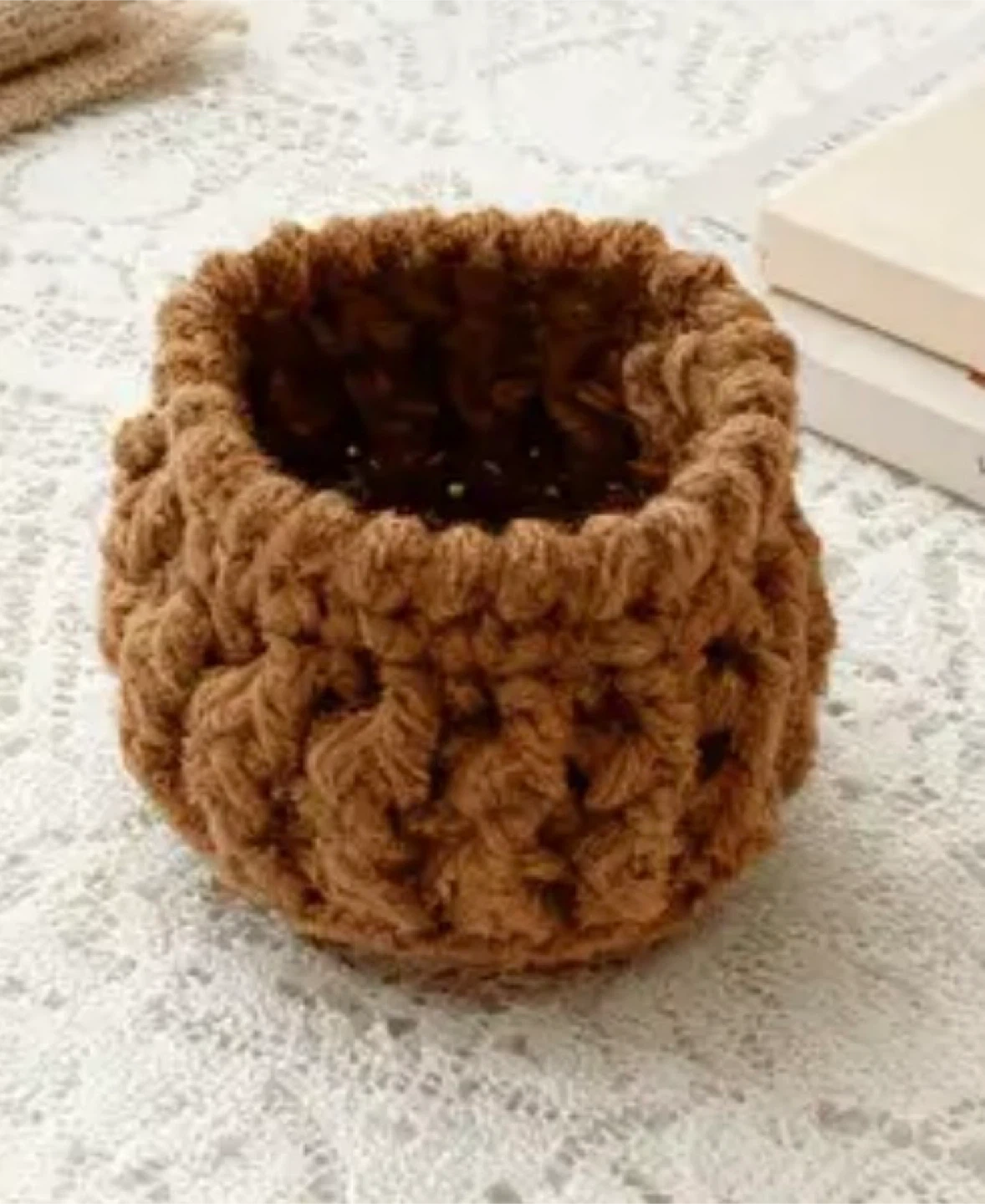 It's made from yarn, offering a touch of decor without any watering needed.