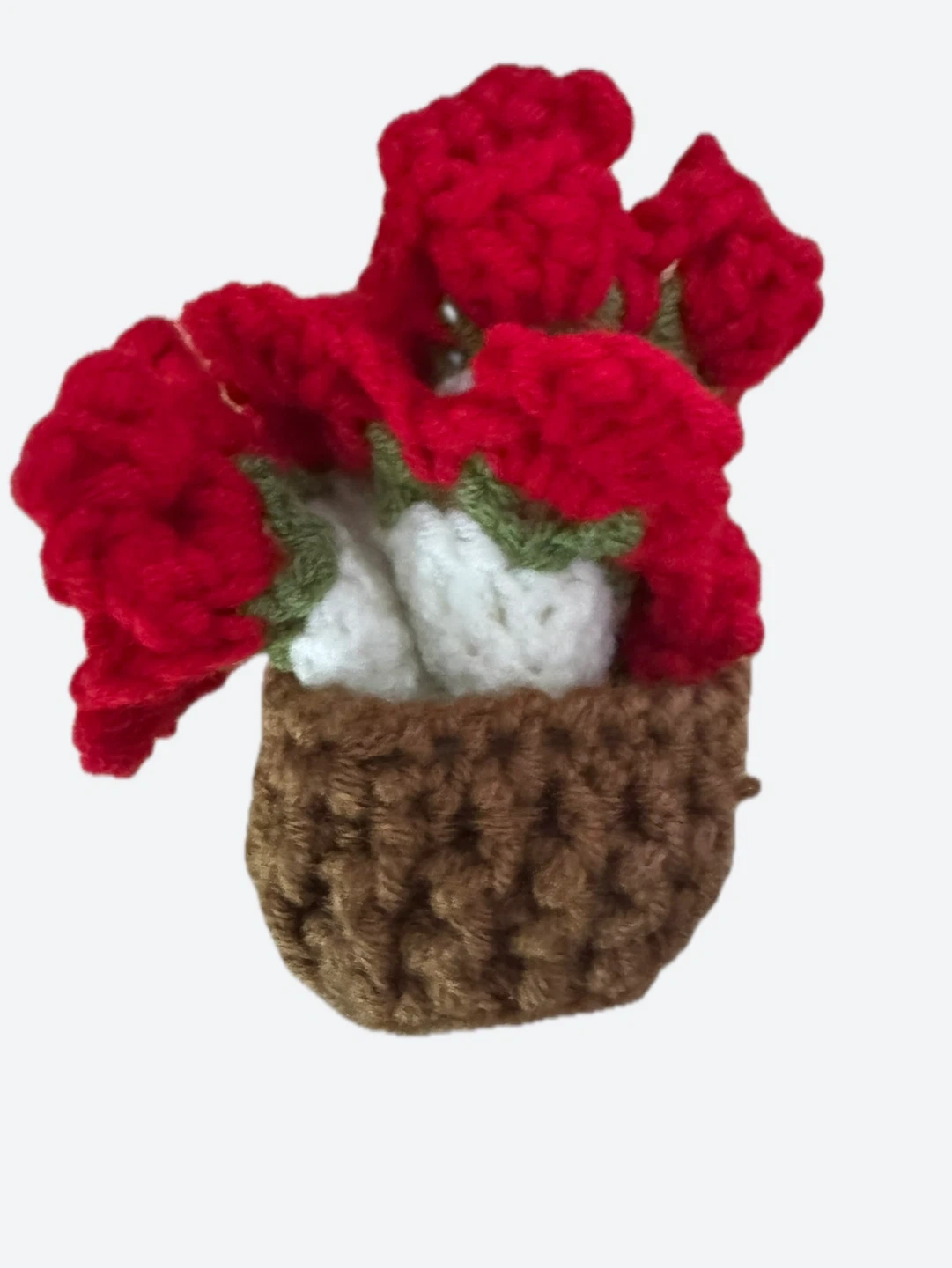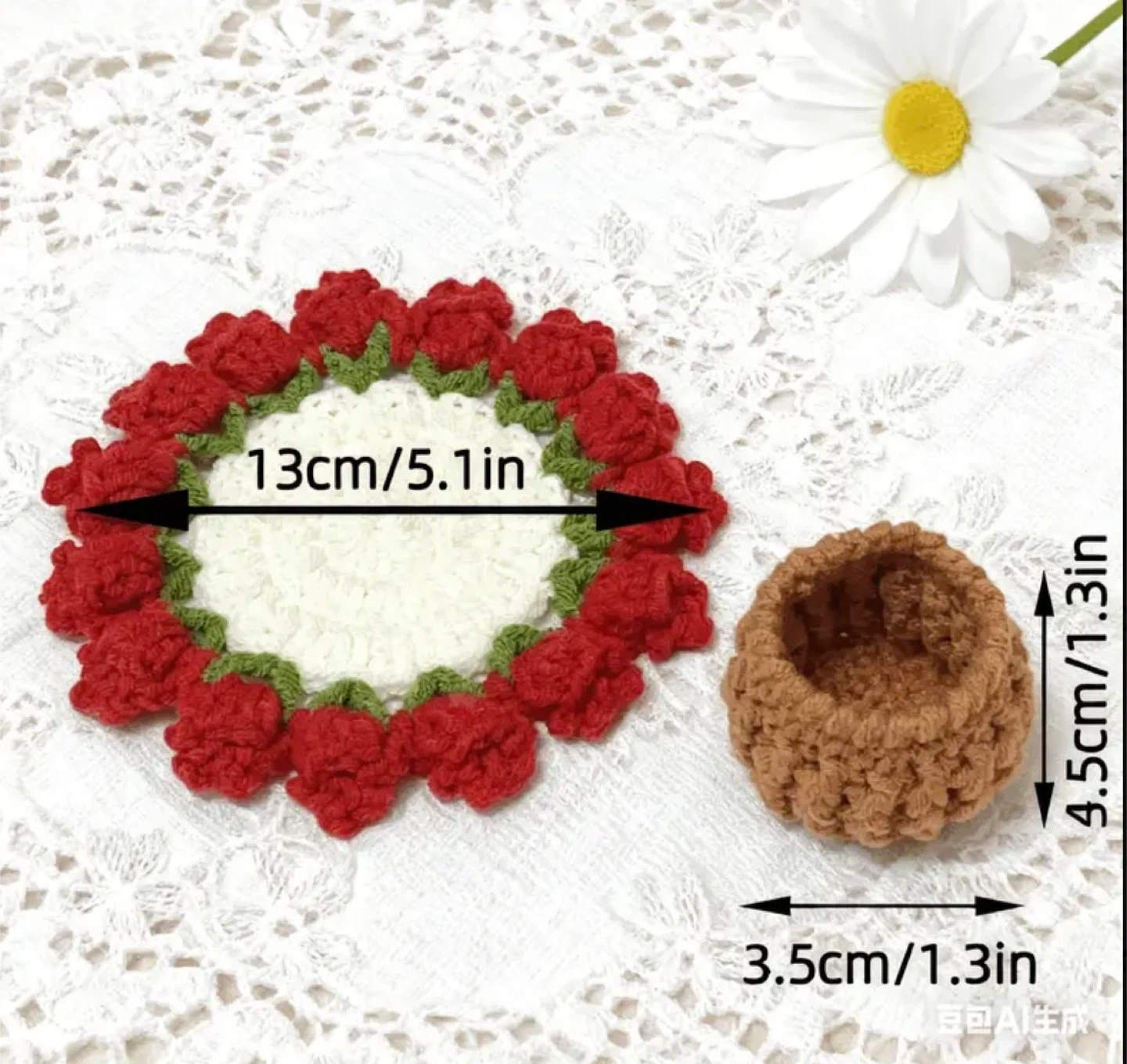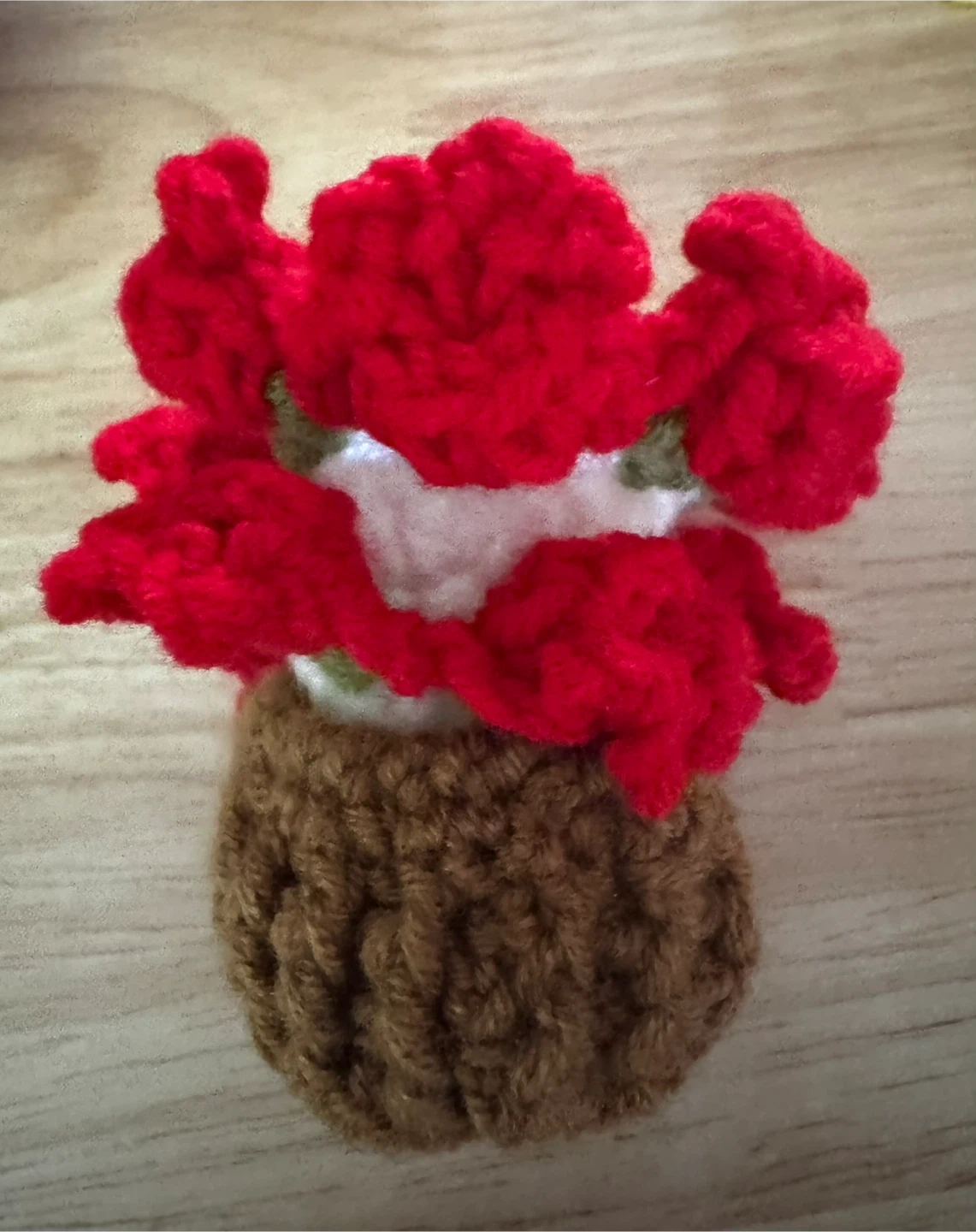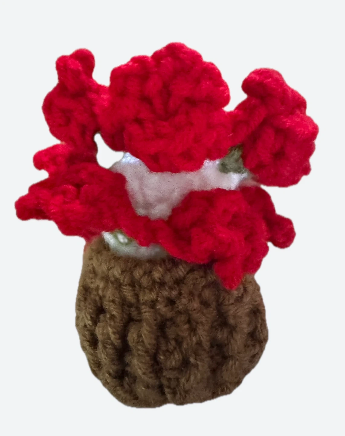 Hand-crocheted bright red 🌹 rose (coaster) and a brown pot.