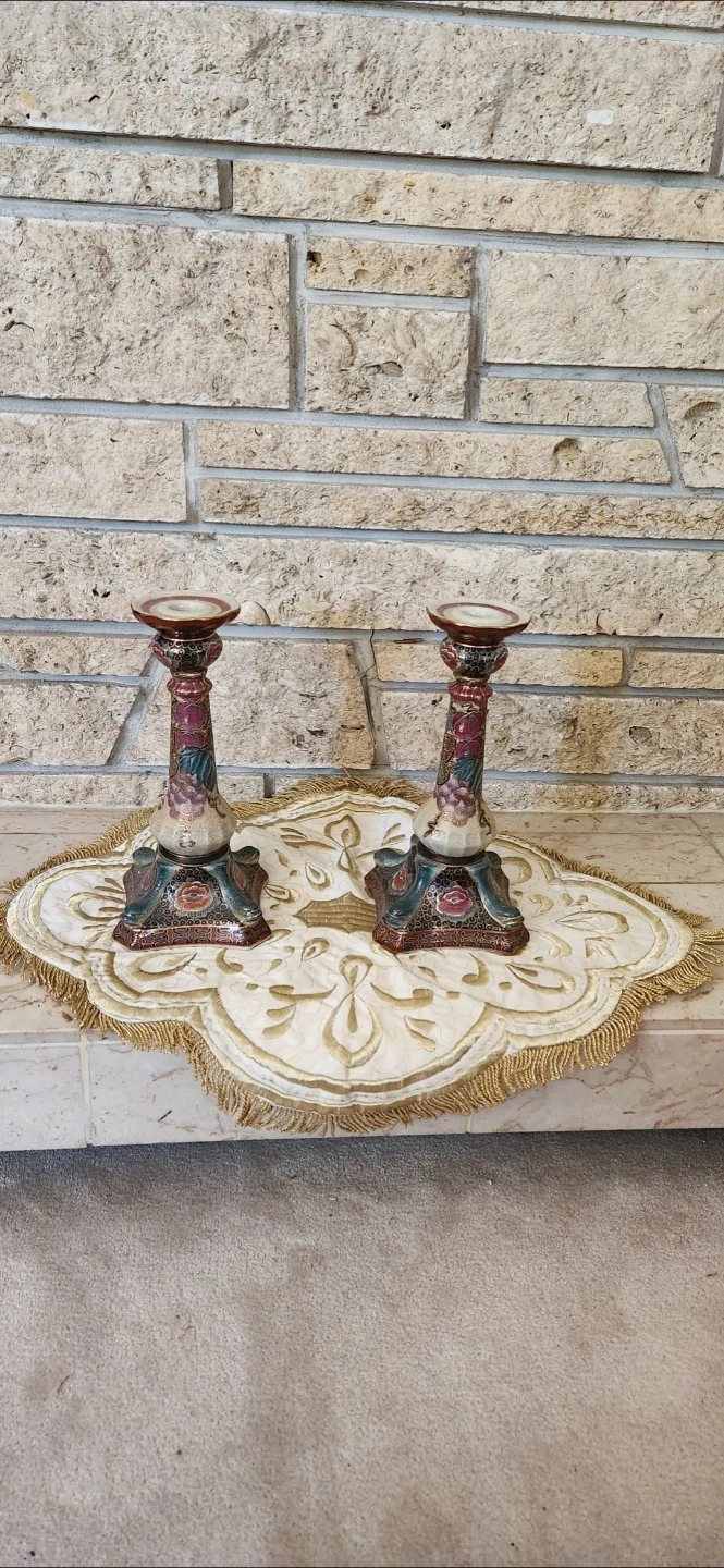A pair of ornate candlesticks with a floral and grape vine design. They're a lovely decorative item for any mantelpiece or table. These candlesticks are made from ceramic.