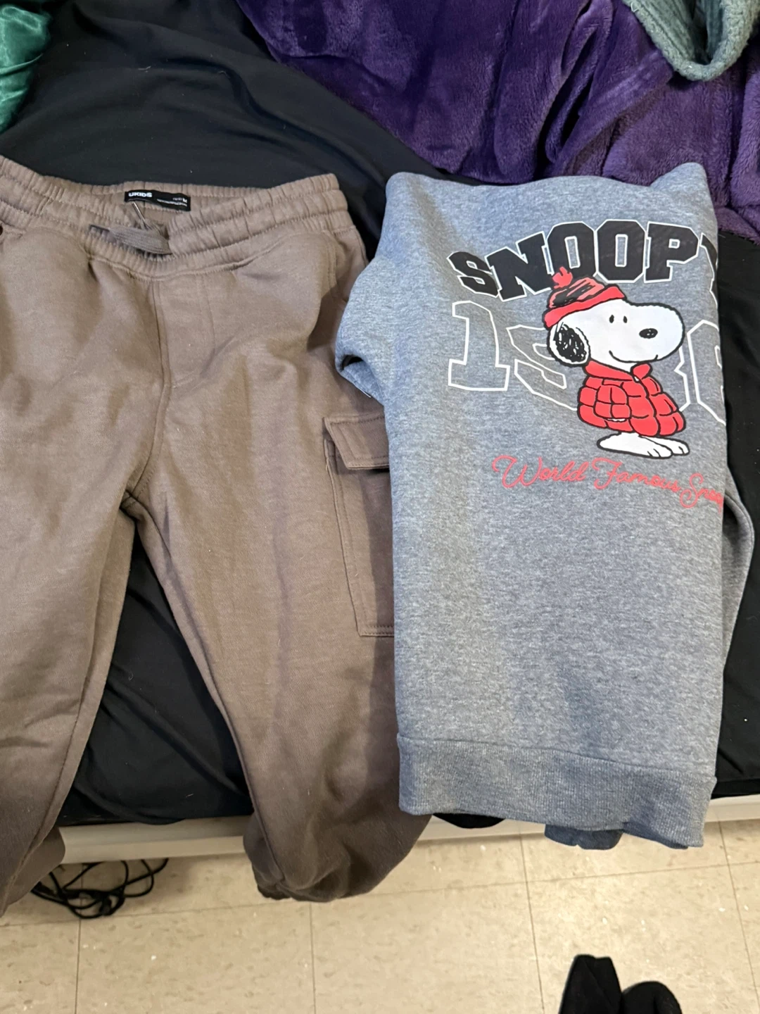 Grey Snoopy graphic sweatshirt paired with brown cargo joggers. Sweatshirt features a Snoopy design text. Joggers have a drawstring waist and cargo pockets. The size is 1012.boy