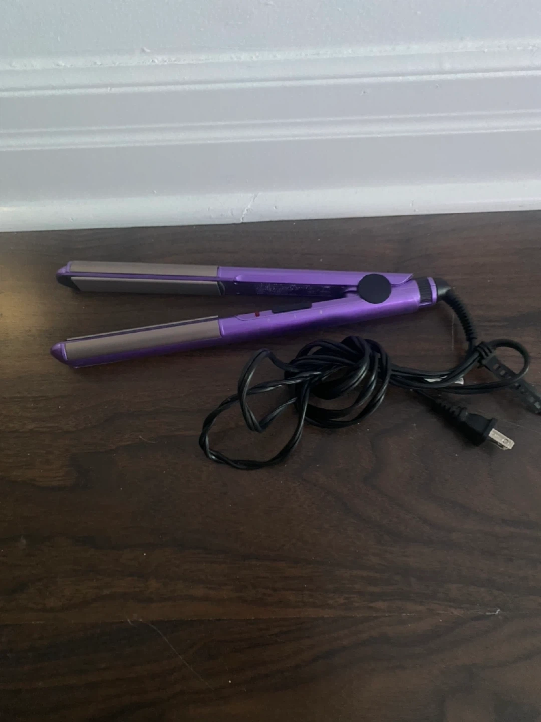 Mini flat iron for hair styling. It's a compact size, perfect for travel or touch-ups. It has ceramic plates for smooth straightening. This tool is handy for quick styling on the go!