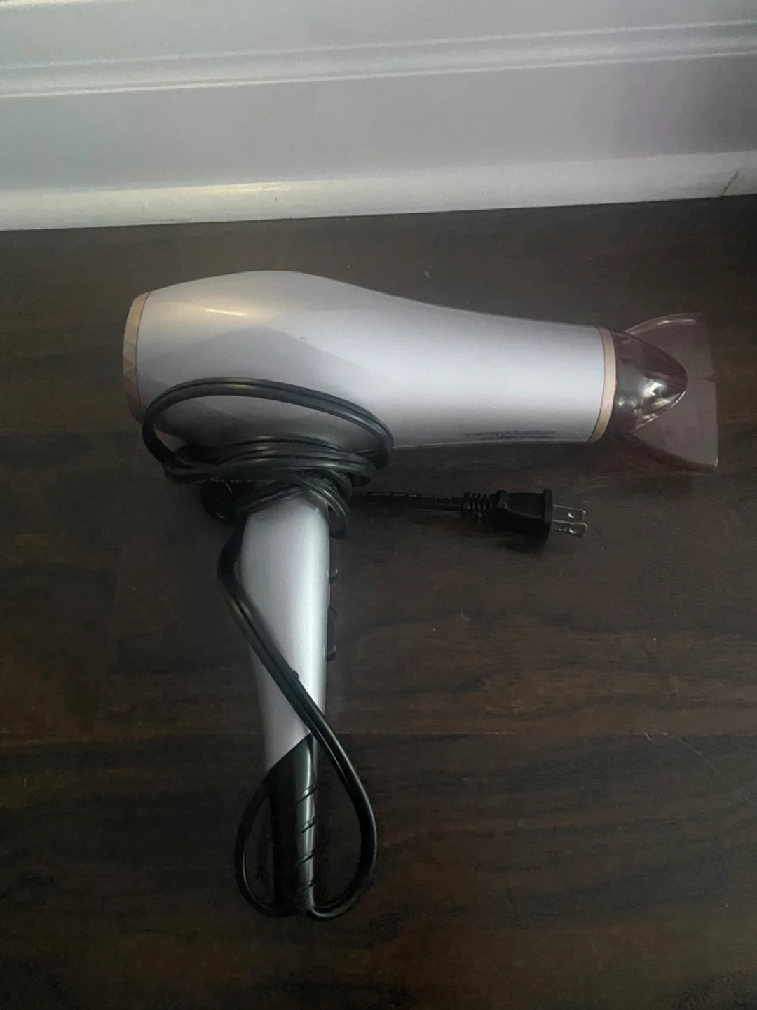 This is a silver hair dryer with a concentrator nozzle. It has a foldable handle for easy storage. A great everyday hair dryer!