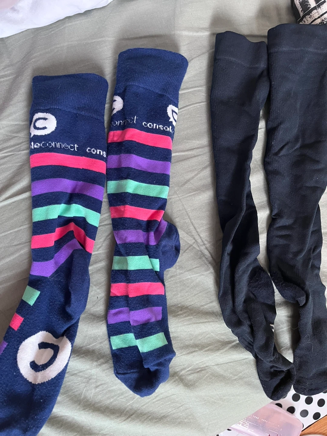 Comes with a pair of black, navy blue knee-high socks featuring colourful stripes and a logo. Also includes a pair of plain navy blue knee-high compression socks. Perfect for everyday wear or athletic activities!