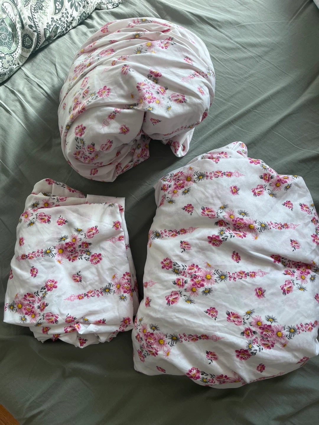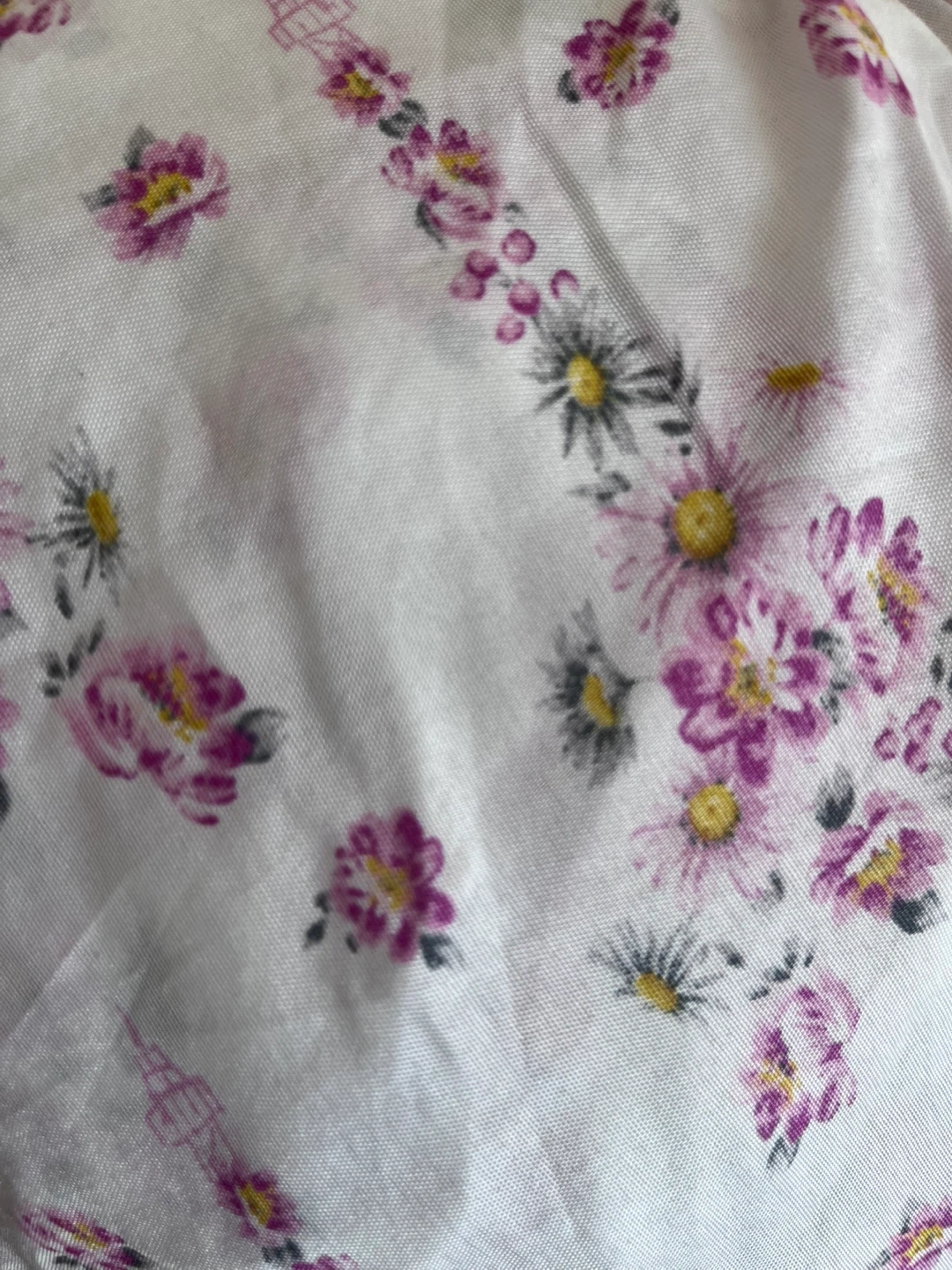 This bedding set features a lovely white background with a pink and purple floral print. It includes a duvet cover and two pillowcases. Made from a soft fabric, it's sure to add a charming touch to your bedroom.