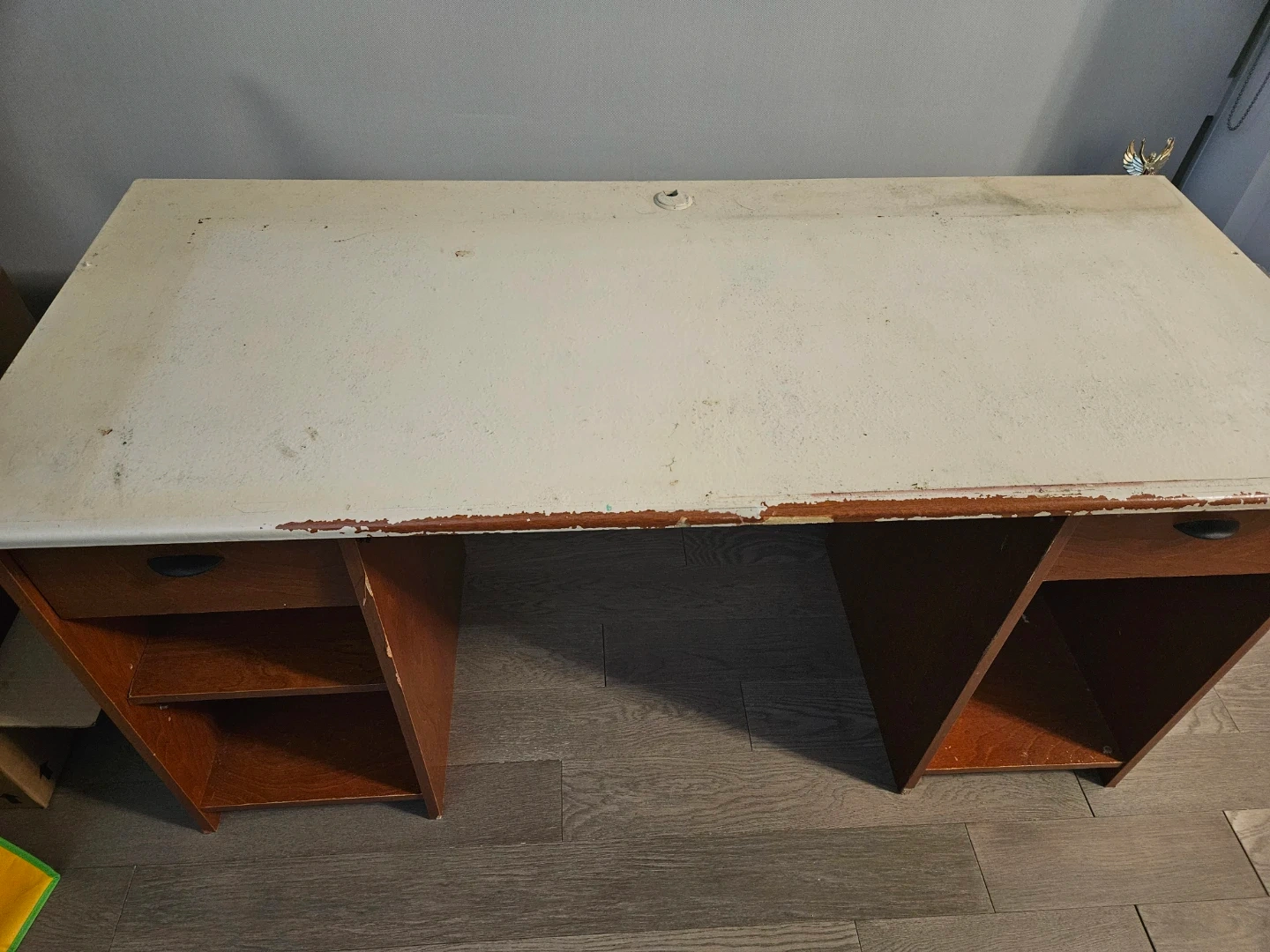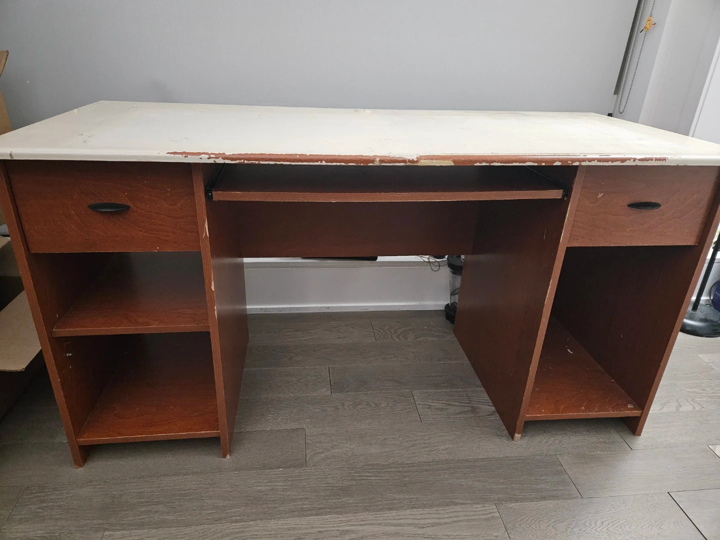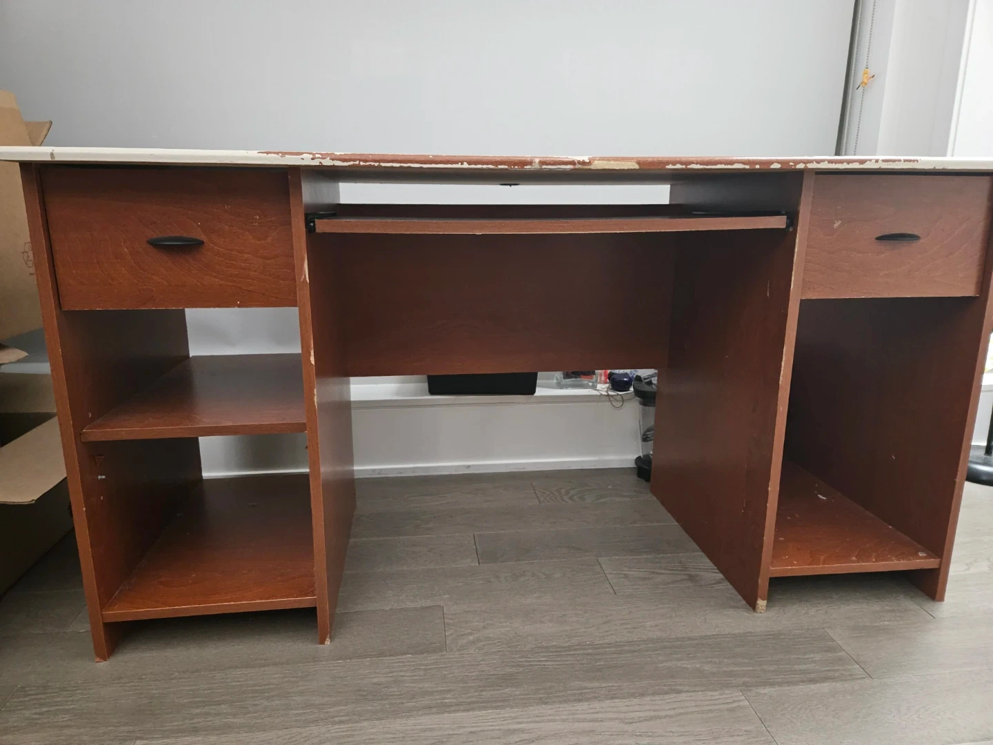 Giving away a used brown wooden desk. Has a keyboard tray, as well as drawers and shelves on either side. Considerable wear & tear especially on the top, as shown in the photos, and would benefit from some TLC. Approximately 140cm x 60cm. Pickup only.