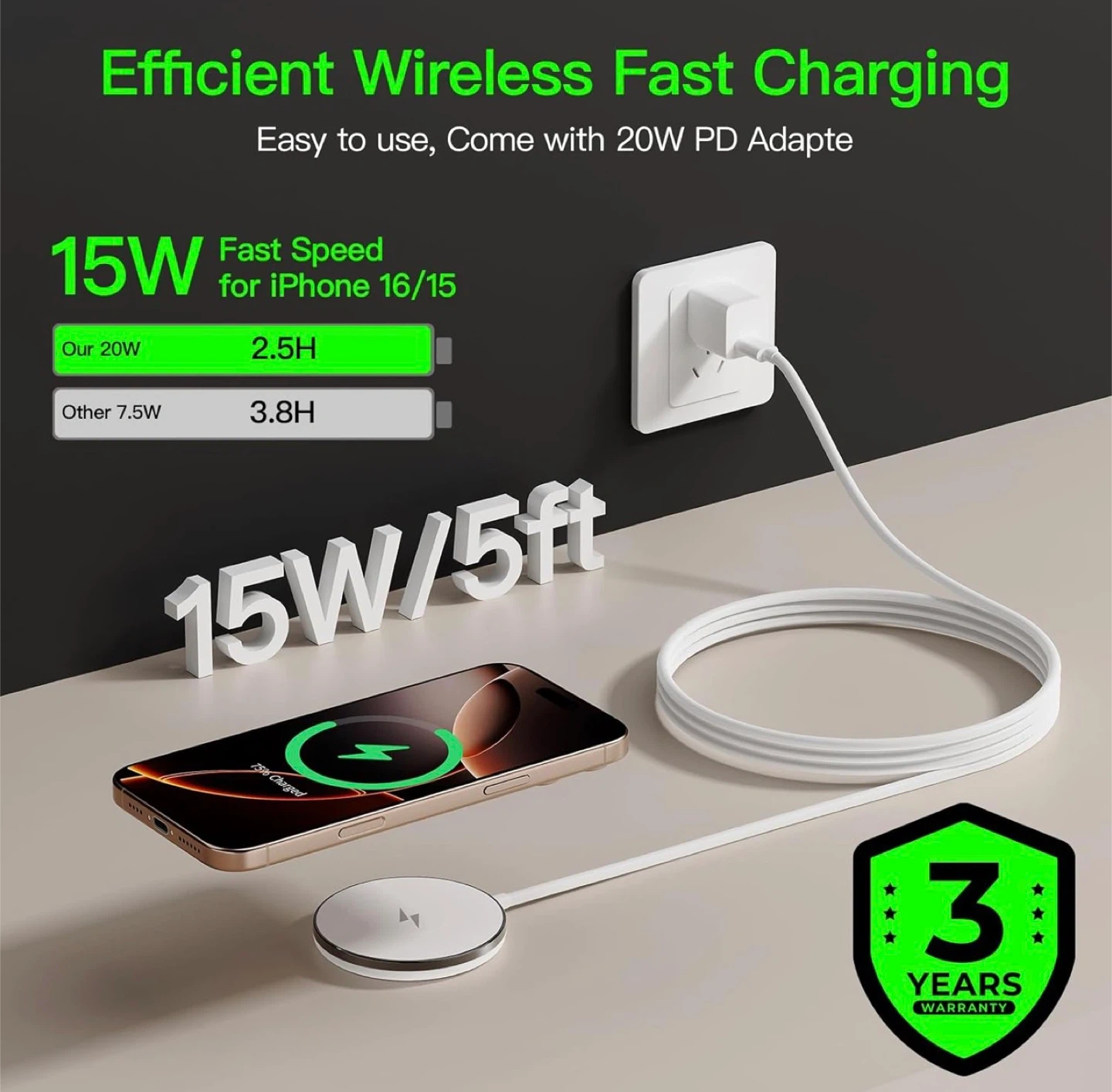 15W Wireless Magnetic Charger with 20W PD Adapter & 5ft Cable