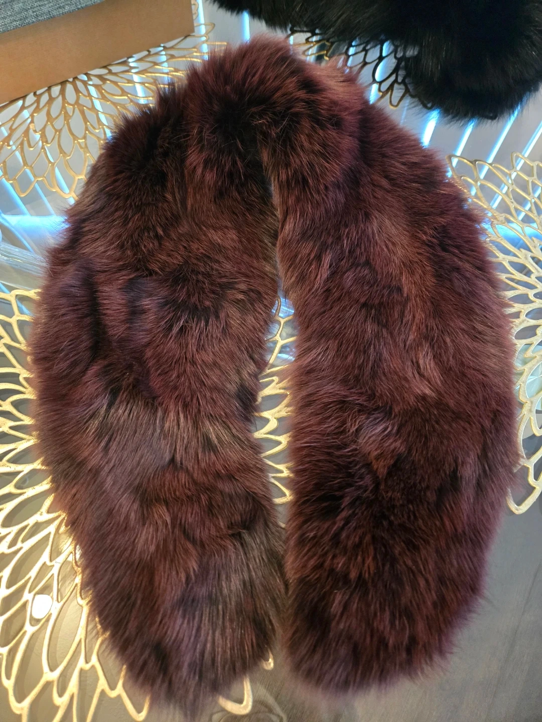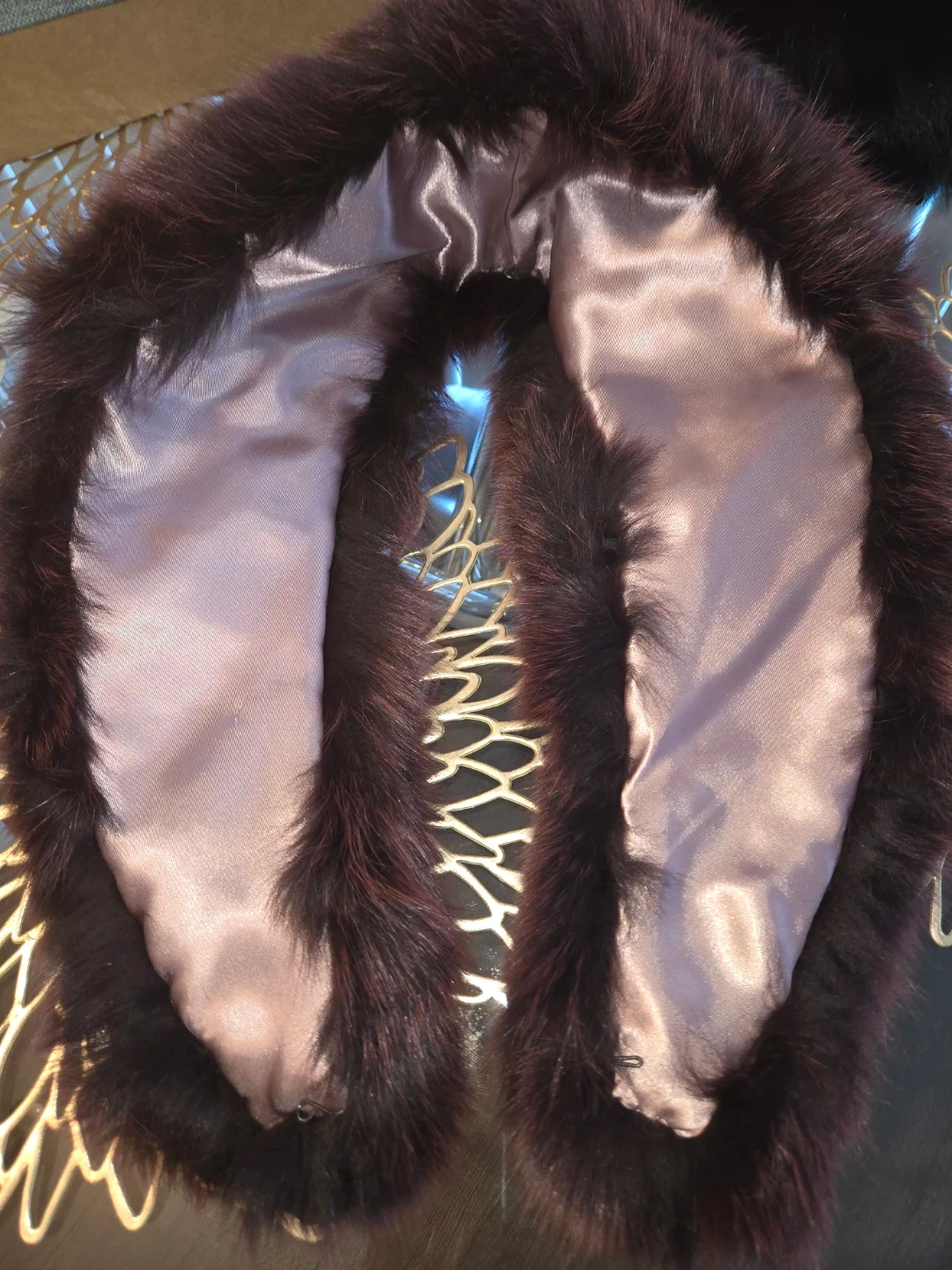 Gorgeous plum-coloured genuine fox fur collar scarf with a silky satin lining. It's soft, warm, and adds a touch of elegance to any outfit. Perfect for cooler weather!