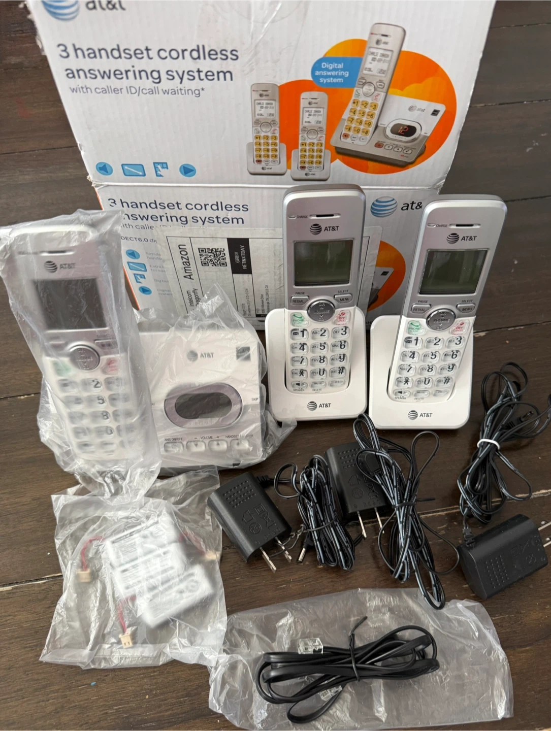 AT&T EL52303 3-Handsets cordless phone system with answering system. Includes base, 3 handsets, and power adapters. Features caller ID and call waiting.