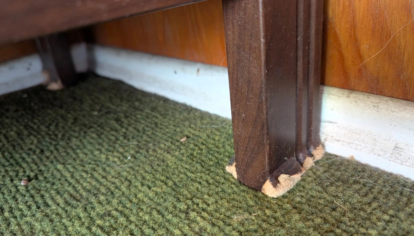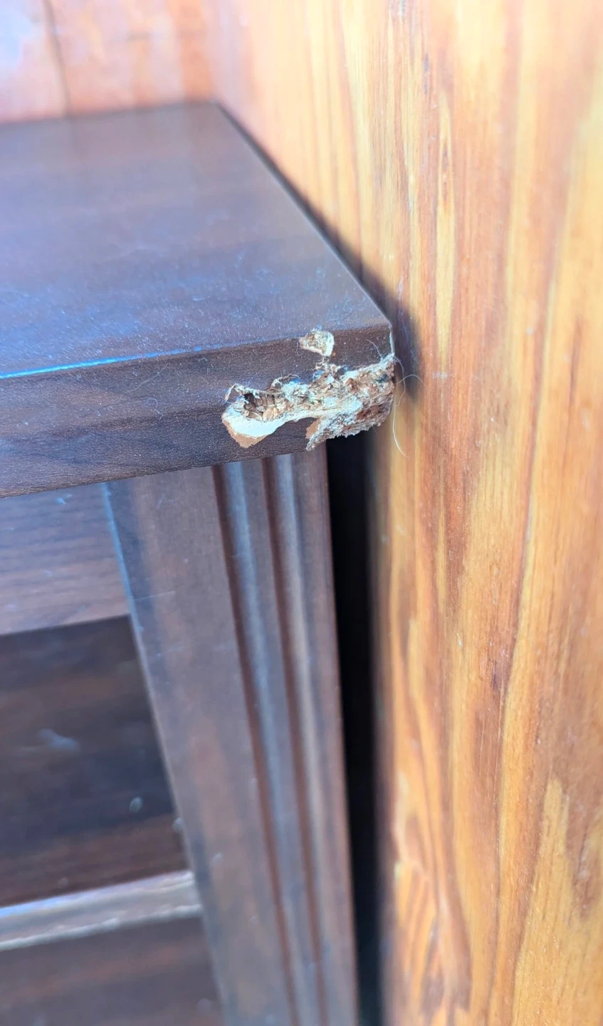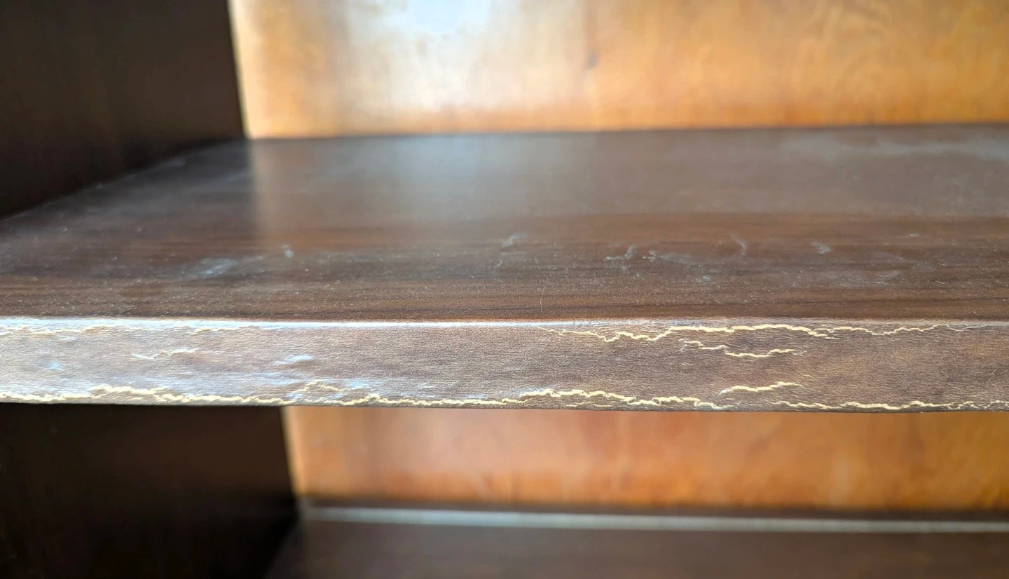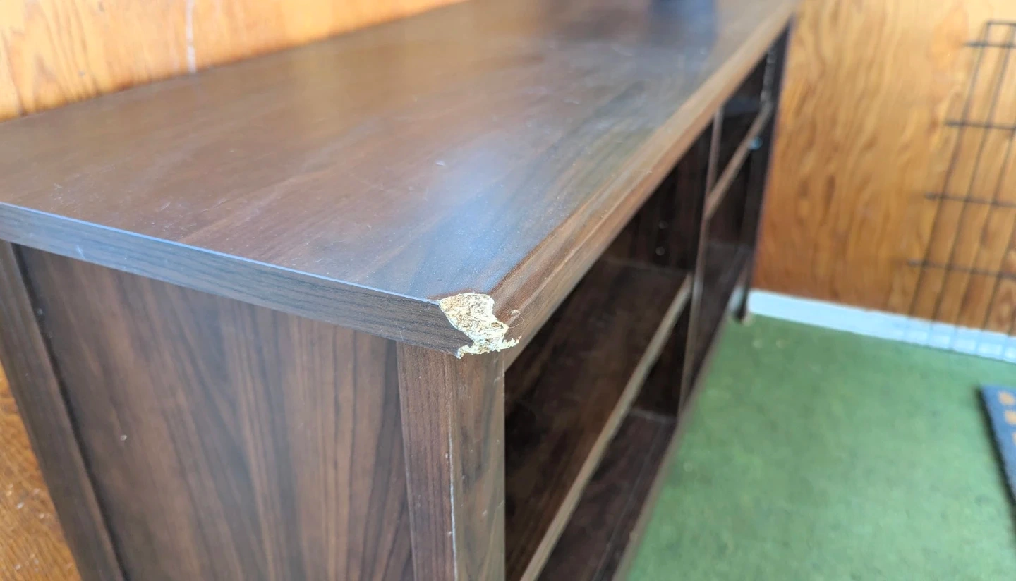 *Water damaged* dark brown media console/tv stand with open shelving. Some chips and wear on the corners and edges. Still functional for storage where aesthetics aren't a priority (i.e. covered porch/garage). It was left behind by a neighbour that moved out so I moved it out of the wet snow but it had already sustained damage from the moisture as it's particle board, not solid wood unfortunately. Posting in case anyone can make use of it and save it from the landfill