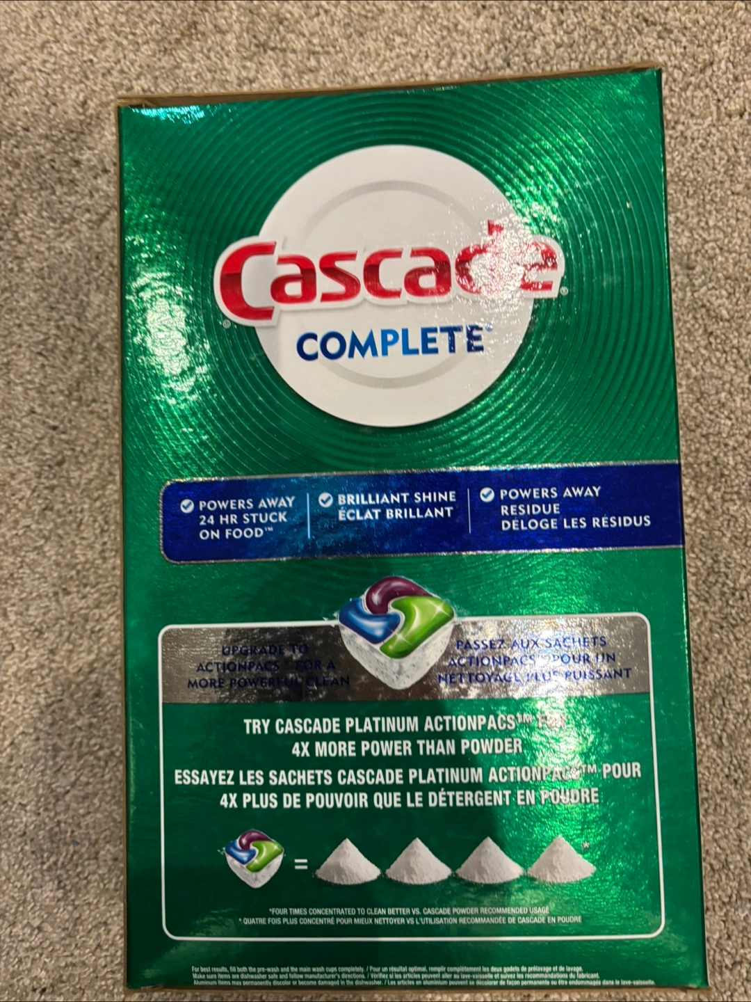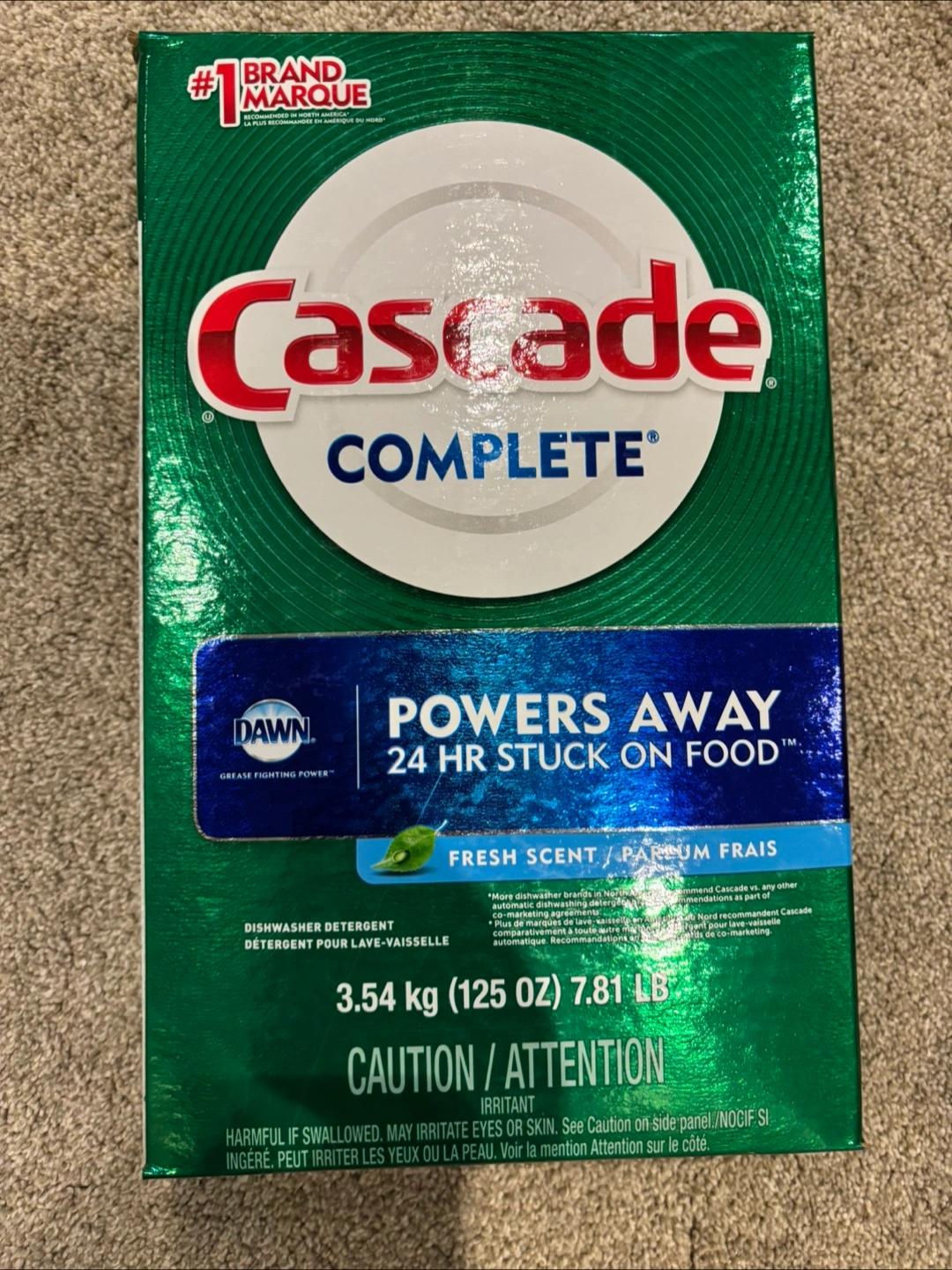 Selling a box of Cascade Complete dishwasher detergent. It powers away 24-hour stuck-on food and provides a brilliant shine. The box contains 3.54 kg (125 oz) / 7.81 lb of detergent.