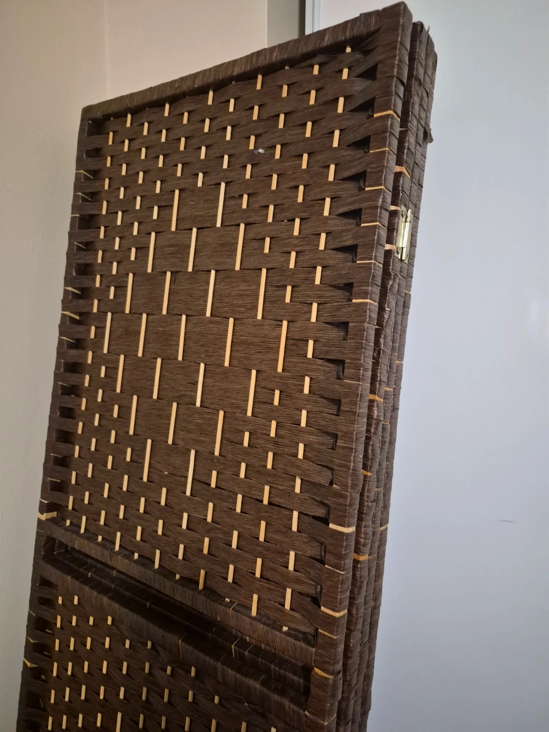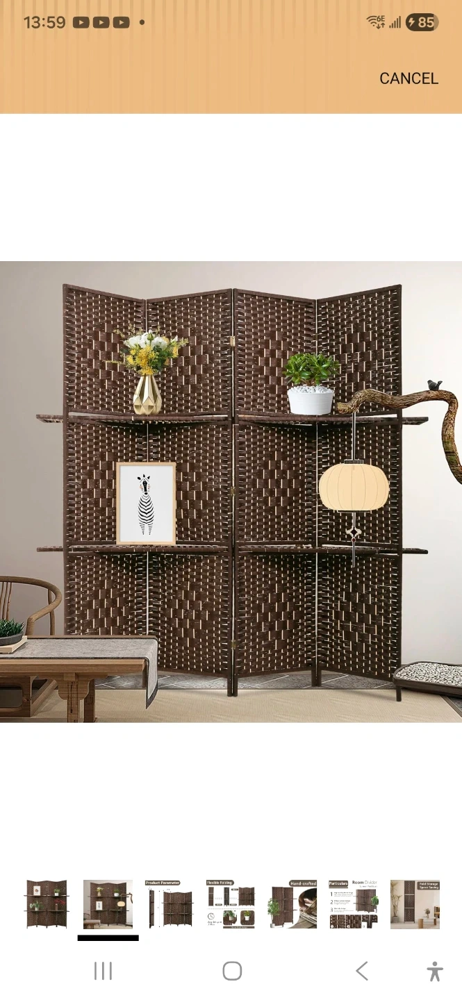 This 4-panel room divider is 71 inches tall and 17.3 inches wide per panel. It's made of woven material in a dark brown colour. It includes shelves on each panel for display. This divider can be folded for easy storage.