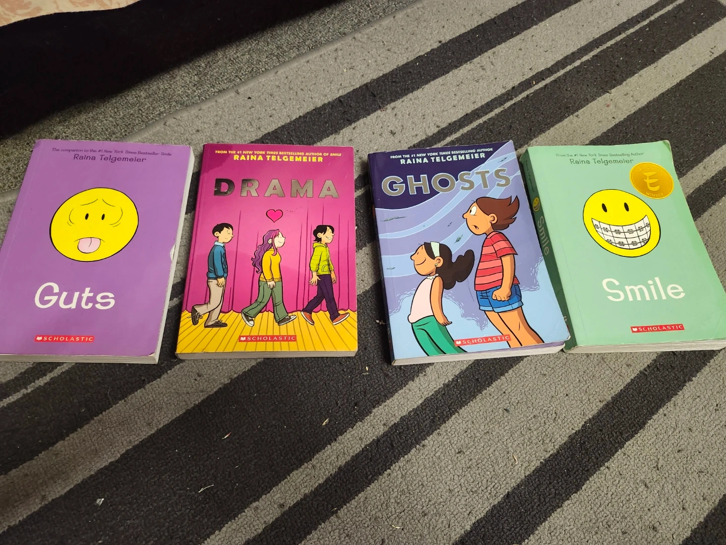 four graphic novels by Raina Telgemeier: 'Smile', 'Guts', 'Drama', and 'Ghosts'. These are popular middle-grade books, perfect for young readers. The books are in good condition and ready for new adventures!