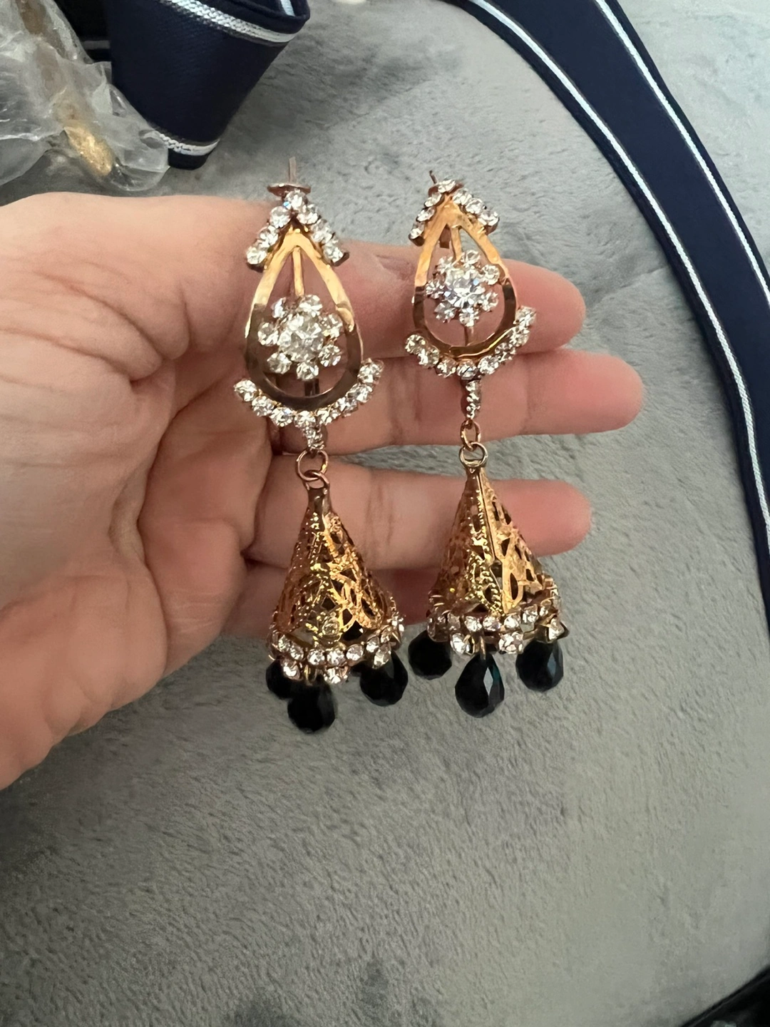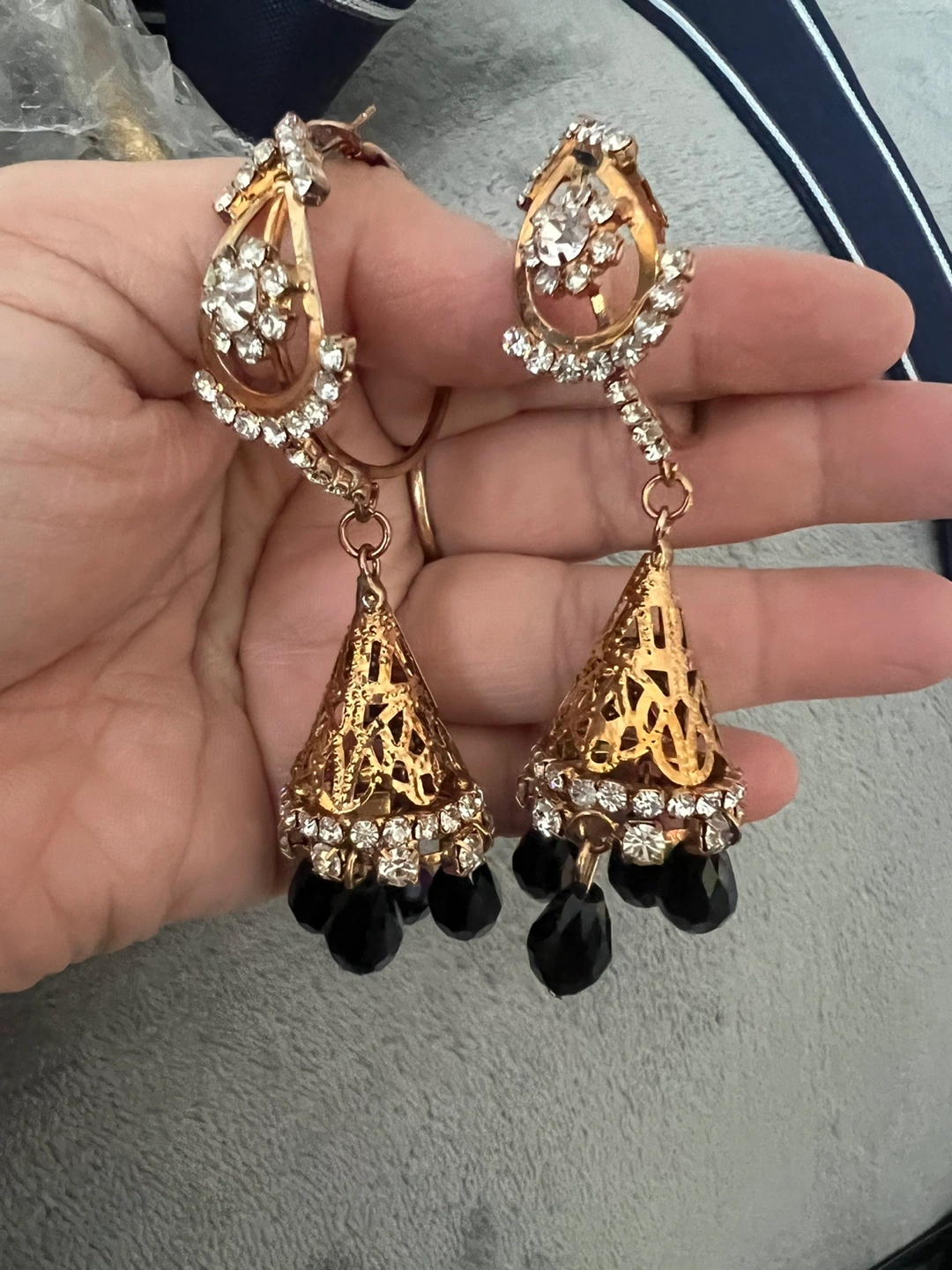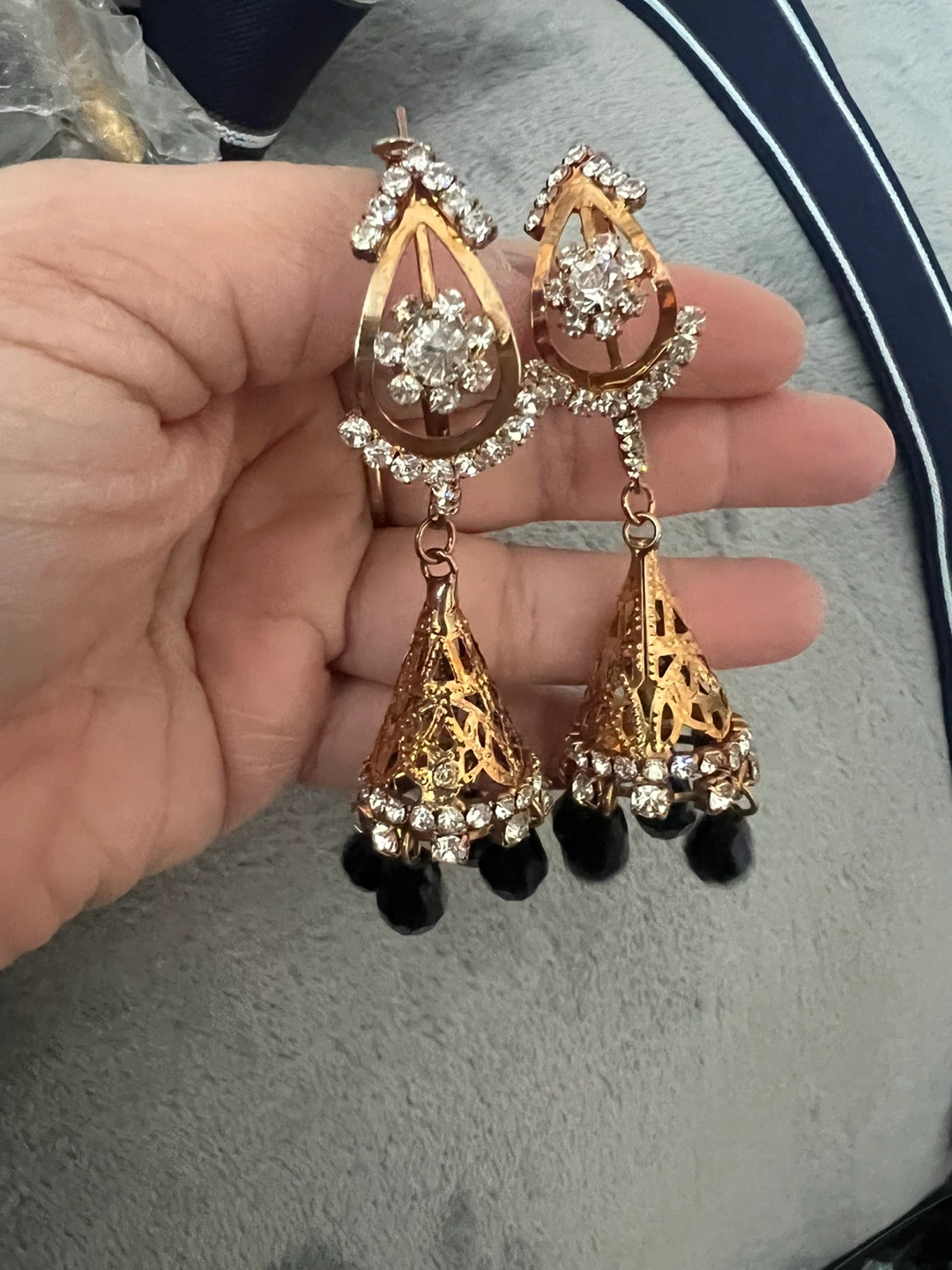 Selling a pair of beautiful gold-tone dangle earrings. They feature a teardrop shape with clear rhinestones and a dangling cone with black beads. Perfect for adding a touch of elegance to any outfit!