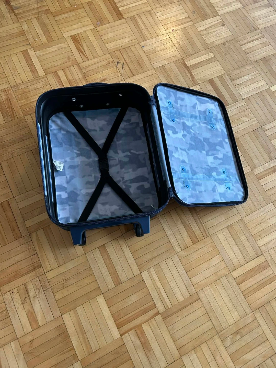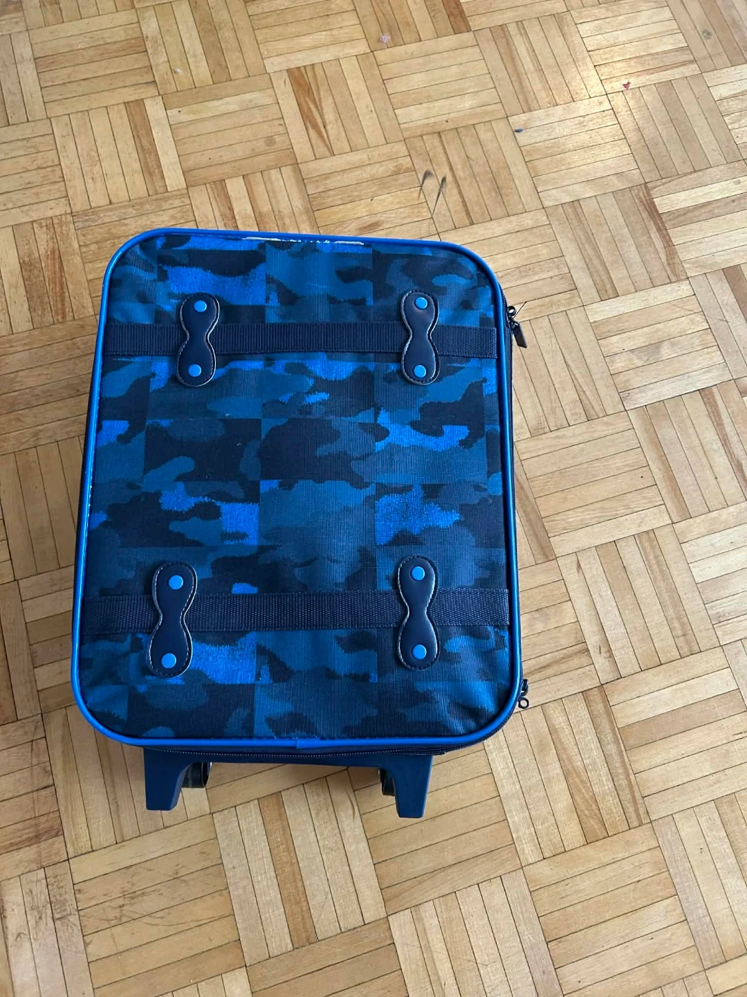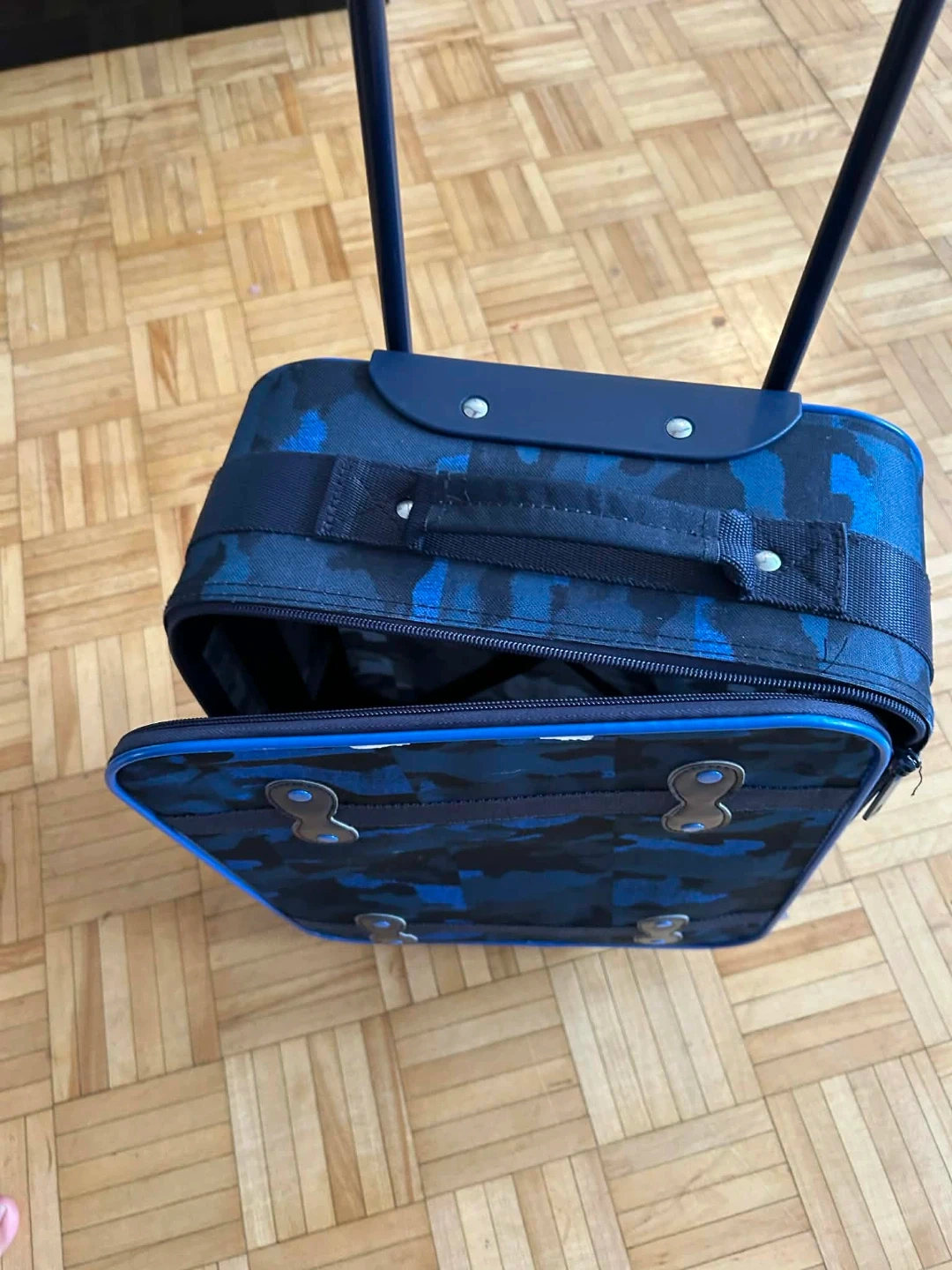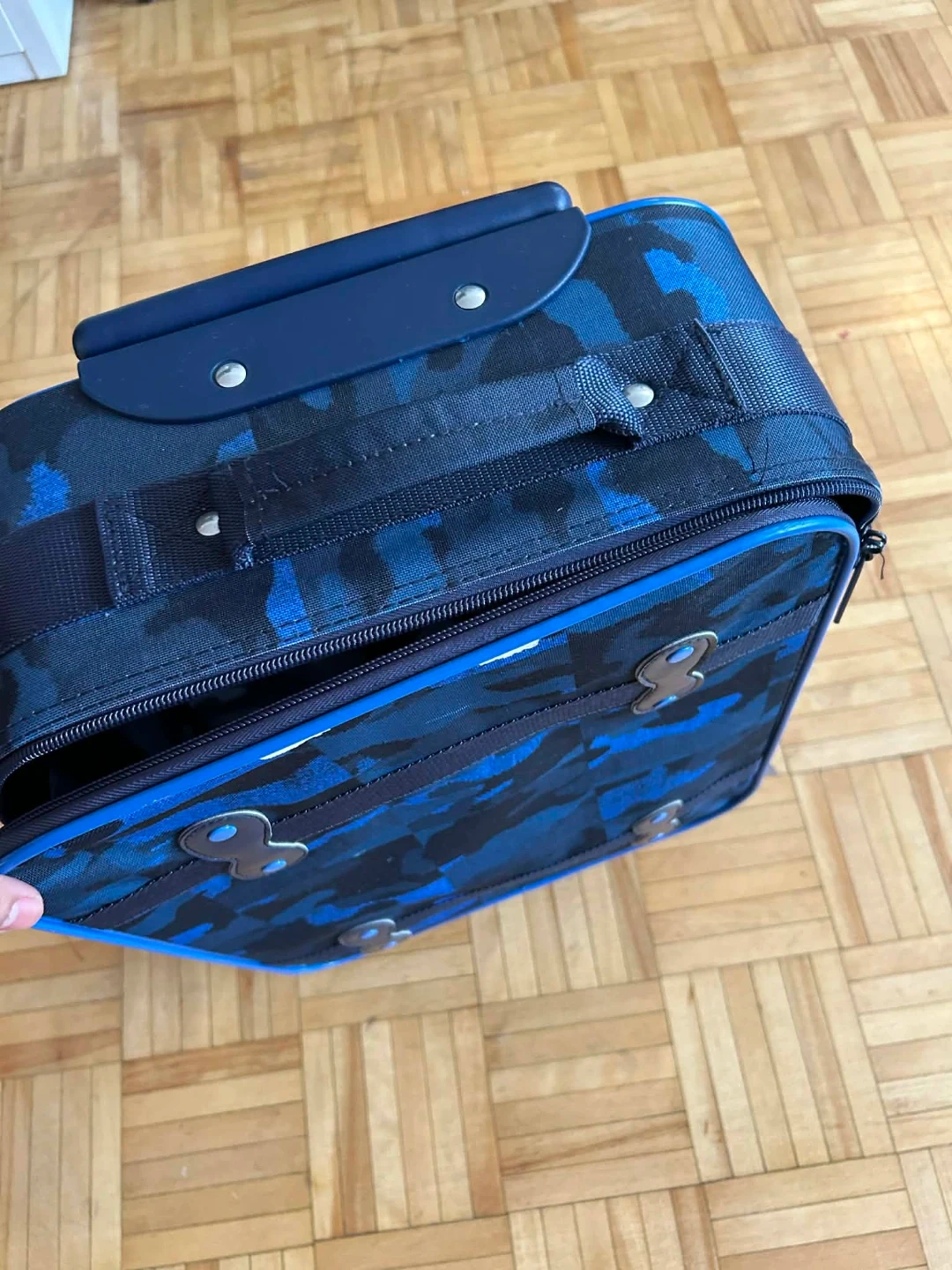 This is a blue camouflage rolling suitcase. It has a telescoping handle and a zippered main compartment. The interior has straps to secure belongings.
