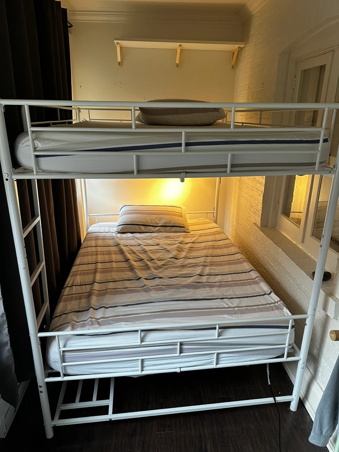 Metal bunk bed, white in colour. Includes ladder and a under shelf for storage. Includes 2 mattresses (6” and 8”).