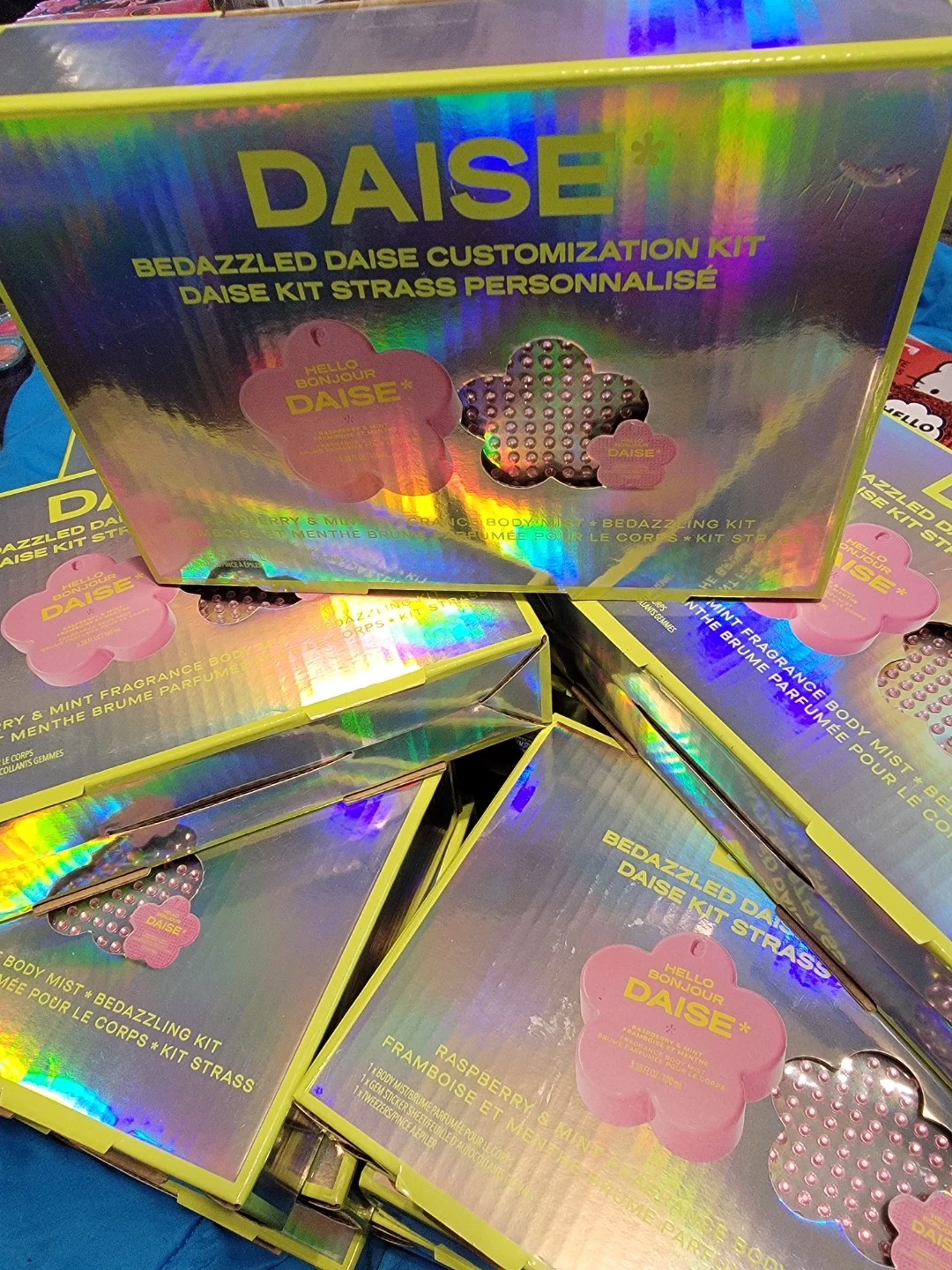 This is the Daisie Bedazzled Daisy Customization Kit. It includes a body mist and a bedazzling kit. Also included are gem stickers and tweezers.