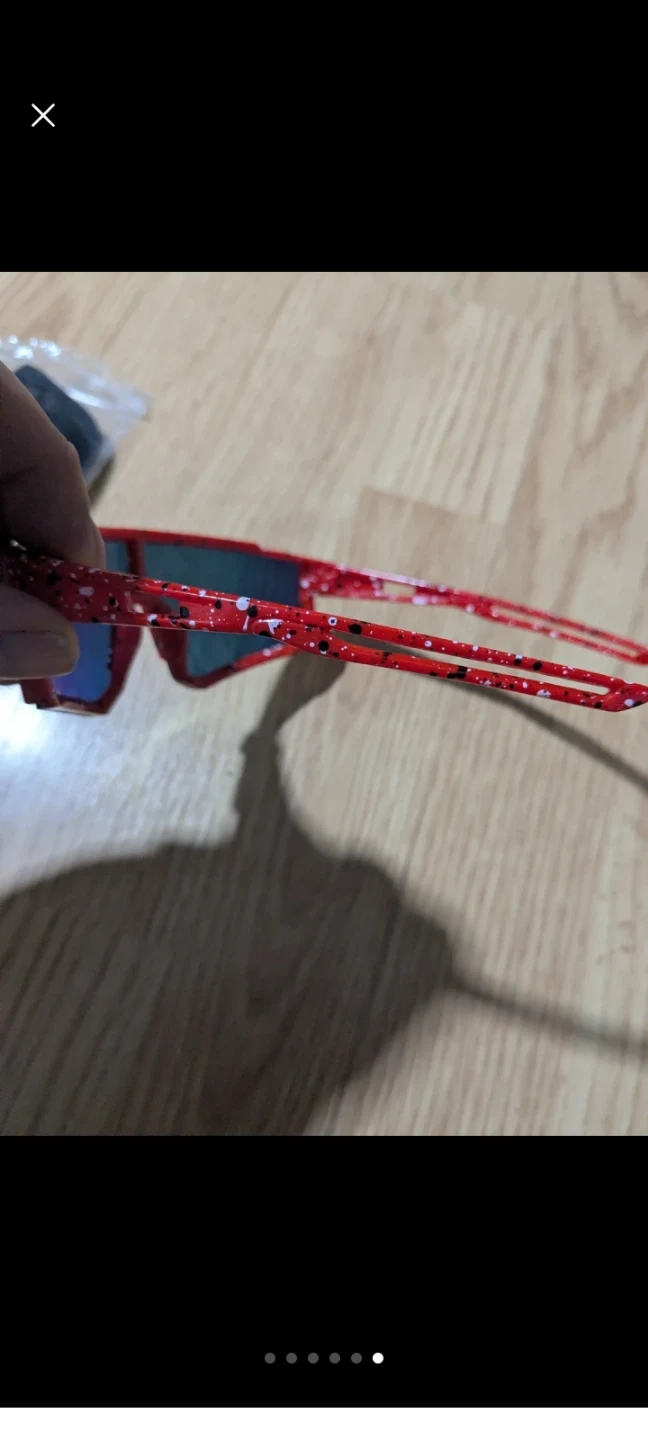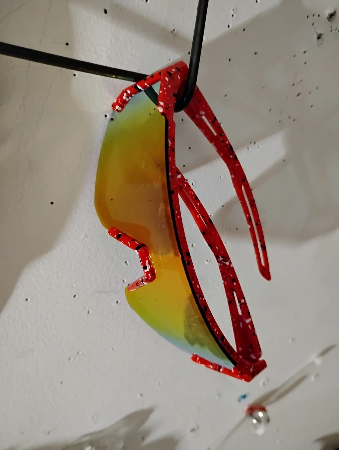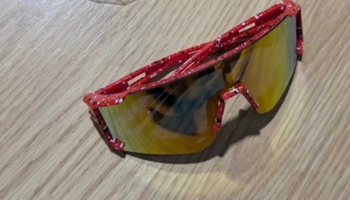 Red sport sunglasses with a speckled pattern. They feature a mirrored lens for clear vision. Lightweight and durable frames.