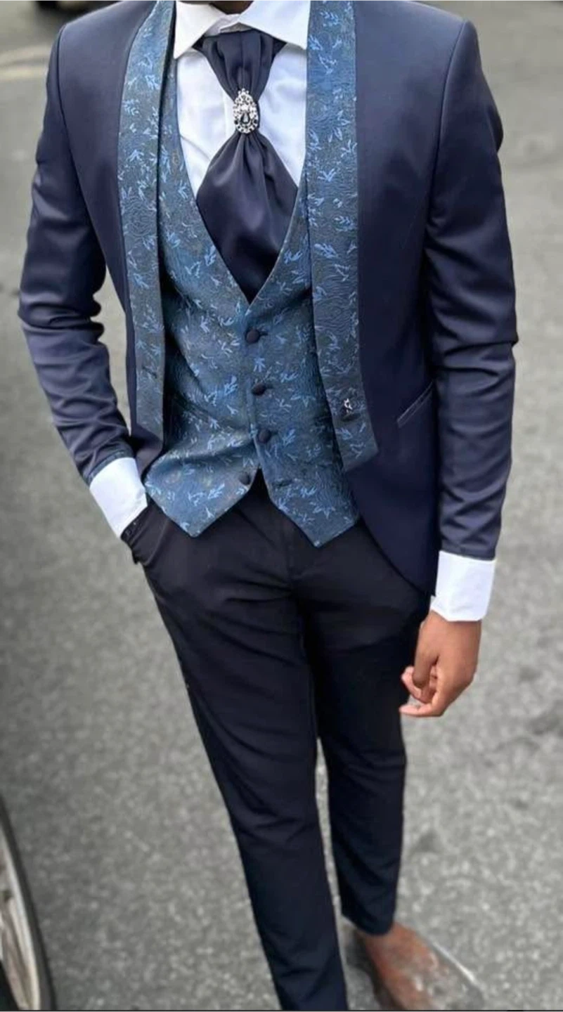 This is a sharp navy blue 3-piece suit. It features a patterned blue vest and matching tie. The suit has a classic fit.