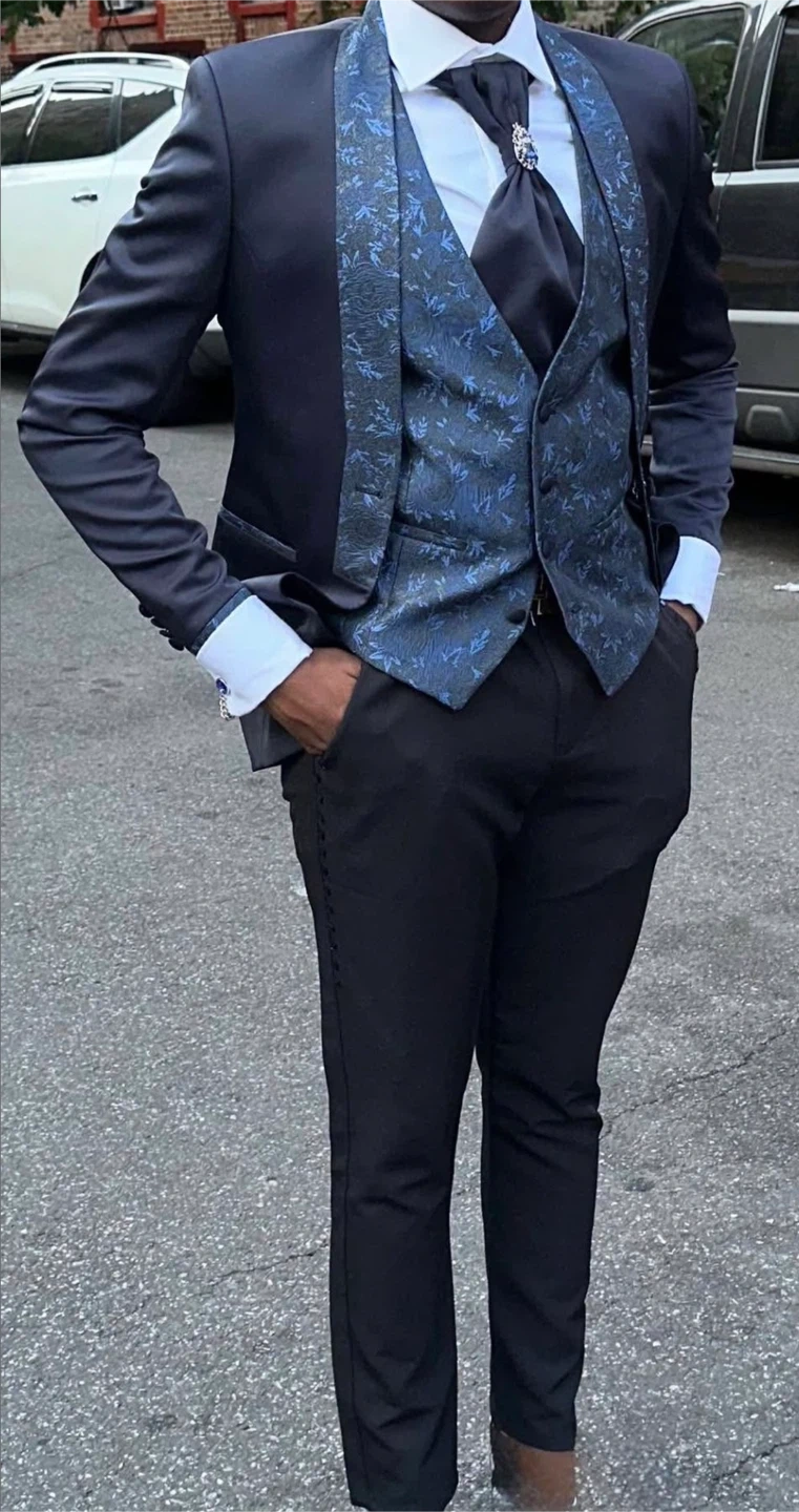 Men's Navy Blue 3-Piece Suit with Blue Floral Vest