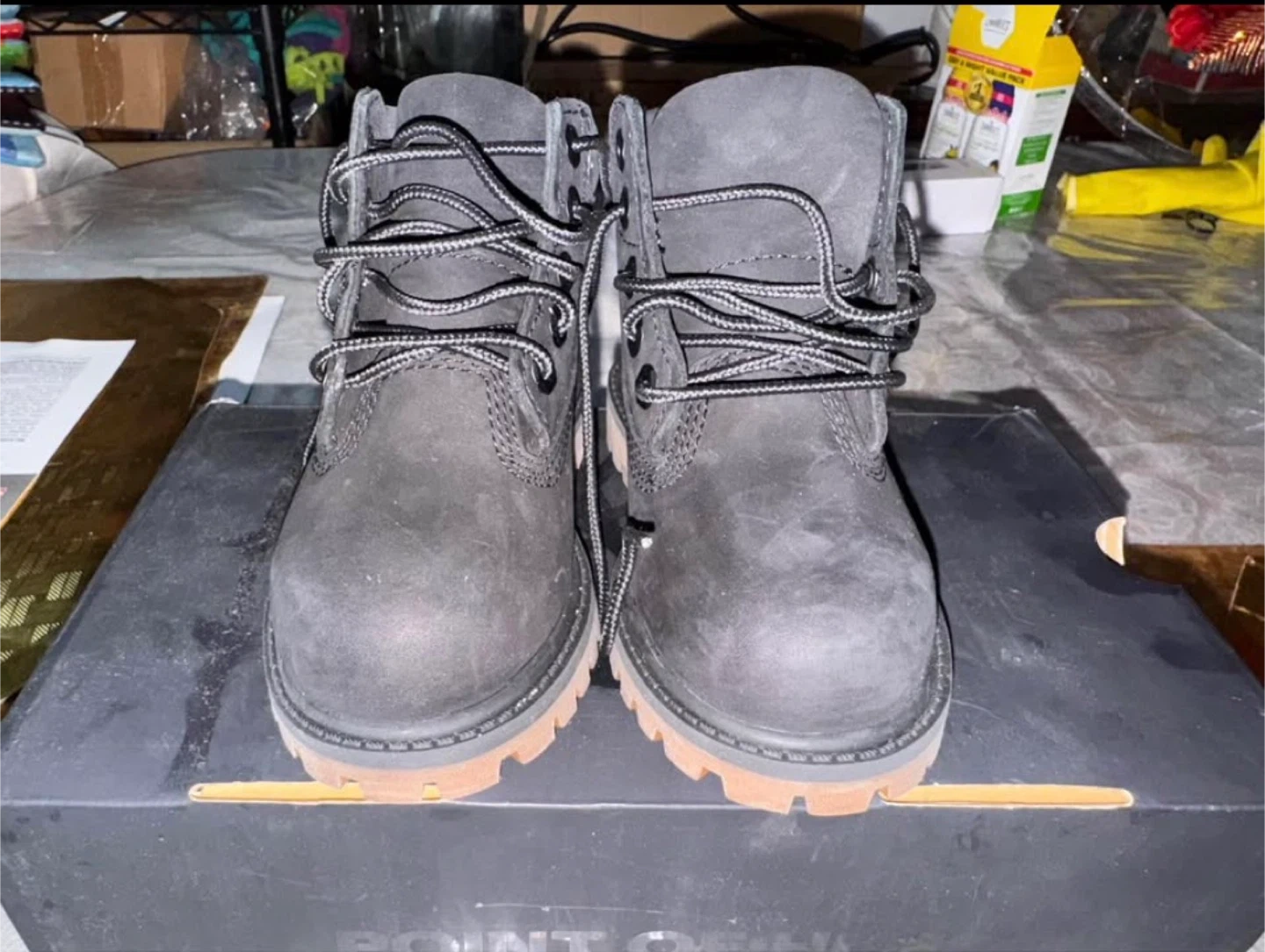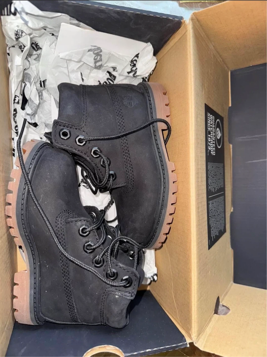 Timberland youth lace-up boots in black. These classic boots feature a durable construction and rubber sole. Comes with original box and packaging.